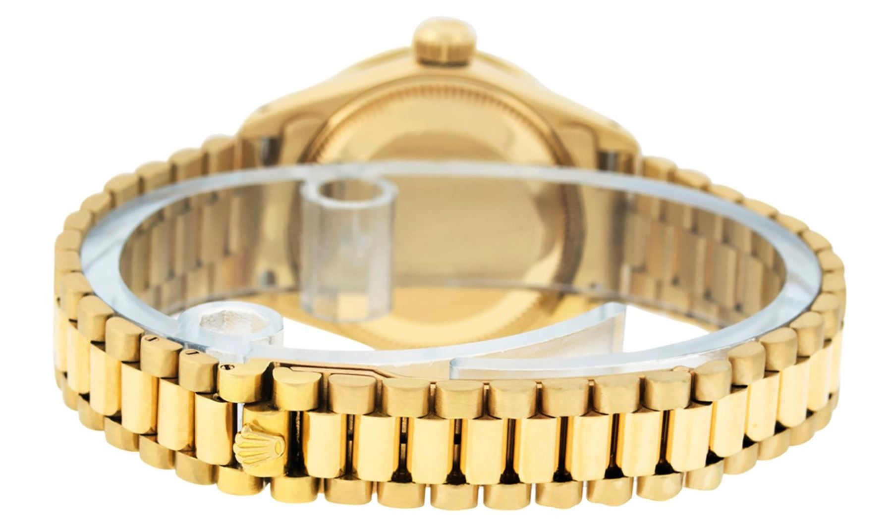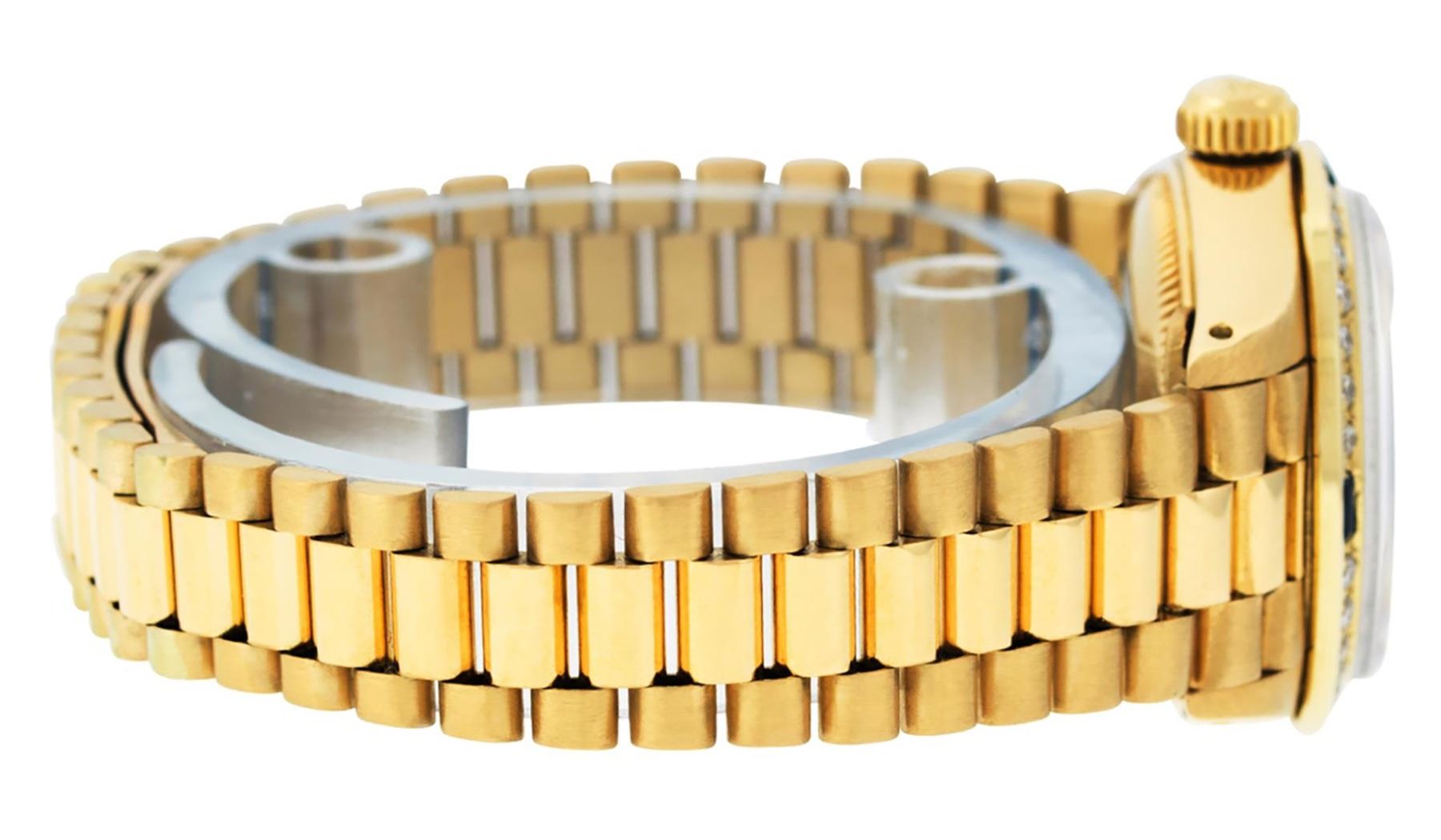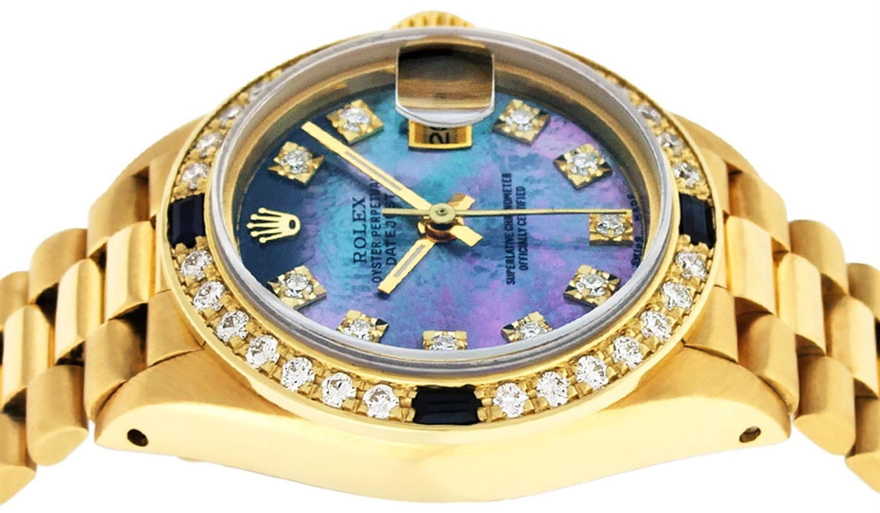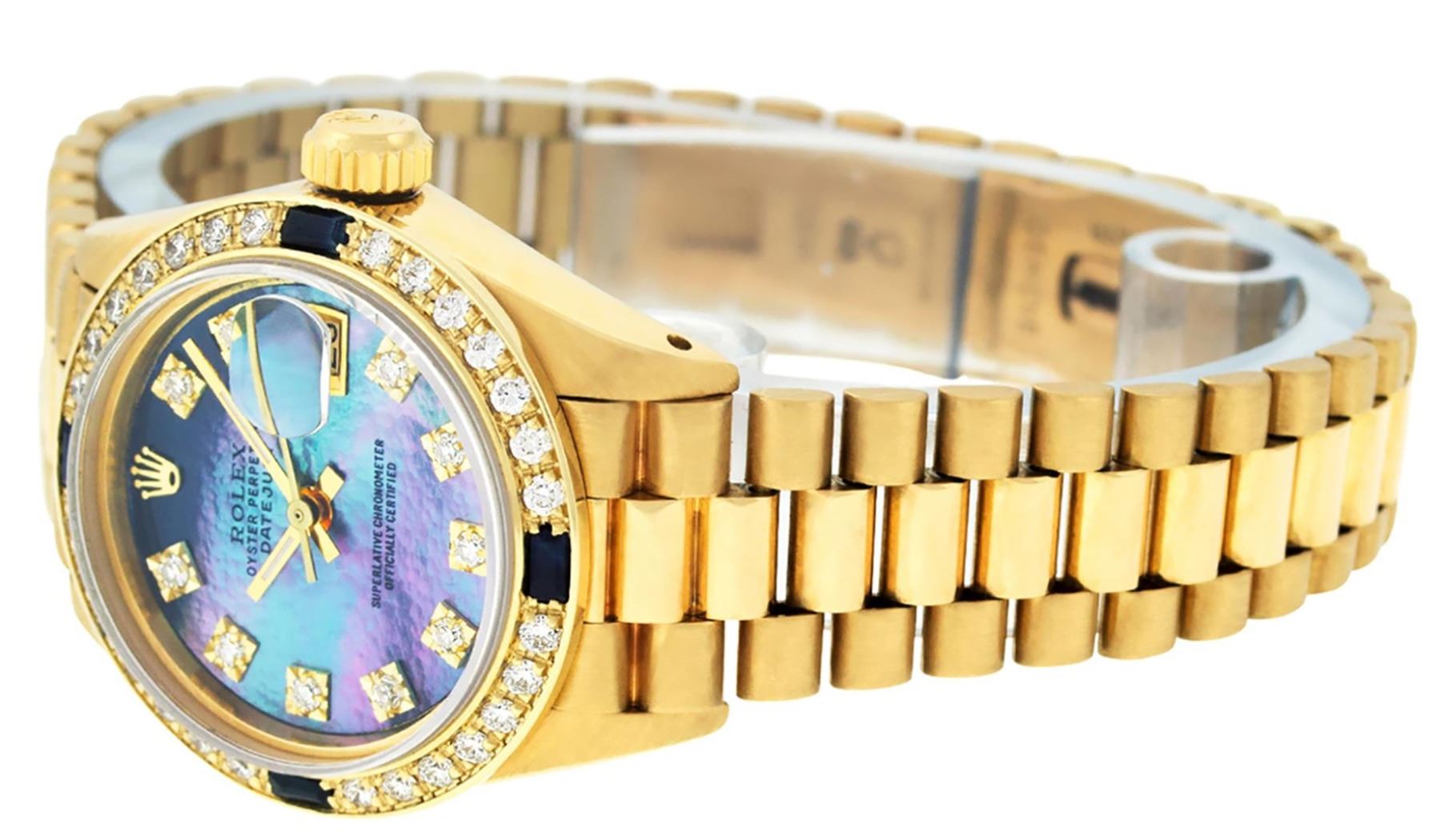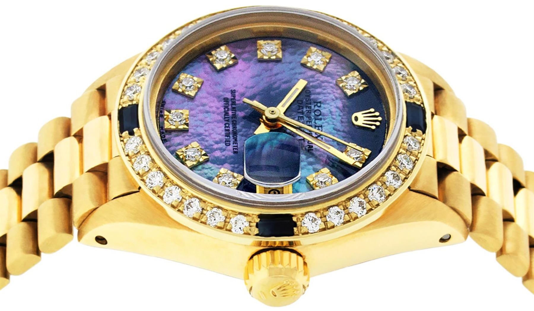 One Ladies 18K Yellow Gold Rolex President Polished, Serviced & Electronically Tested, Yellow Gold Case: 26mm, 18K Yellow Gold Crown, Custom Bezel: 18K Yellow Gold Sapphire Beadset Diamond Bezel, Diamond + Stone Count: 28 Diamonds + 4 Sapphires. Custom Crystal: New Sapphire With Date Window. Custom Hands: New Luminescent Hands. Rolex Movement: Automatic Winding Movement. Custom Dial: Tahitian Mother Of Pearl Diamond Dial, Stone Count: 10 Single Cut Diamonds In Dial. Date Window: 3 O'Clock Position, Model: Datejust President, Condition: G-6 Extra Fine. Rolex Bracelet: 18K Yellow Gold President With Hidden Clasp, Bright & Satin Polish. 6.0 Inch Length, Standard President Clasp (Hidden Clasp), With Rolex Logo. This Pre Owned Watch Has Been Serviced Time Tested And Is In Excellent Condition It Is Free Of All Scratches And Dents.