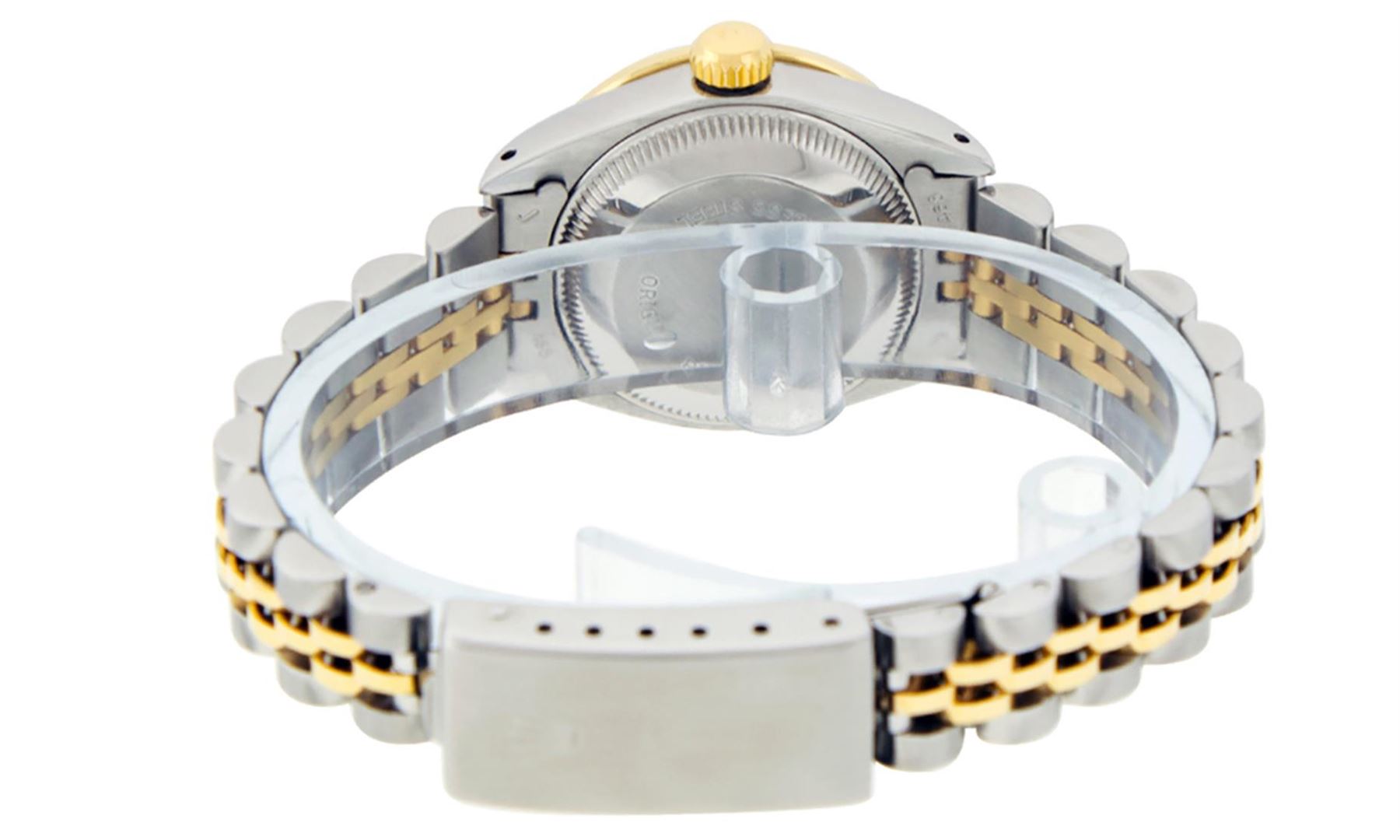 One Ladies 14K Two Tone Rolex Datejust Polished, Serviced & Electronically Tested, 14K Yellow Gold & Stainless Steel Case: 26mm, 14K Yellow Gold Crown, Diamond Lugs: 24 Diamonds On Lugs, Clarity: SI-VS, Color: G to H, Clarity SI-VS. Custom Bezel: New 18K Yellow Gold Beadset Diamond Bezel, Diamond Count: 32 Diamonds, Total Weight .70 Carat, Clarity: SI-VS, Color: G to H. Custom Crystal: New Synthetic Sapphire Cyclops Lens. Custom Hands: New Luminescent Hands. Movement: Automatic Winding Movement Caliber 2030. Custom Dial: Black With Diamond Hour Markers, Diamond Count: 10 Diamonds, Clarity: SI-VS, Color: G to H. Date Window: 3 O'Clock Position Date Display, Model: Datejust. Condition: G-6 Extra Fine. Bracelet: Two Tone 14K Yellow Gold & Stainless Steel Jubilee. Bright Polish. 6.0 Inch Length, Adjustable. Standard Clasp, With Rolex Logo. This Watch Has Been Serviced Time Tested And Is In Excellent Condition It Is Free Of All Scratches And Dents.