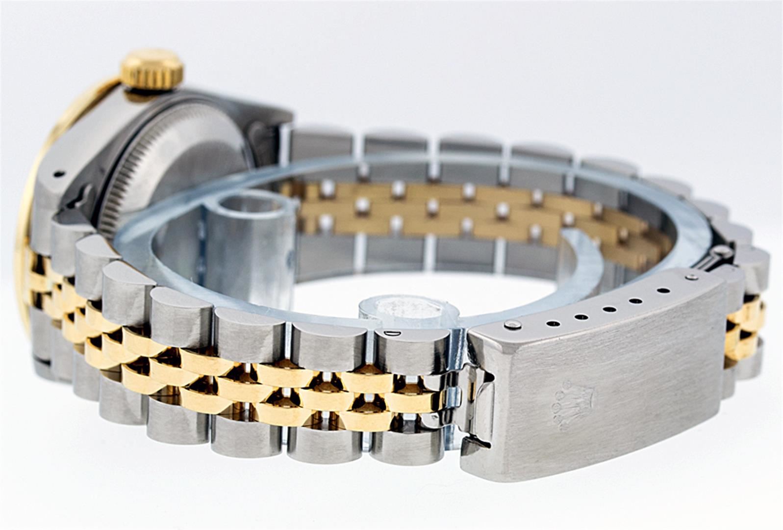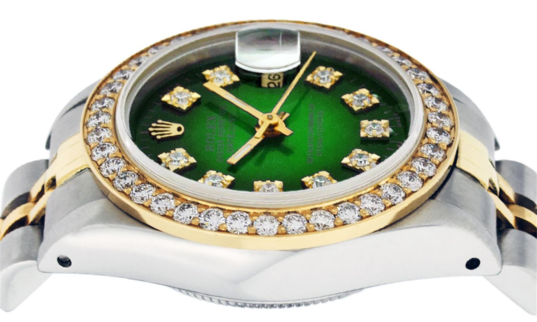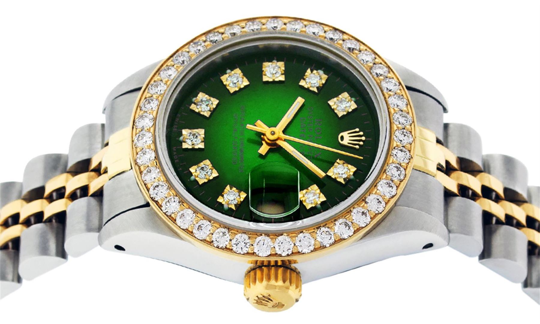 One Ladies 14K Two Tone Rolex Datejust Polished, Serviced & Electronically Tested, 14K Yellow Gold & Stainless Steel Case: 26mm, 14K Yellow Gold Crown, Custom Bezel: New 18K 1ctw Yellow Gold Beadset Diamond Bezel, Diamond Count: 42 Diamonds, Total Weight 1.00 Carat, Clarity: SI-VS, Color: G to H. Custom Crystal: New Synthetic Sapphire Cyclops Lens. Custom Hands: New Luminescent Hands. Movement: Automatic Winding Movement Caliber 2030. Custom Dial: Green Vignette VS Diamond Dial, Diamond Count: 10 Single Cut Diamonds in Dial, G To H In Color, VS Clarity. Date Window: 3 O'Clock Position Date Display, Model: Datejust, Condition: G-6 Extra Fine. Bracelet: Two Tone 14K Yellow Gold & Stainless Steel Jubilee. Bright Polish. 6.0 Inch Length, Adjustable. Standard Clasp, With Rolex Logo. This Watch Has Been Serviced Time Tested And Is In Excellent Condition It Is Free Of All Scratches And Dents.