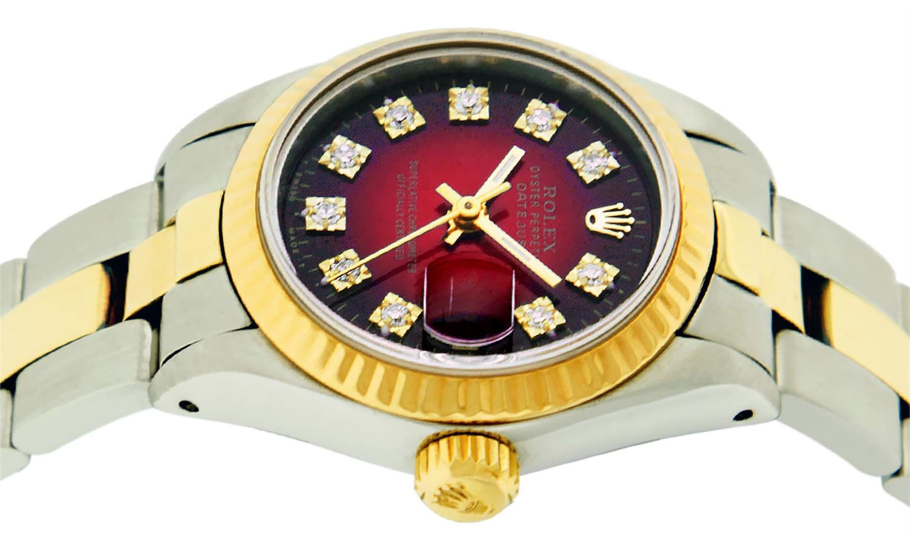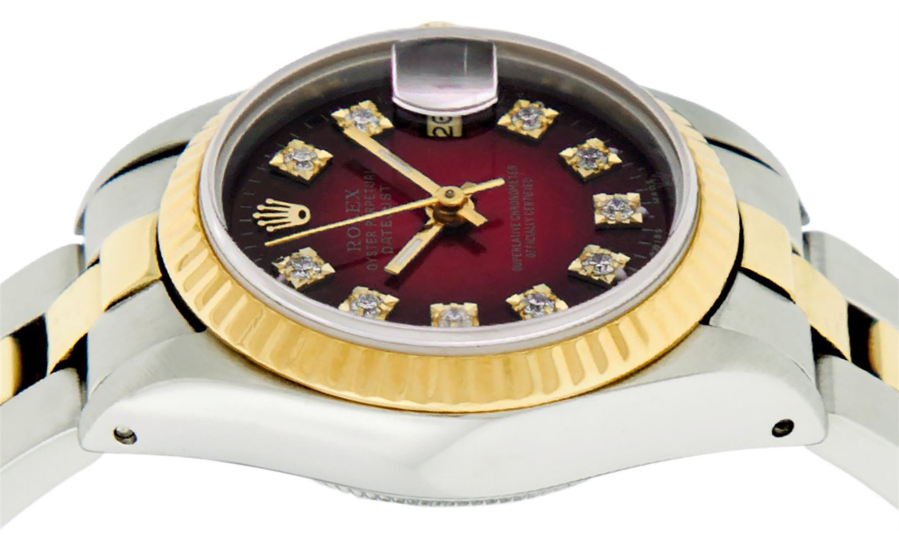 One Ladies 14K Two Tone Rolex Datejust Polished, Serviced & Electronically Tested, 14K Yellow Gold & Stainless Steel Case: 26mm, 14K Yellow Gold Crown, Bezel: 14K Yellow Gold Fluted Bezel. Custom Crystal: New Acrylic Cyclops Lens. Custom Hands: New Luminescent Hands. Movement: Automatic Winding Movement Caliber 2030. Custom Dial: Red Vignette With Diamond Hour Markers Dash Track & Lumi Dots, Diamond Count: 10 Single Cut Diamonds, Color: G to H, Clarity: VS. Date Window: 3 O'Clock Position Date Display, Model: Datejust. Condition: G-6 Extra Fine. Bracelet: Two Tone 14K Yellow Gold & Stainless Steel Oyster Band. Bright Polish. 6.0 Inch Length, Adjustable. Standard Clasp, With Rolex Logo. This Watch Has Been Serviced Time Tested And Is In Excellent Condition It Is Free Of All Scratches And Dents.