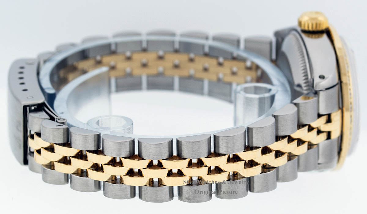 One Ladies 14K Two Tone Rolex Datejust Polished, Serviced & Electronically Tested, 14K Yellow Gold & Stainless Steel Case: 26mm, 14K Yellow Gold Crown, Custom Bezel: 18K Yellow Gold Beadset Diamond Bezel, Diamond Count: 32 Diamonds Total Weight .70 Carat, Clarity: Si-VS, Color: G to H. Custom Crystal: Synthetic Sapphire Cyclops Lens. Custom Hands: New Luminescent Hands. Movement: Automatic Winding Movement Caliber 2030. Custom Dial: Silver Dial Set With Diamond Hour Markers, 10 Diamond in Dial G To H In Color, Si-VS Clarity. Date Window: 3 O'Clock Position Date Display, Model: Datejust. Condition: G-6 Extra Fine. Bracelet: Two Tone 14K Yellow Gold & Stainless Steel Jubilee. Bright Polish. 6.0 Inch Length, Adjustable. Standard Clasp, With Rolex Logo. This Watch Has Been Serviced Time Tested And Is In Excellent Condition It Is Free Of All Scratches And Dents.