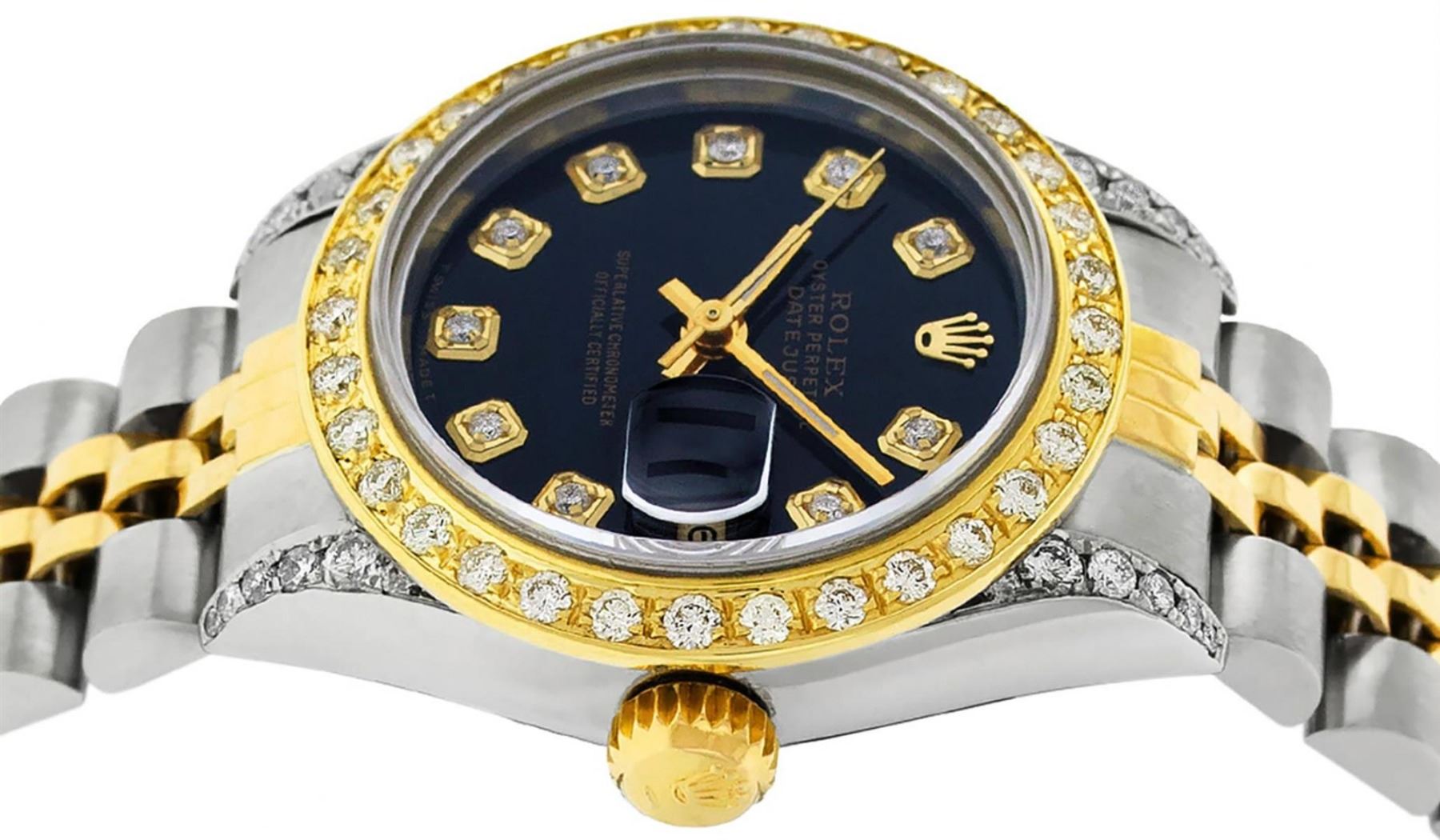 One Ladies Quickset 18K Two Tone Rolex Datejust Polished, Serviced & Electronically Tested, 18K Yellow Gold & Stainless Steel Case: 26mm, 18K Yellow Gold Crown, Diamond Lugs: 24 Diamonds On Lugs, Clarity: SI-VS, Color: G to H, Clarity SI-VS. Custom Bezel: New 18K Yellow Gold Beadset Diamond Bezel, Diamond Count: 32 Diamonds On Bezel, Total Weight .70 Carat, Clarity: SI-VS, Color: G to H. Custom Crystal: New Scratch Resistant Synthetic Sapphire Cyclops Lens. Custom Hands: New Luminescent Hands. Movement: Automatic Winding Movement. Custom Dial: Refinished Black With Single Cut Diamond Hour Markers, Diamond Count: 10 Diamonds On Dial, Clarity: SI-VS, Color: G to H. Date Window: 3 O'Clock Position Date Display, Model: Quickset Datejust. Condition: G-6 Extra Fine. Bracelet: Two Tone 18K Yellow Gold & Stainless Steel Jubilee Band. Bright Polish. 6.0 Inch Length, Adjustable. Standard Clasp, With Rolex Logo. This Watch Has Been Serviced Time Tested And Is In Excellent Condition It Is Free Of All Scratches And Dents.