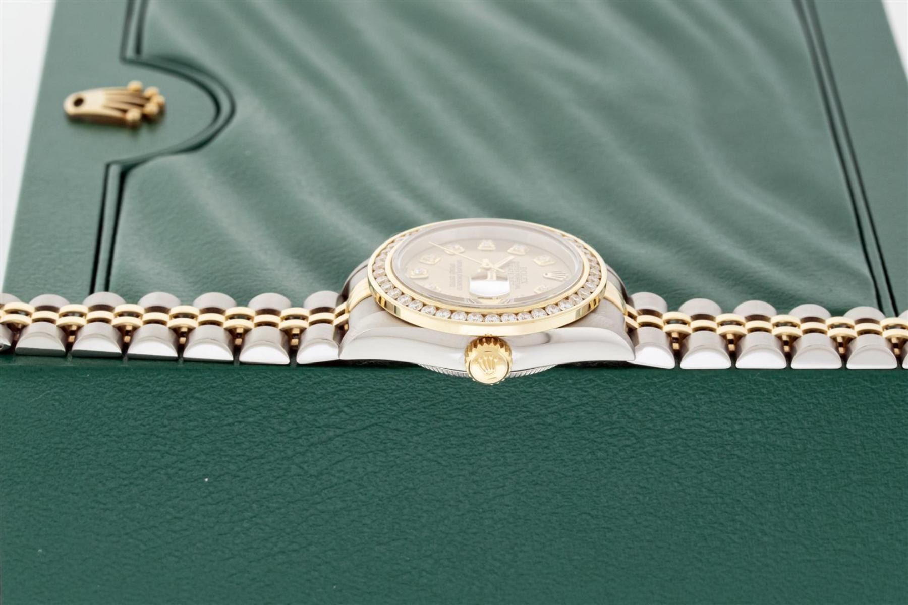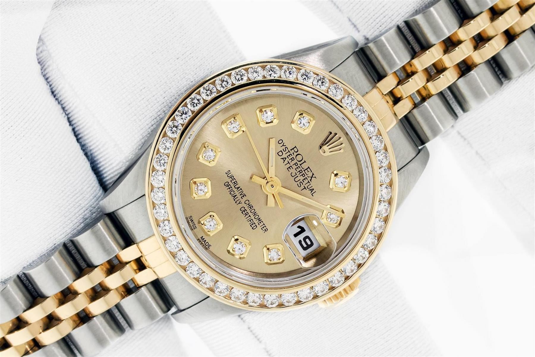 One Ladies Quickset 18K Two Tone Rolex Datejust Polished, Serviced & Electronically Tested, 18K Yellow Gold & Stainless Steel Case: 26mm, 18K Yellow Gold Crown. Custom Bezel: New 18K Yellow Gold Beadset Diamond Bezel, Diamond Count: 44 Diamonds On Bezel,