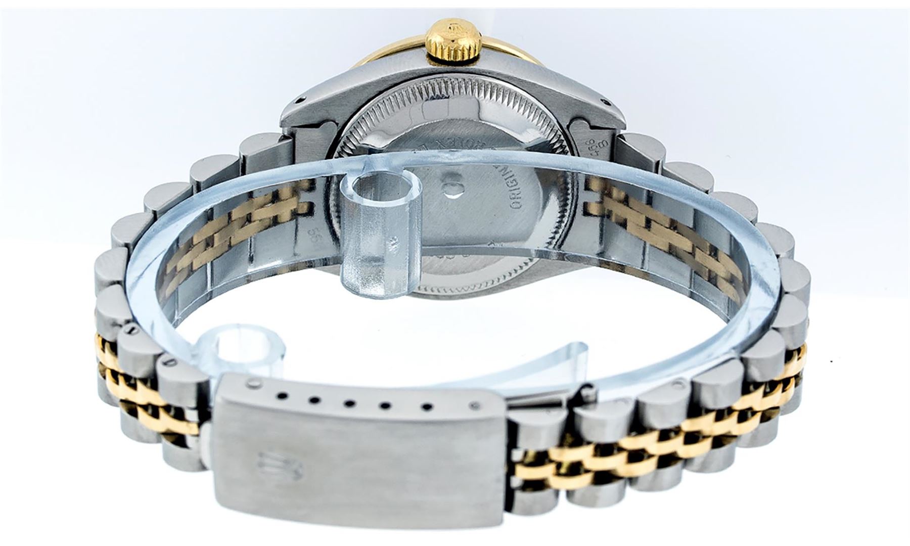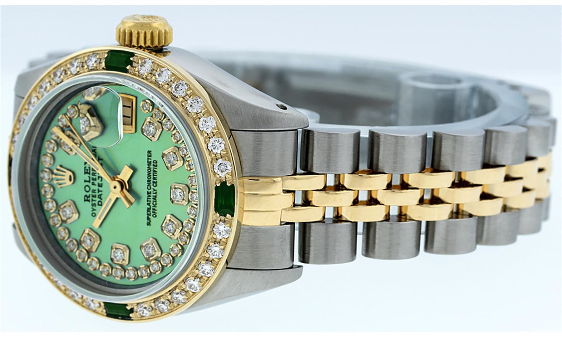 One Ladies Two Tone Yellow Gold And Stainless Steel Rolex Datejust Polished, Serviced & Electronically Tested, Yellow Gold & Stainless Steel Case: 26mm, Yellow Gold Crown, Custom Bezel: New 18K New Yellow Gold Beadset + Emerald Diamond Bezel, Stone Count: 28 Diamonds + 4 Emeralds In Bezel, Total Weight .70 Carat, Clarity: SI-VS, Color: G to H. Custom Crystal: New Scratch Resistant Synthetic Sapphire Cyclops Lens. Custom Hands: New Luminescent Hands. Movement: Automatic Winding Movement. Custom Dial: Green String With Diamond Hour Markers, Diamond Count: 43 Diamonds On Dial, Clarity: SI-VS, Color: VS2. Date Window: 3 O'Clock Position Date Display, Model: Datejust. Condition: G-6 Extra Fine. Bracelet: Two Tone Yellow Gold & Stainless Steel Jubilee Band. Bright Polish. 6.0 Inch Length, Adjustable. Standard Clasp, With Rolex Logo. This Watch Has Been Serviced Time Tested And Is In Excellent Condition It Is Free Of All Scratches And Dents.