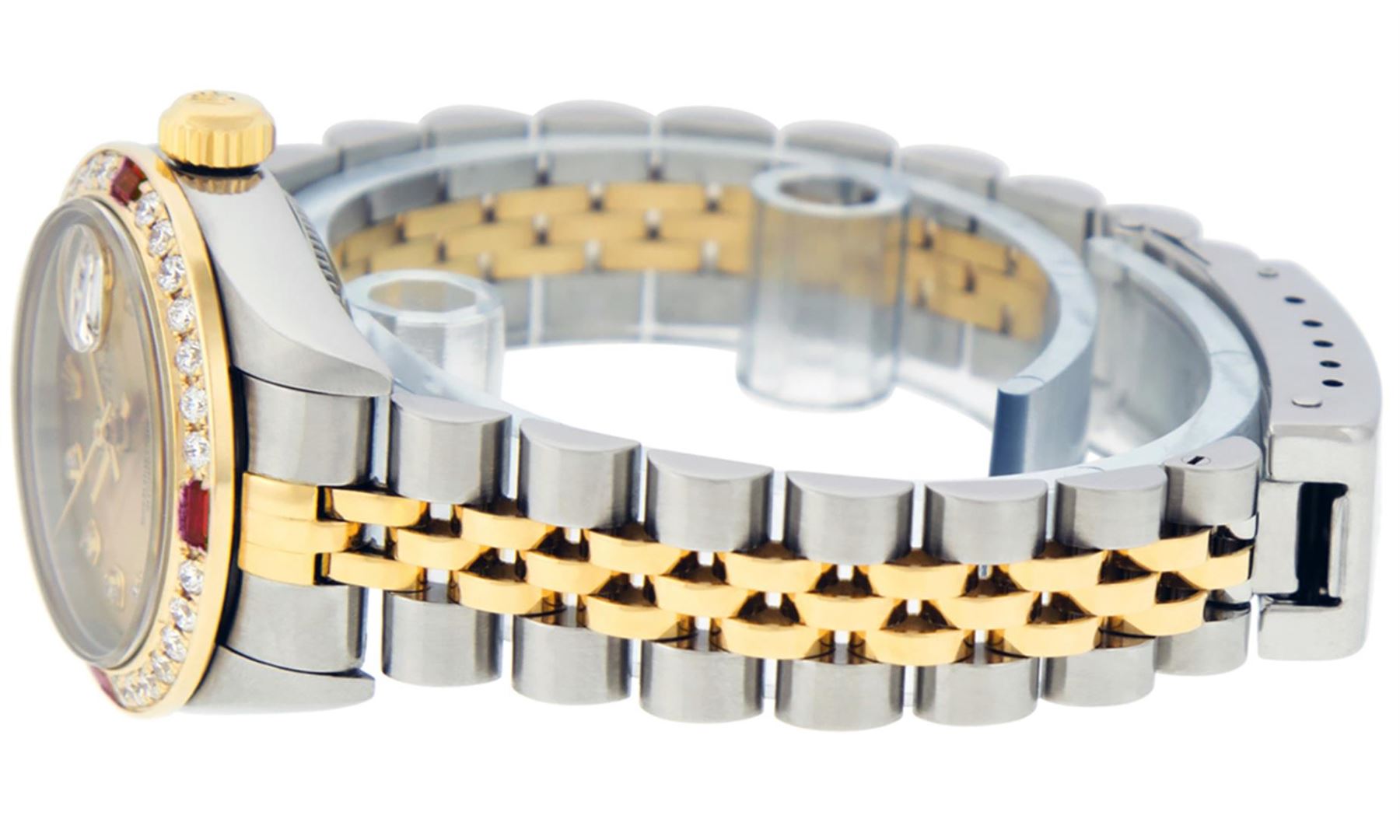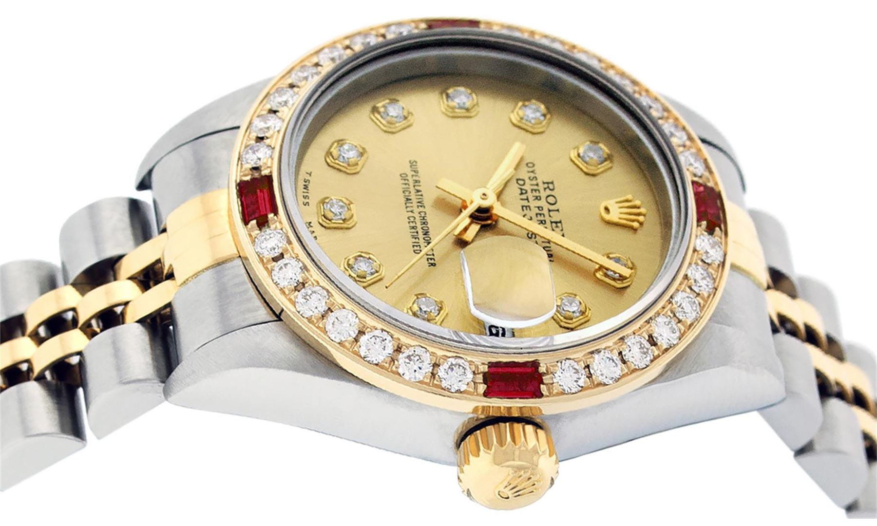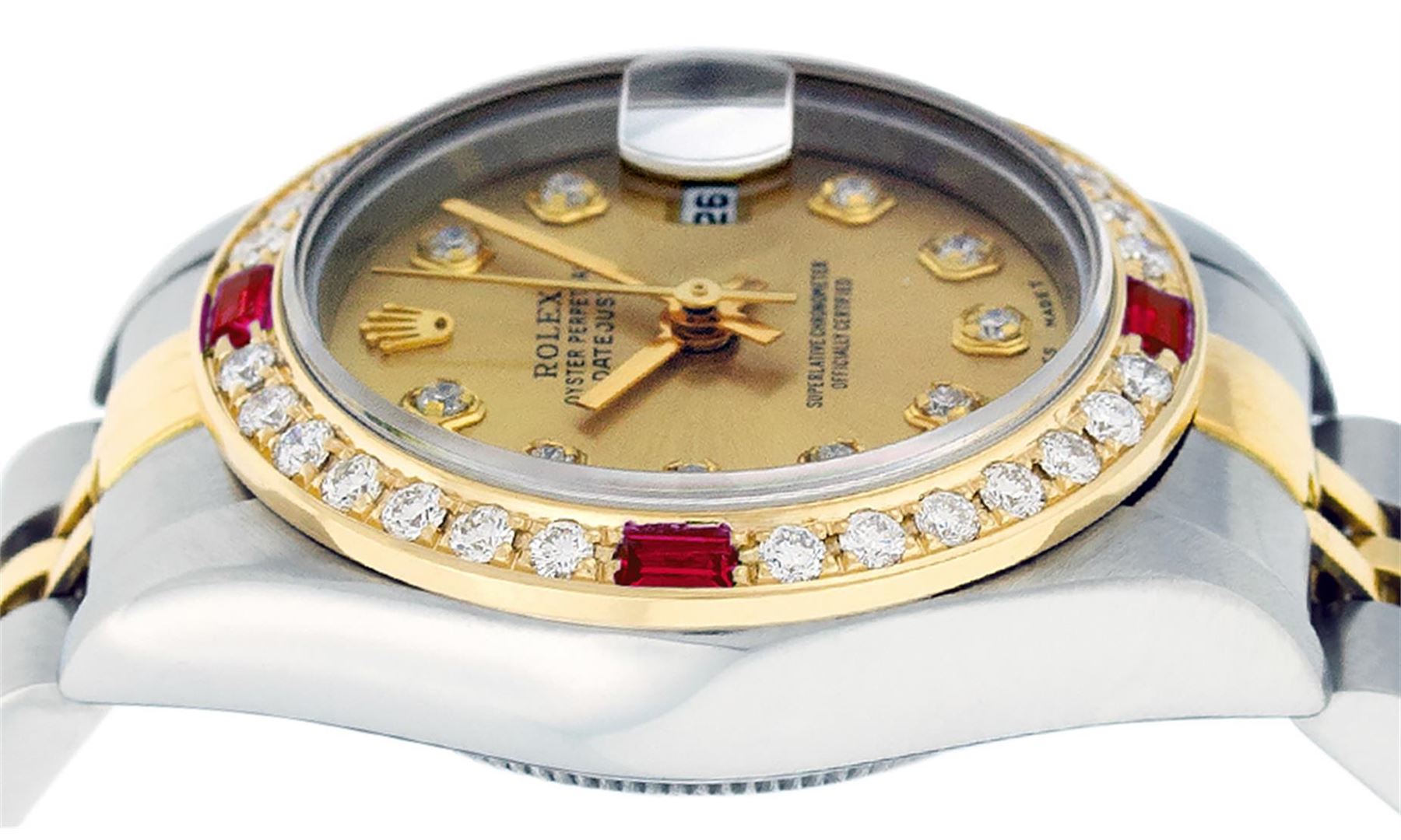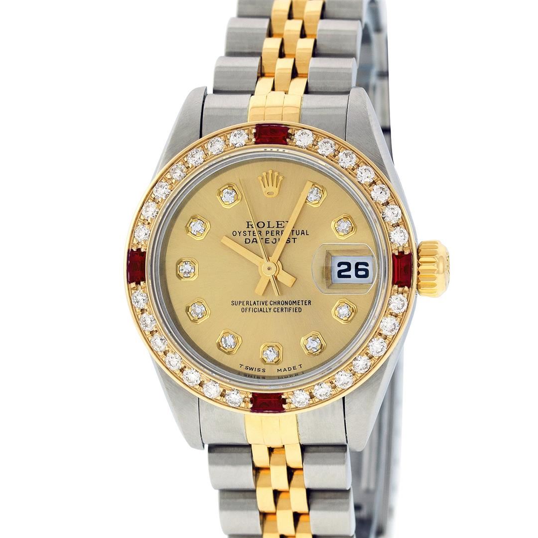 Rolex Ladies Pre Owned 18K Two Tone & Stainless Steel Rolex Datejust Polished, Serviced & Electronically Tested, 18K Yellow Gold & Stainless Steel Case: 26mm, 18K Yellow Gold Crown, Custom Bezel: New 18K Yellow Gold Ruby Beadset Diamond Bezel, Diamond + G