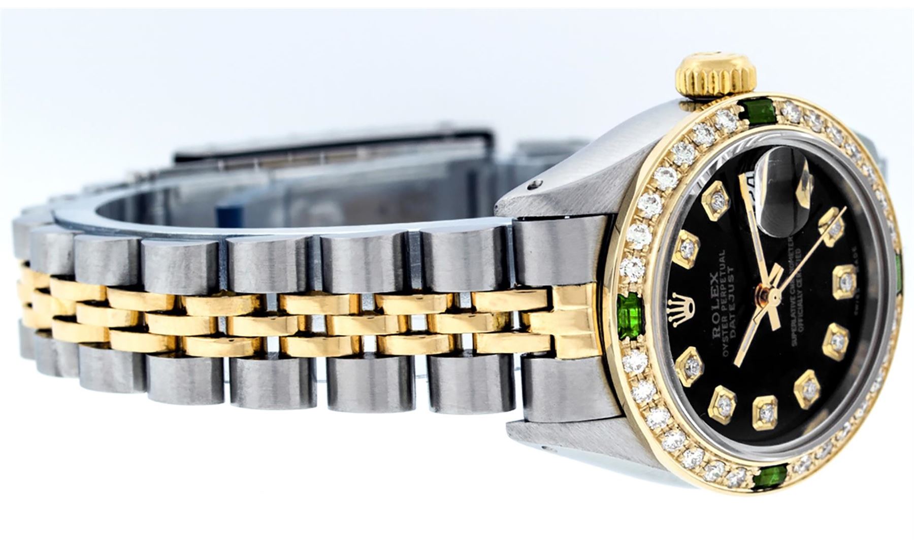 One Ladies Pre Owned Two Tone Rolex Datejust Polished, Serviced & Electronically Tested, Yellow Gold & Stainless Steel Case: 26mm, Yellow Gold Crown, Custom Bezel: New 18K Yellow Gold Emerald Beadset Diamond Bezel, Diamond + Gem Count: 28 Diamonds + 4 Eme