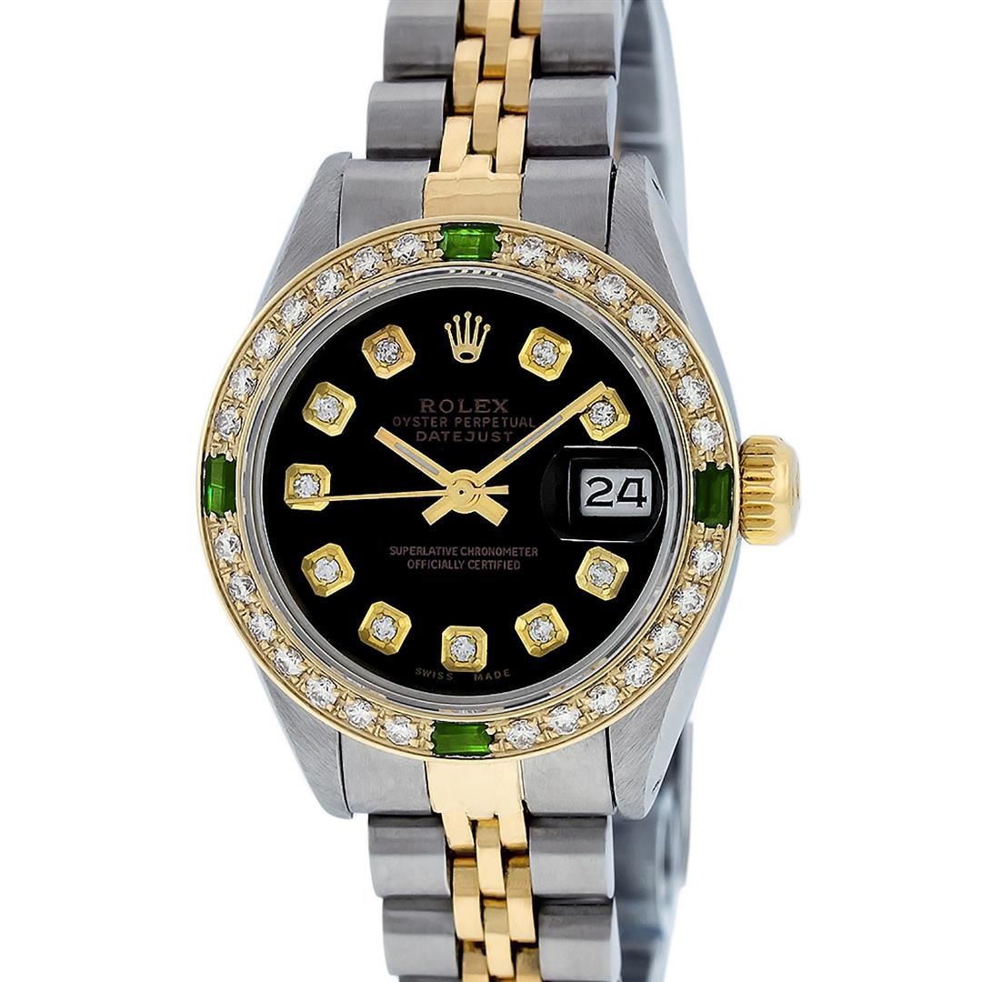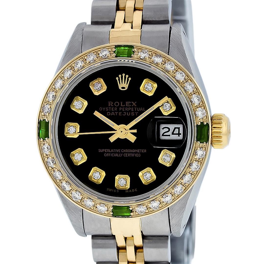One Ladies Pre Owned Two Tone Rolex Datejust Polished, Serviced & Electronically Tested, Yellow Gold & Stainless Steel Case: 26mm, Yellow Gold Crown, Custom Bezel: New 18K Yellow Gold Emerald Beadset Diamond Bezel, Diamond + Gem Count: 28 Diamonds + 4 Emeralds, Clarity: SI-VS, Color: G to H. Custom Crystal: New Sapphire With Date Window. Custom Hands: New Luminescent Hands. Rolex Movement: Automatic Winding Movement. Custom Dial: Refinished To Black Diamond With Custom Added Diamond Hour Markers. Date Window: 3 Oclock Position Date Display, Model: Datejust, Condition: G-6 Extra Fine. Rolex Bracelet: Two Tone Yellow Gold & Stainless Steel Jubilee Band. Bright Polish. 6.0 Inch Length, Adjustable. Standard Clasp, With Rolex Logo. This Watch Has Been Serviced Time Tested And Is In Excellent Condition It Is Free Of All Scratches And Dents.