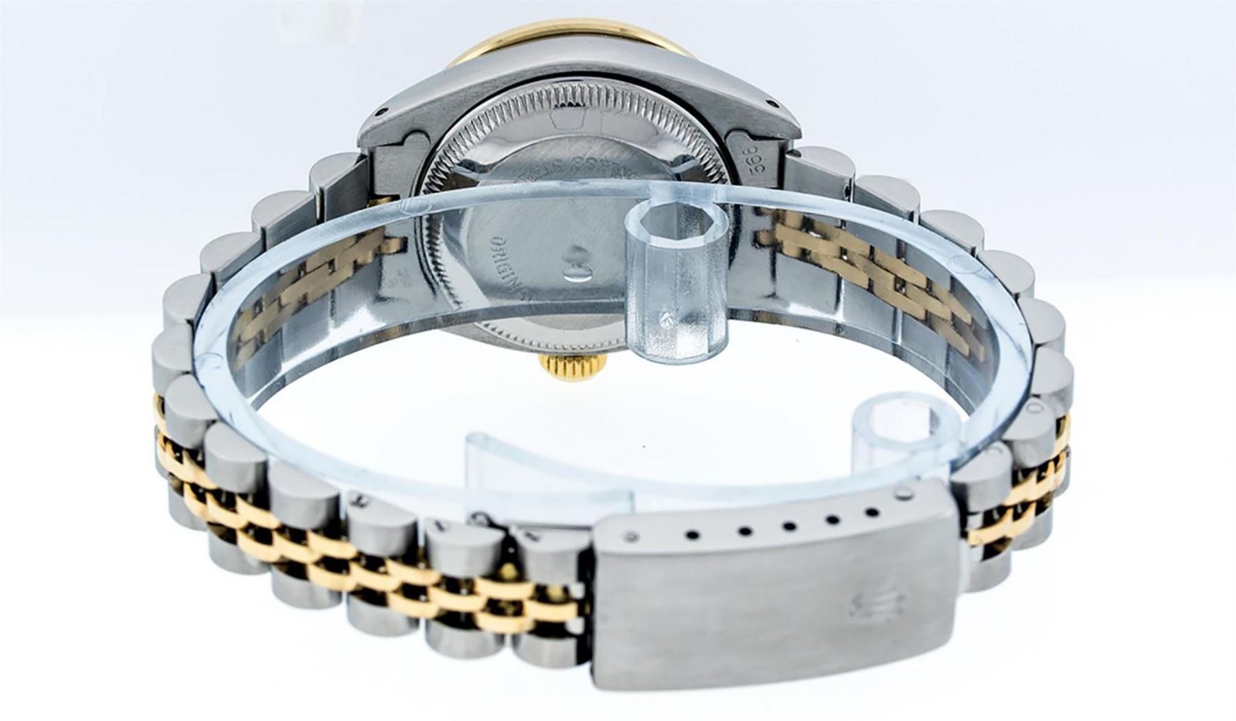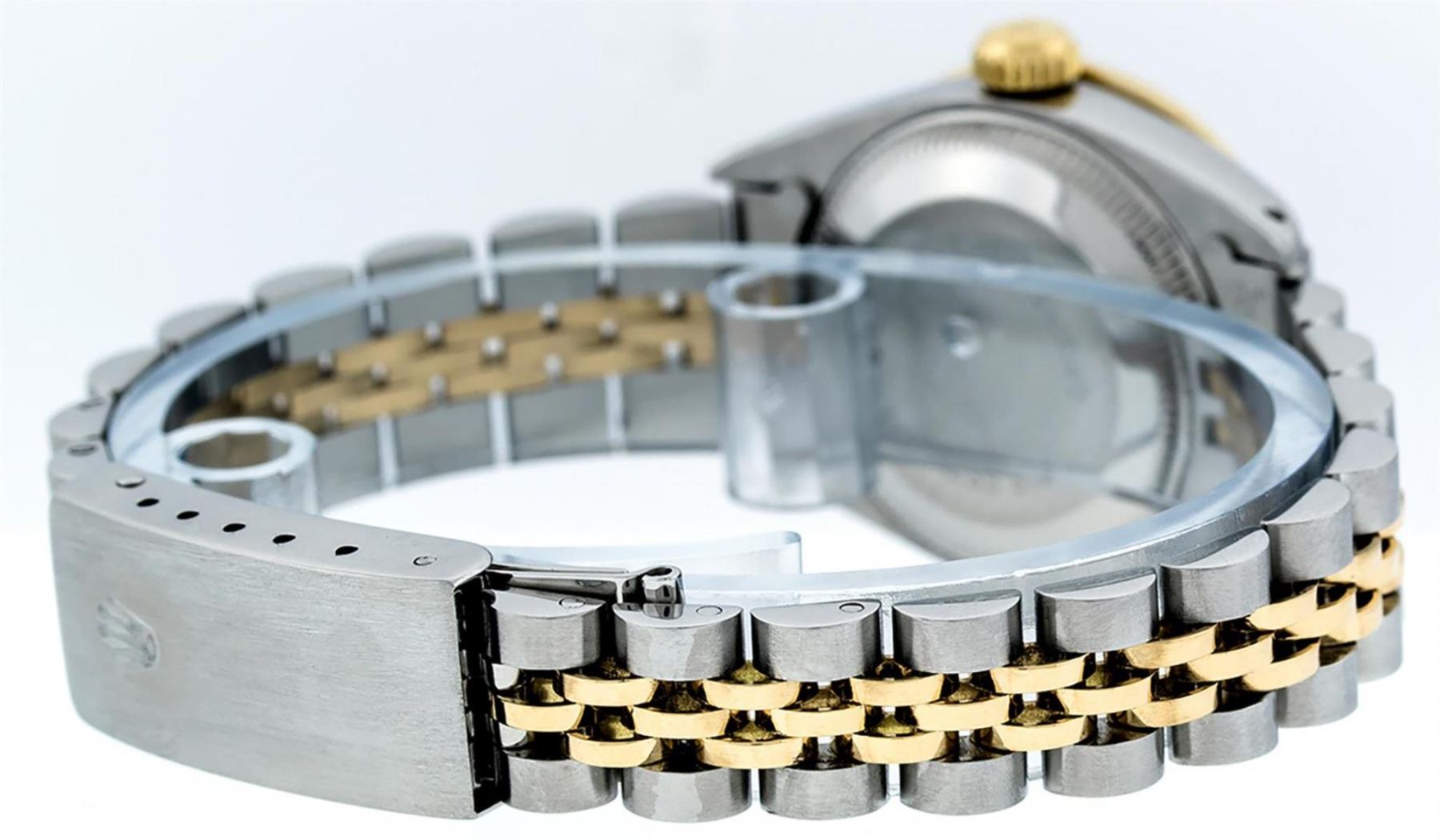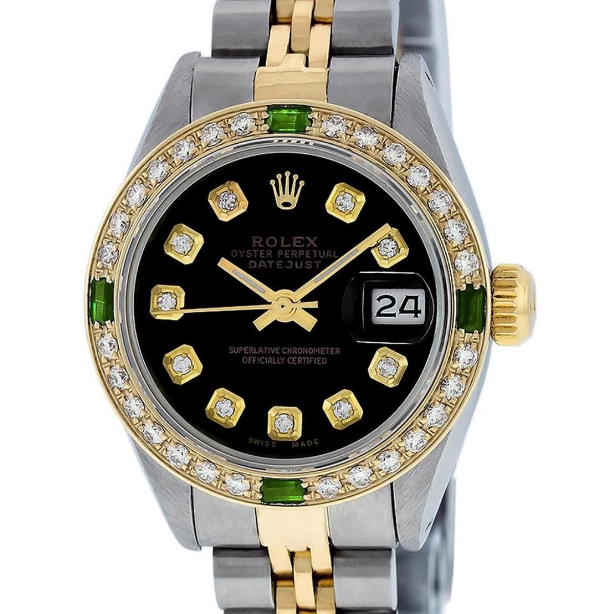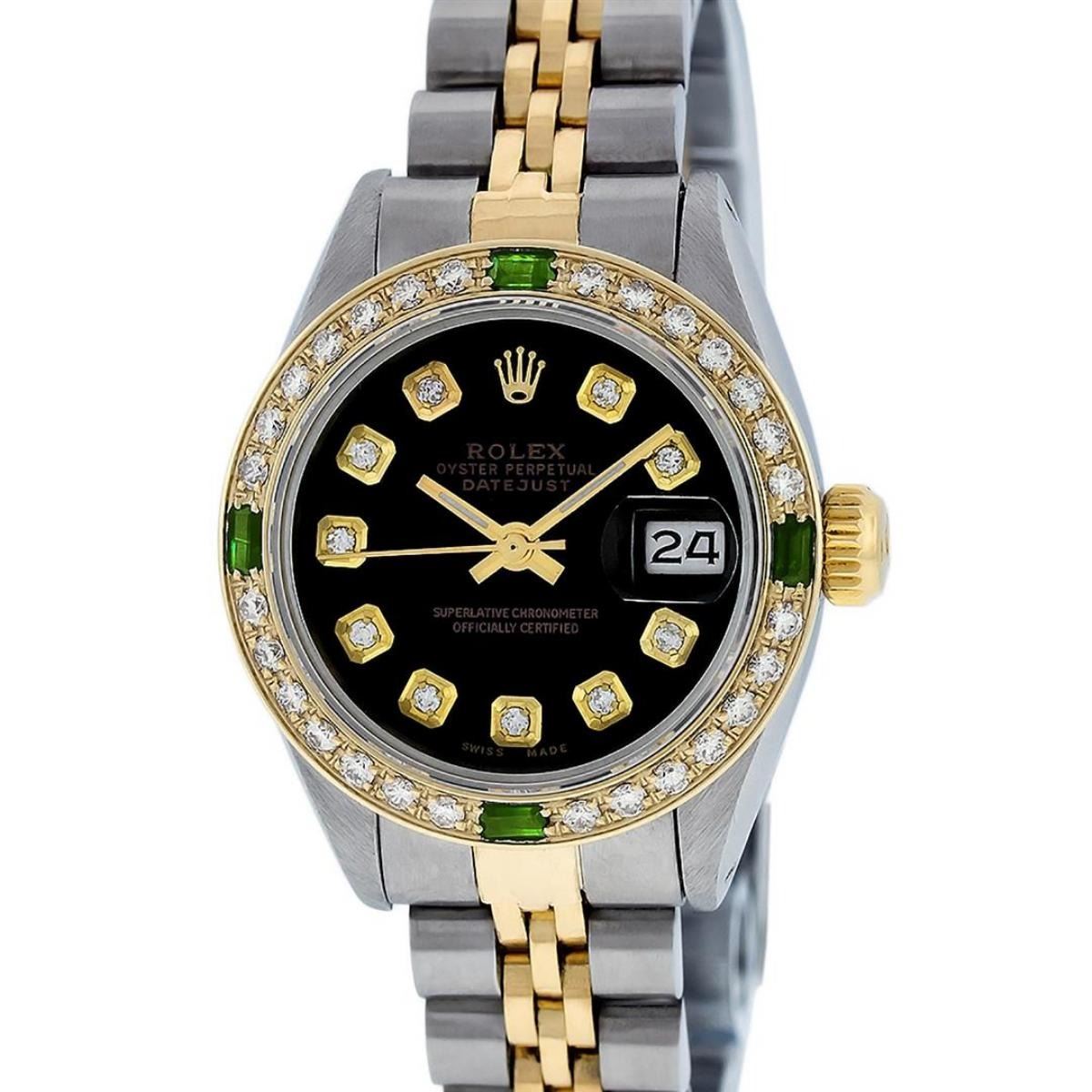 One Ladies Two Tone Rolex Datejust Polished, Serviced & Electronically Tested, Yellow Gold & Stainless Steel Case: 26mm, Yellow Gold Crown, Custom Bezel: New 18K Yellow Gold Emerald Beadset Diamond Bezel, Diamond + Gem Count: 28 Diamonds + 4 Emeralds Total Weight .70 Carat, Clarity: SI-VS, Color: G to H. Custom Crystal: New Scratch Resistant Synthetic Sapphire Cyclops Lens. Custom Hands: New Luminescent Hands. Movement: Automatic Winding Movement. Custom Dial: Black Diamond Dial. Date Window: 3 O'Clock Position Date Display, Model: Datejust, Condition: G-6 Extra Fine. Bracelet: Two Tone Yellow Gold & Stainless Steel Jubilee Band. Bright Polish. 6.0 Inch Length, Adjustable. Standard Clasp, With Rolex Logo. This Watch Has Been Serviced Time Tested And Is In Excellent Condition It Is Free Of All Scratches And Dents.