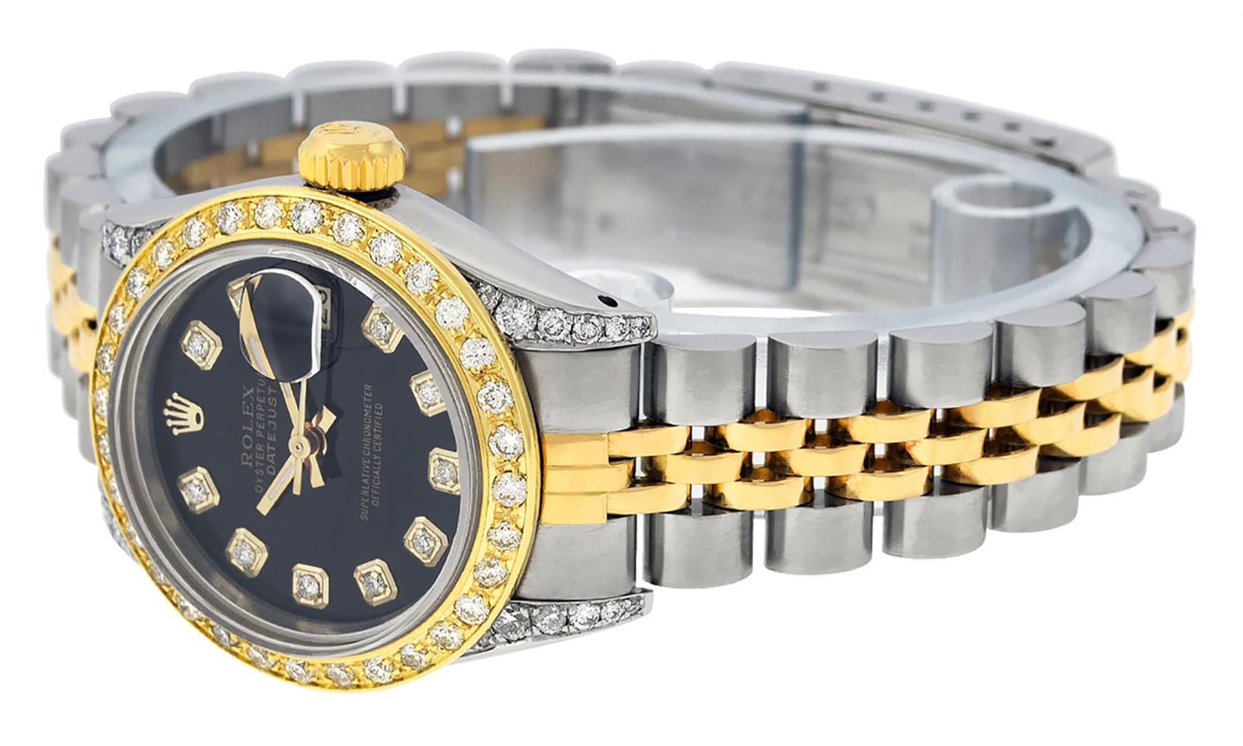 One Ladies Two Tone Rolex Datejust Polished, Serviced & Electronically Tested, Yellow Gold & Stainless Steel Case: 26mm, Yellow Gold Crown, Custom Diamond Lugs: 24 Diamonds On Lugs, Clarity: SI-VS, Color: G to H, Clarity SI-VS. Custom Bezel: New 18K Yellow Gold Beadset Diamond Bezel, Diamond Count: 32 Diamonds, Total Weight .70 Carat, Clarity: SI-VS, Color: G to H. Custom Crystal: New Synthetic Sapphire Cyclops Lens. Custom Hands: New Luminescent Hands. Movement: Automatic Winding Movement. Custom Dial: Black With Diamond Hour Markers, Diamond Count: 10 Diamonds, Clarity: SI-VS, Color: G to H. Date Window: 3 O'Clock Position Date Display, Model: Datejust. Condition: G-6 Extra Fine. Bracelet: Two Tone Yellow Gold & Stainless Steel Jubilee Band. Bright Polish. 6.0 Inch Length, Adjustable. Standard Clasp, With Rolex Logo. This Watch Has Been Serviced Time Tested And Is In Excellent Condition It Is Free Of All Scratches And Dents.