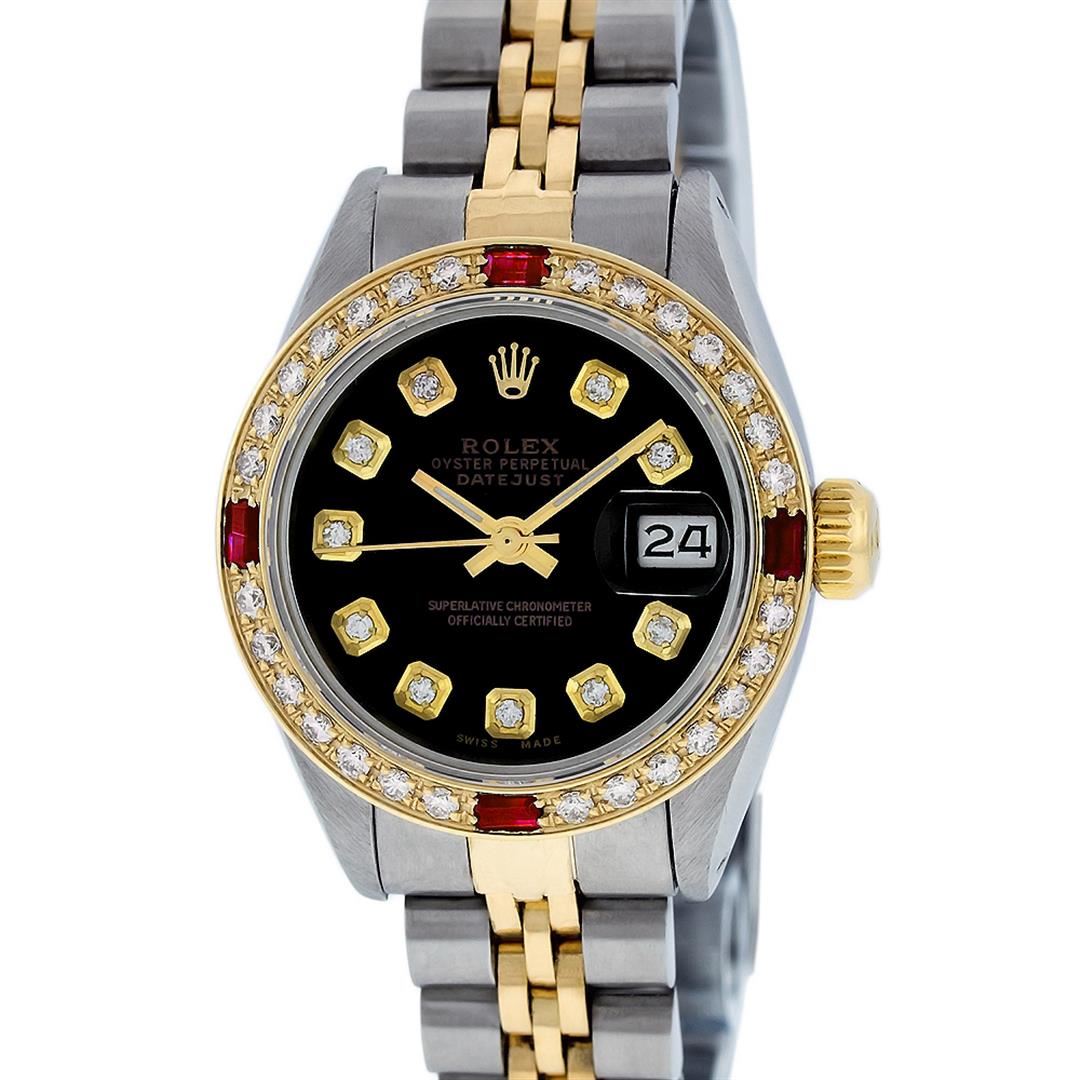 One Ladies Pre Owned Two Tone Rolex Datejust Polished, Serviced & Electronically Tested, Yellow Gold & Stainless Steel Case: 26mm, Yellow Gold Crown, Custom Bezel: New 18K Yellow Gold Ruby Beadset Diamond Bezel, Diamond + Gem Count: 28 Diamonds + 4 Rubies