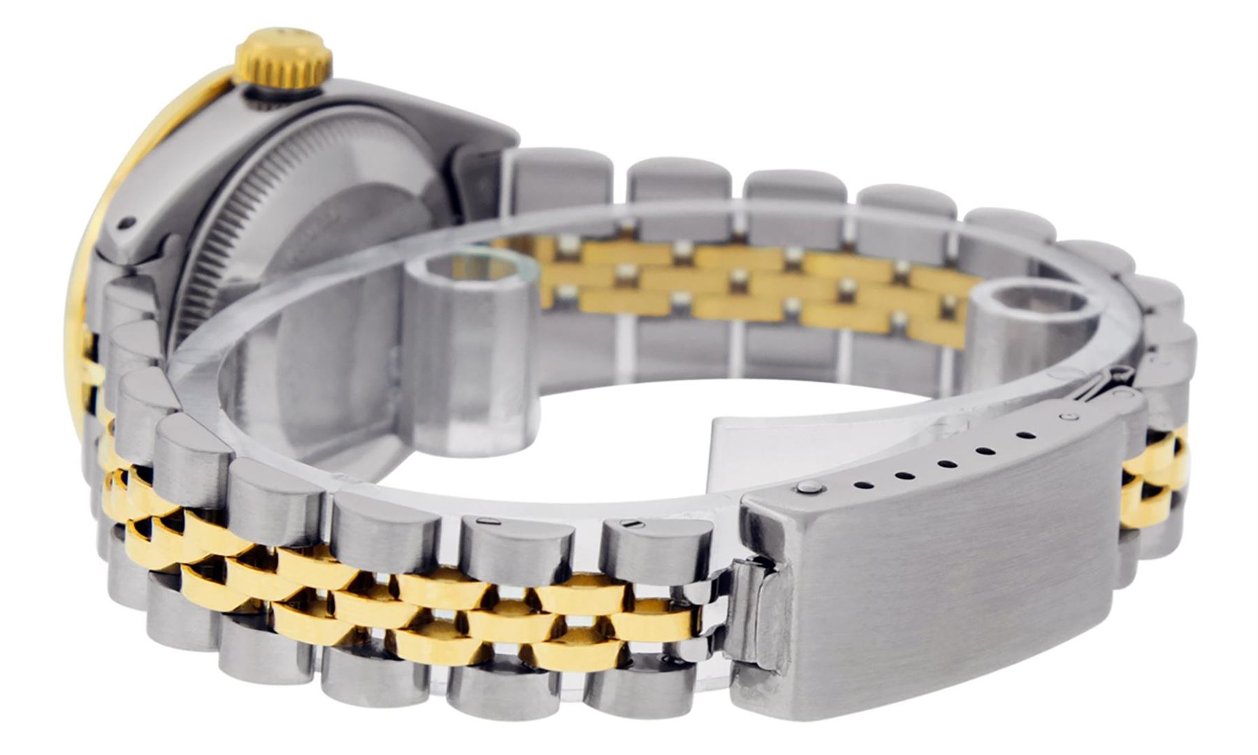 One Ladies Pre Owned Two Tone Rolex Datejust Polished, Serviced & Electronically Tested, Yellow Gold & Stainless Steel Case: 26mm, Yellow Gold Crown, Custom Bezel: New 18K Yellow Gold Sapphire Beadset Diamond Bezel, Diamond + Gem Count: 28 Diamonds + 4 Sa