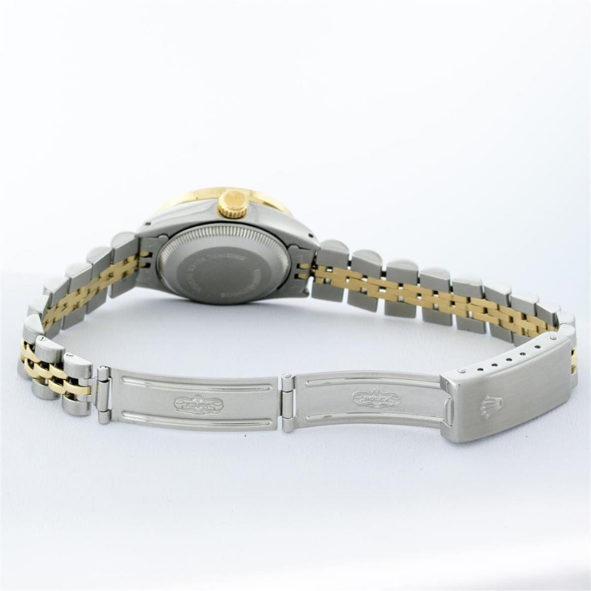 One Ladies Two Tone Rolex Oyster Perpetual Datejust Polished, Serviced & Electronically Tested, Yellow Gold & Stainless Steel Case: 26mm, Yellow Gold Crown, Custom Bezel: New 18K Yellow Gold Pyramid Diamond Bezel, Diamond Count: 24 Diamonds In Bezel. Total Weight .50 Carat, Clarity: SI-VS, Color: G to H. Custom Crystal: New Synthetic Sapphire Cyclops Lens. Custom Hands: New Luminescent Hands. Movement: Automatic Winding Movement. Custom Dial: Black Index With Dash Track & Lumi Dots. Date Window: 3 O'Clock Position Date Display, Model: Datejust. Condition: G-6 Extra Fine. Bracelet: Two Tone Yellow Gold & Stainless Steel Jubilee. Bright Polish. 6.0 Inch Length, Adjustable. Standard Clasp, With Rolex Logo. This Watch Has Been Serviced Time Tested And Is In Excellent Condition It Is Free Of All Scratches And Dents.