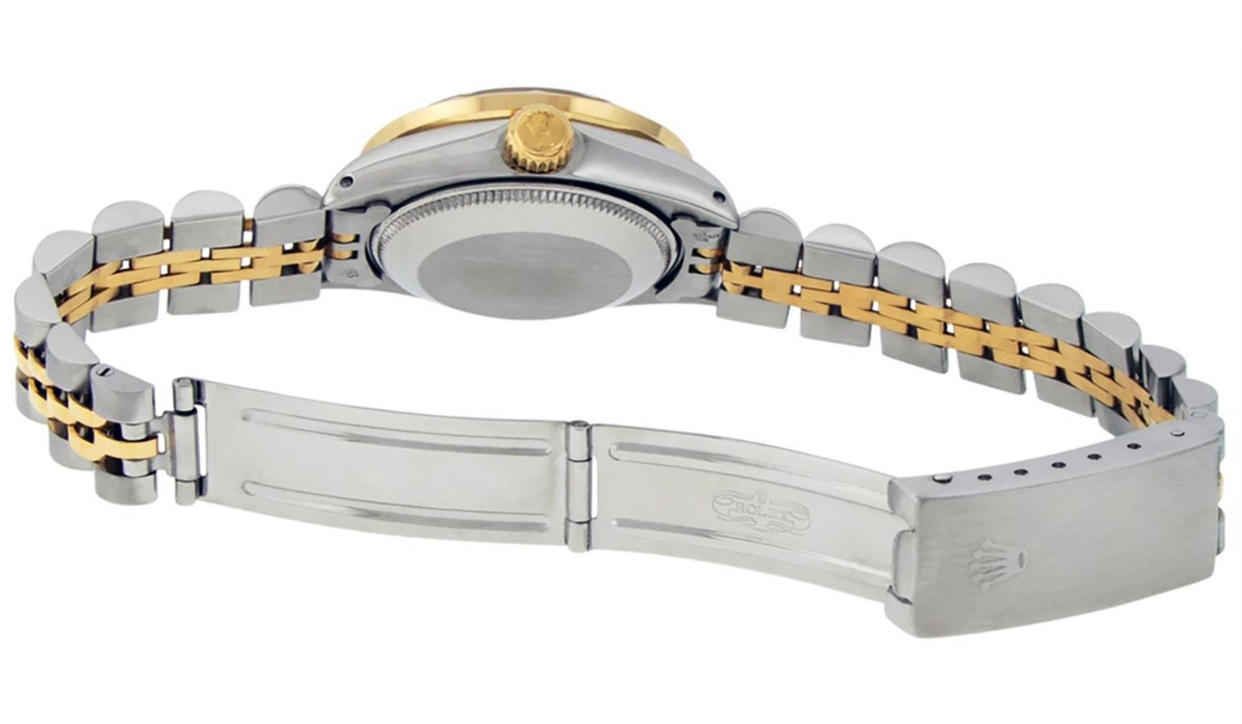 One Ladies Two Tone Rolex Oyster Perpetual Datejust Polished, Serviced & Electronically Tested, Yellow Gold & Stainless Steel Case: 26mm, Yellow Gold Crown, Custom Bezel: New 18K Yellow Gold Pyramid Diamond Bezel, Diamond Count: 24 Diamonds In Bezel. Total Weight .50 Carat, Clarity: SI-VS, Color: G to H. Custom Crystal: New Synthetic Sapphire Cyclops Lens. Custom Hands: New Luminescent Hands. Movement: Automatic Winding Movement. Custom Dial: Black Index With Dash Track & Lumi Dots. Date Window: 3 O'Clock Position Date Display, Model: Datejust. Condition: G-6 Extra Fine. Bracelet: Two Tone Yellow Gold & Stainless Steel Jubilee. Bright Polish. 6.0 Inch Length, Adjustable. Standard Clasp, With Rolex Logo. This Watch Has Been Serviced Time Tested And Is In Excellent Condition It Is Free Of All Scratches And Dents.
