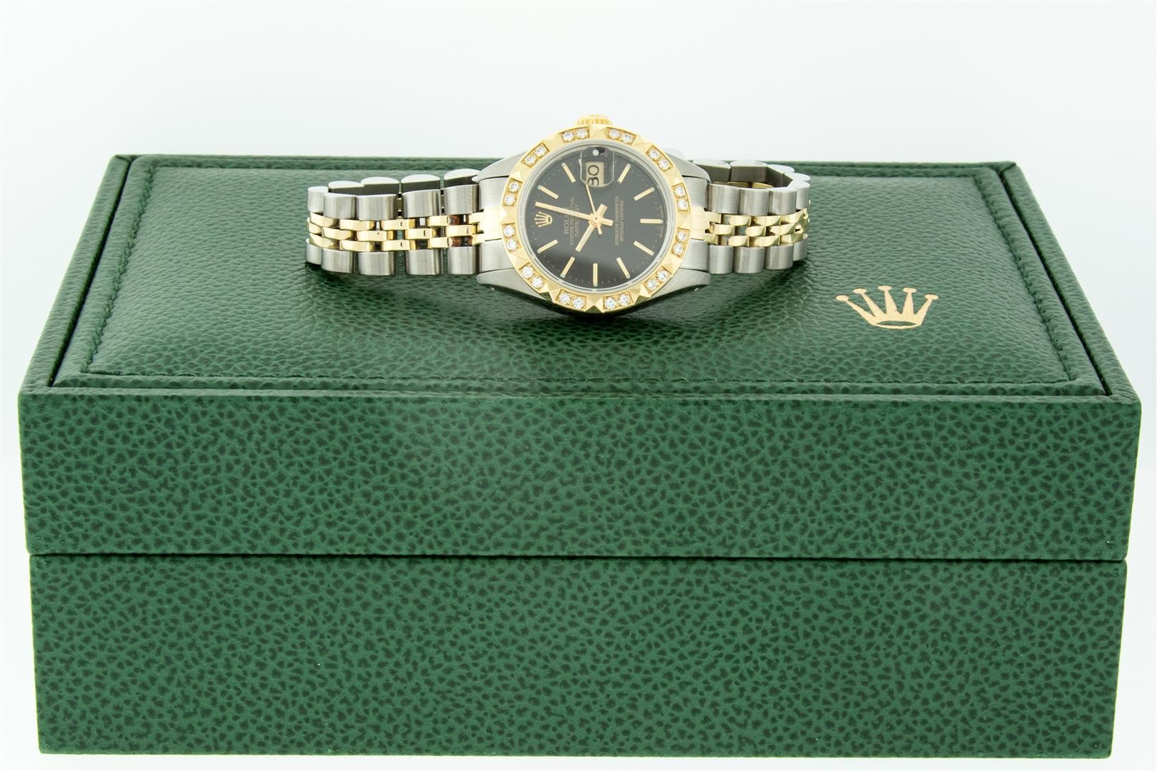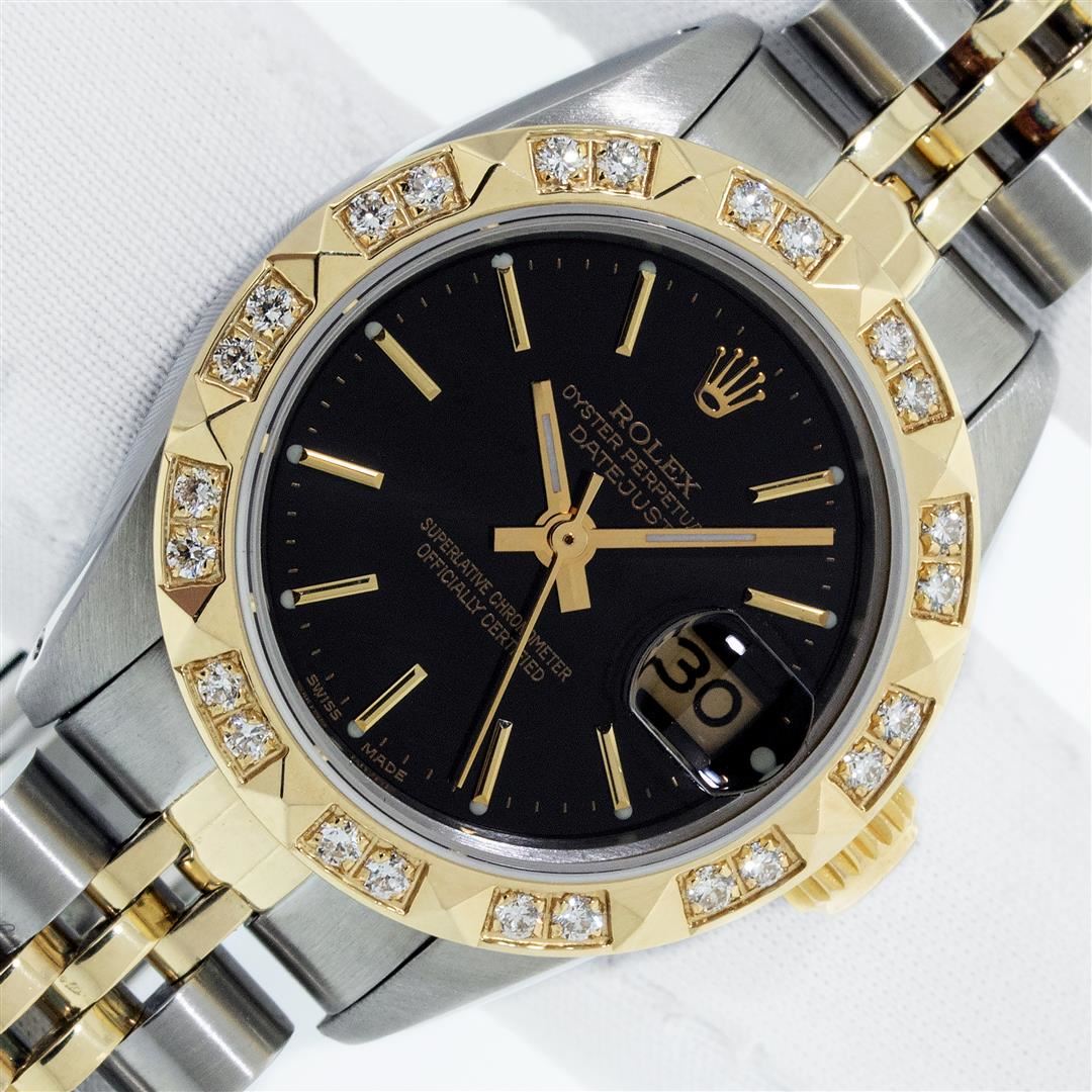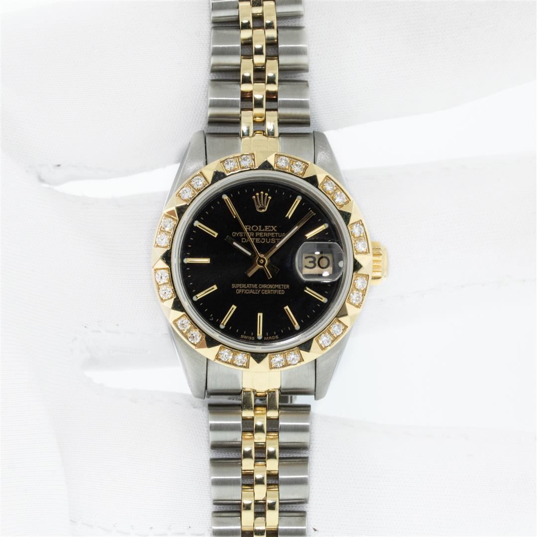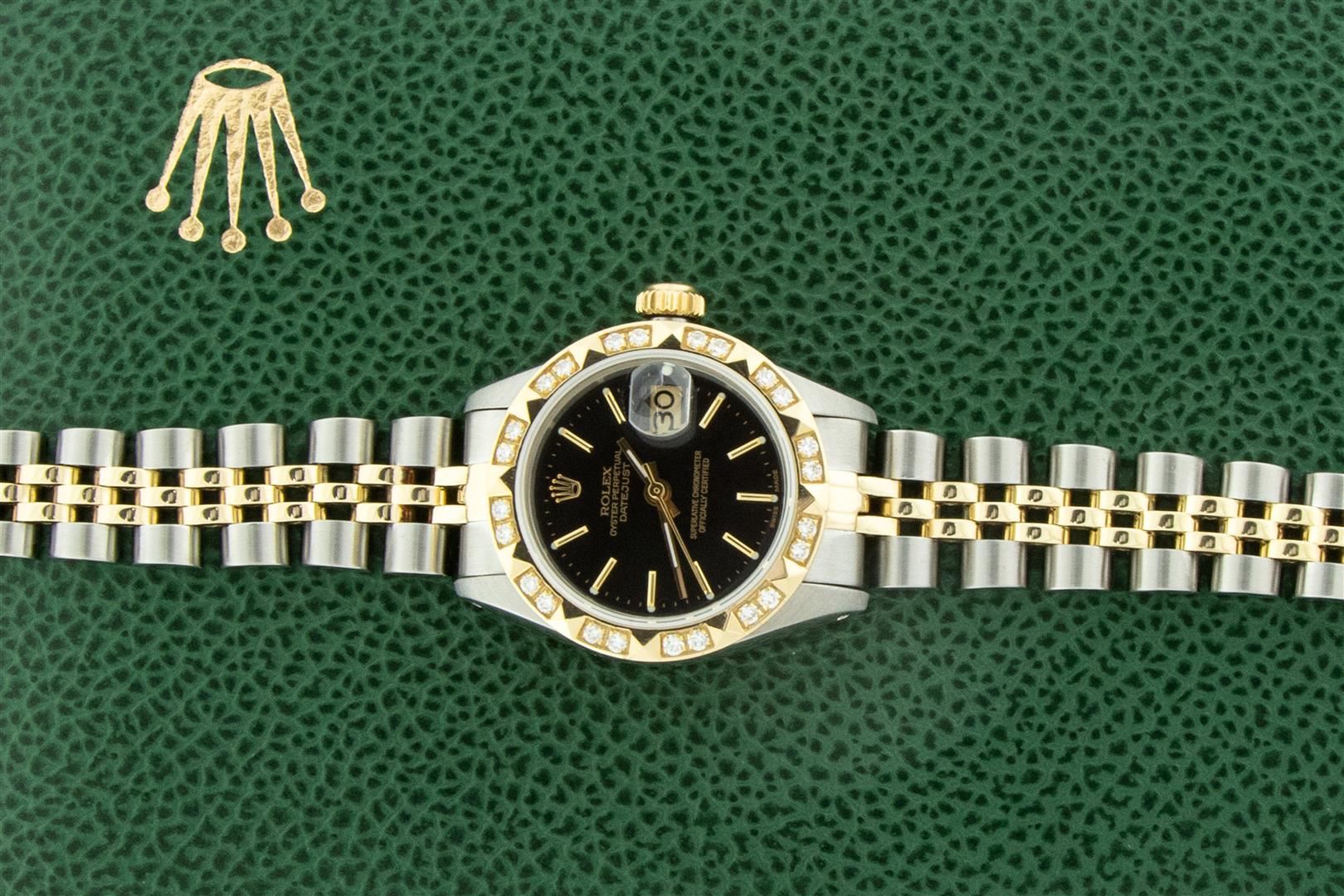 One Ladies Two Tone Rolex Oyster Perpetual Datejust Polished, Serviced & Electronically Tested, Yellow Gold & Stainless Steel Case: 26mm, Yellow Gold Crown, Custom Bezel: New 18K Yellow Gold Pyramid Diamond Bezel, Diamond Count: 24 Diamonds In Bezel. Total Weight .50 Carat, Clarity: SI-VS, Color: G to H. Custom Crystal: New Synthetic Sapphire Cyclops Lens. Custom Hands: New Luminescent Hands. Movement: Automatic Winding Movement. Custom Dial: Black Index With Dash Track & Lumi Dots. Date Window: 3 O'Clock Position Date Display, Model: Datejust. Condition: G-6 Extra Fine. Bracelet: Two Tone Yellow Gold & Stainless Steel Jubilee. Bright Polish. 6.0 Inch Length, Adjustable. Standard Clasp, With Rolex Logo. This Watch Has Been Serviced Time Tested And Is In Excellent Condition It Is Free Of All Scratches And Dents. This Watch Comes With A Rolex Box.