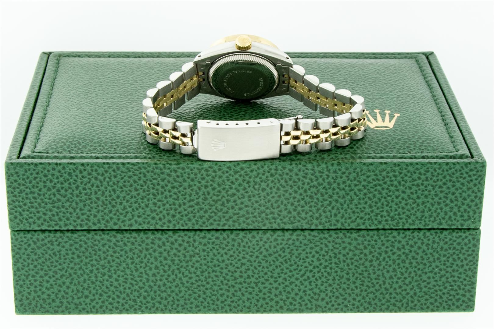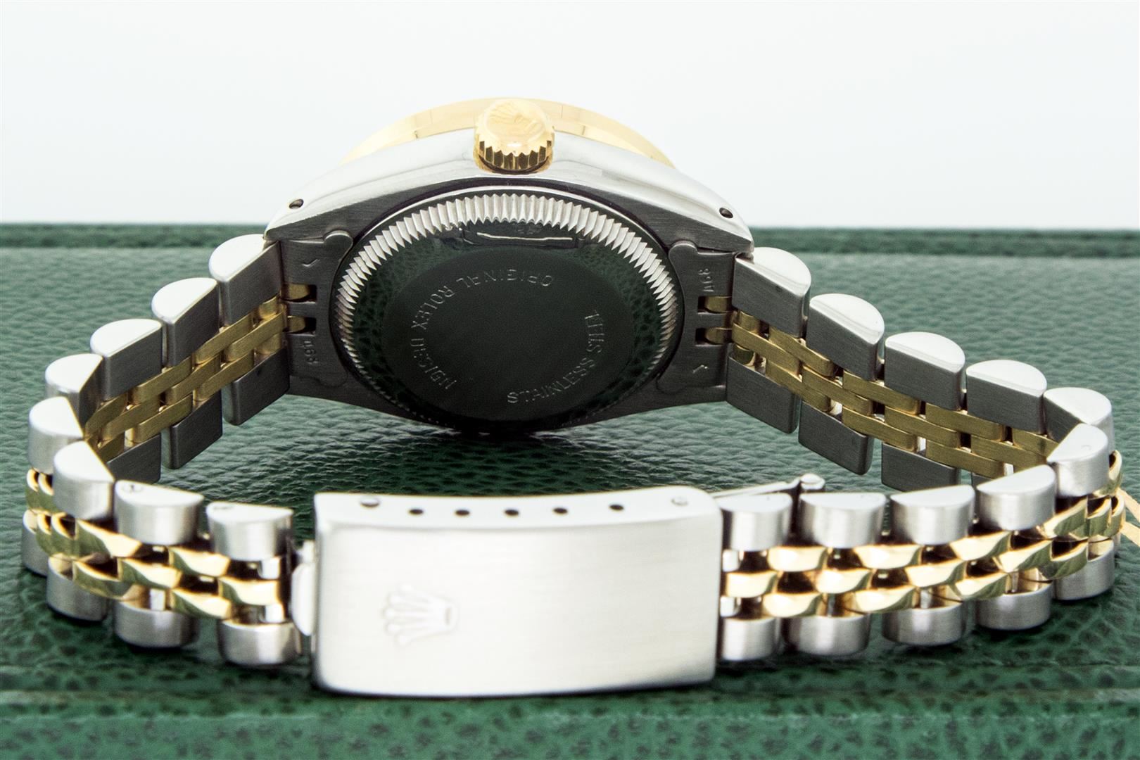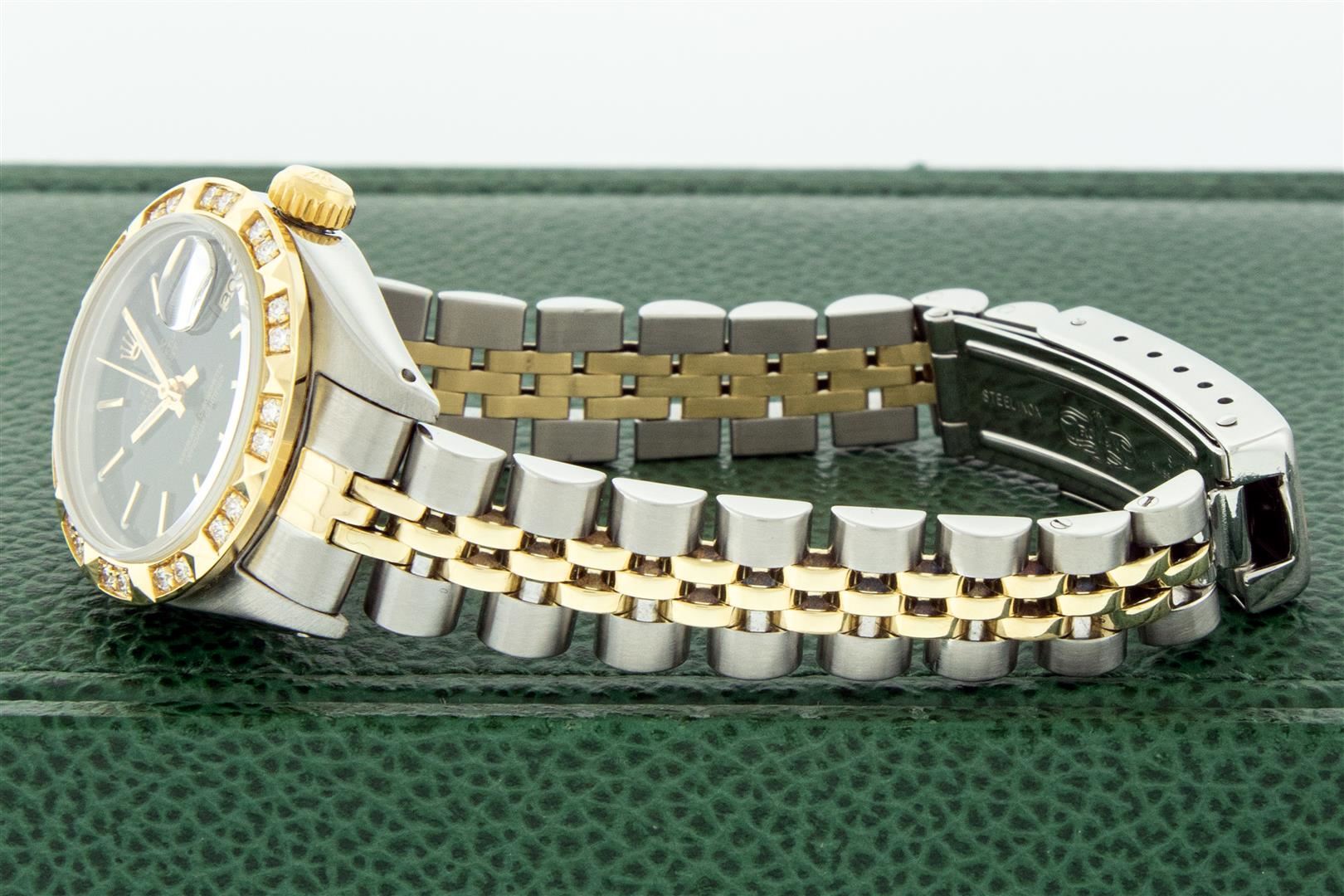 One Ladies Two Tone Rolex Oyster Perpetual Datejust Polished, Serviced & Electronically Tested, Yellow Gold & Stainless Steel Case: 26mm, Yellow Gold Crown, Custom Bezel: New 18K Yellow Gold Pyramid Diamond Bezel, Diamond Count: 24 Diamonds In Bezel. Total Weight .50 Carat, Clarity: SI-VS, Color: G to H. Custom Crystal: New Synthetic Sapphire Cyclops Lens. Custom Hands: New Luminescent Hands. Movement: Automatic Winding Movement. Custom Dial: Black Index With Dash Track & Lumi Dots. Date Window: 3 O'Clock Position Date Display, Model: Datejust. Condition: G-6 Extra Fine. Bracelet: Two Tone Yellow Gold & Stainless Steel Jubilee. Bright Polish. 6.0 Inch Length, Adjustable. Standard Clasp, With Rolex Logo. This Watch Has Been Serviced Time Tested And Is In Excellent Condition It Is Free Of All Scratches And Dents. This Watch Comes With A Rolex Box.