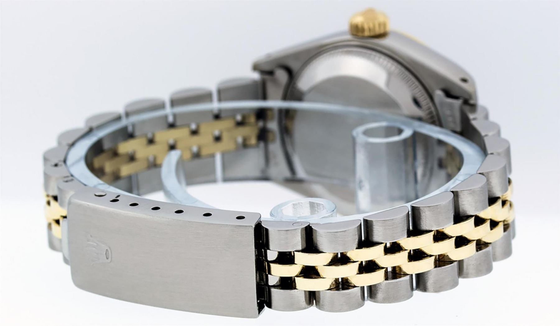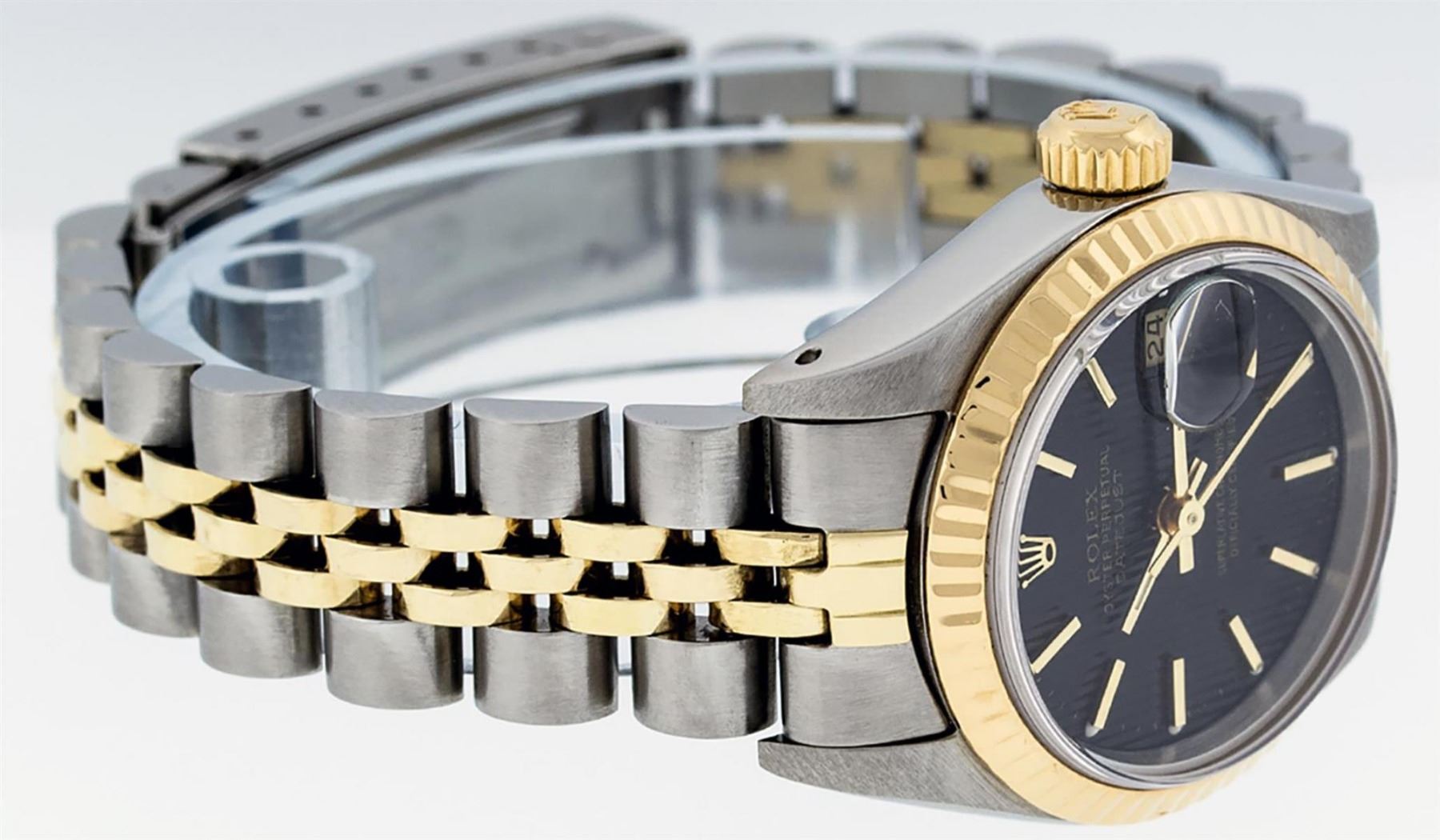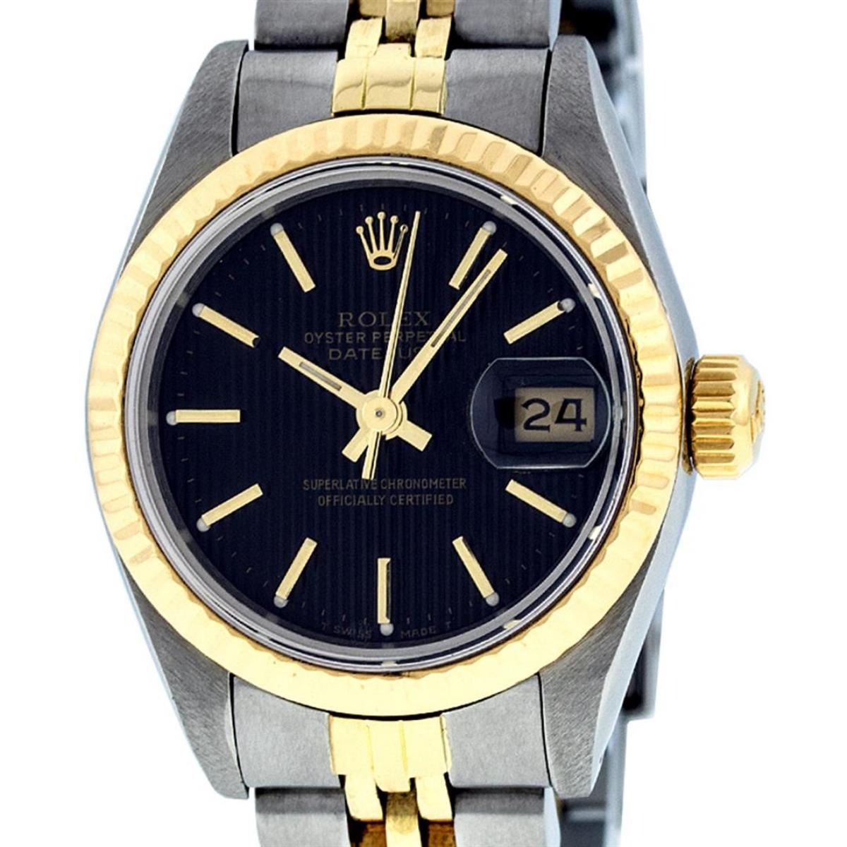 One Ladies Two Tone Rolex Datejust Polished, Serviced & Electronically Tested, Yellow Gold & Stainless Steel Case: 26mm, Yellow Gold Crown, Bezel: Yellow Gold Fluted Bezel. Custom Crystal: New Acrylic Cyclops Lens. Hands: Luminescent Hands. Movement: Automatic Winding Movement. Dial: Black Tapestry With Index Hour Markers. Date Window: 3 O'Clock Position Date Display, Model: Datejust. Condition: G-6 Extra Fine. Bracelet: Two Tone Yellow Gold & Stainless Steel Jubilee Band. Bright Polish. 6.0 Inch Length, Adjustable. Standard Clasp, With Rolex Logo. This Watch Has Been Serviced Time Tested And Is In Excellent Condition It Is Free Of All Scratches And Dents.