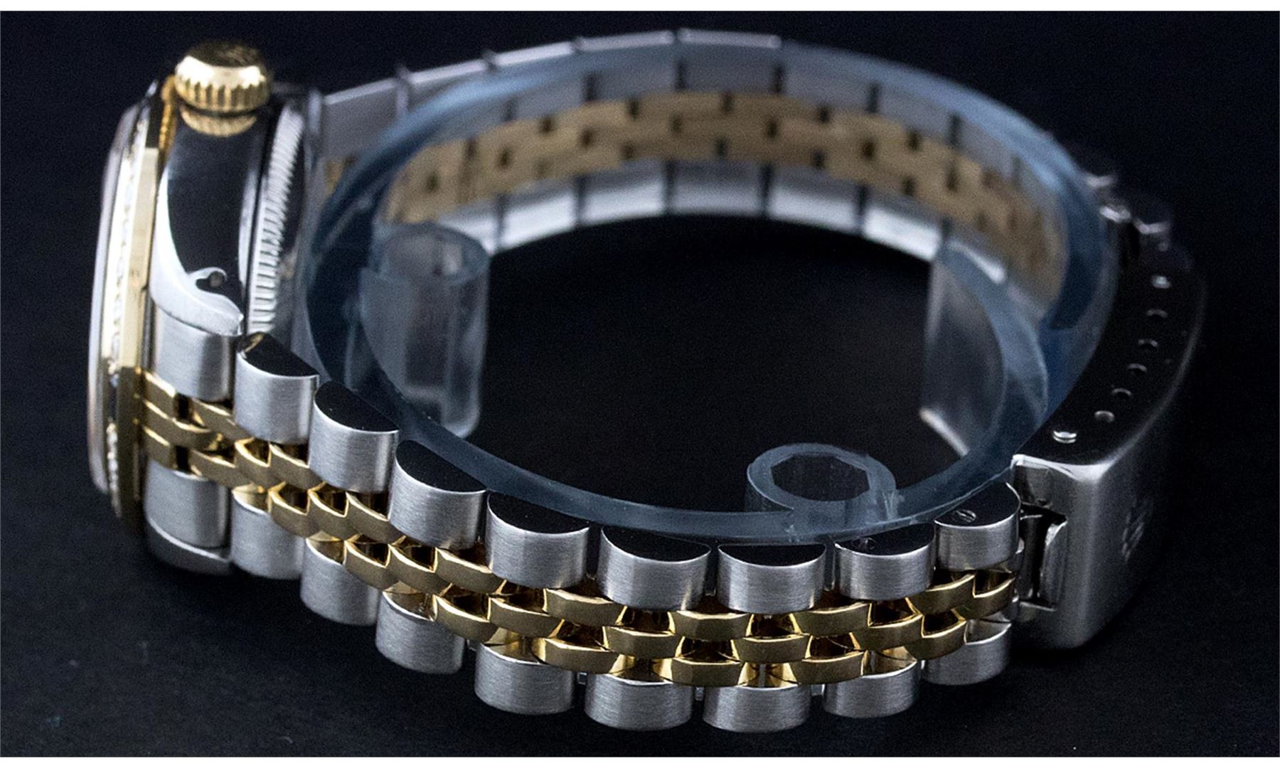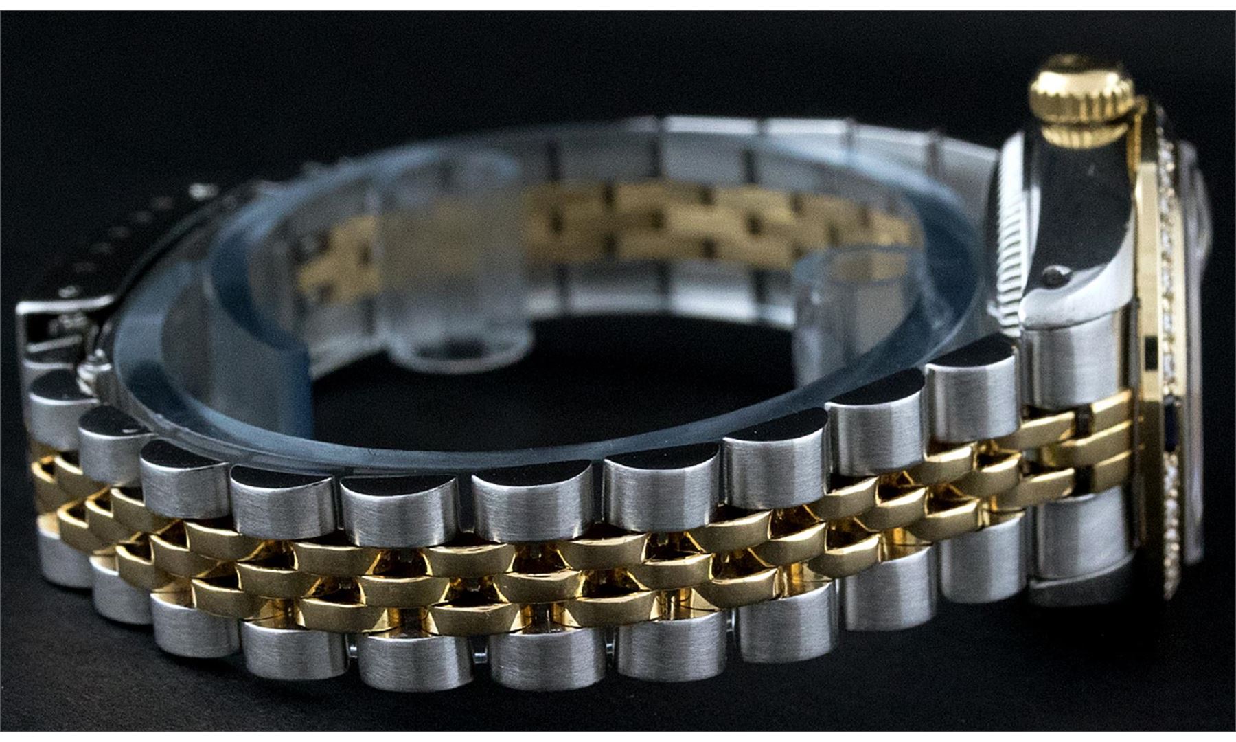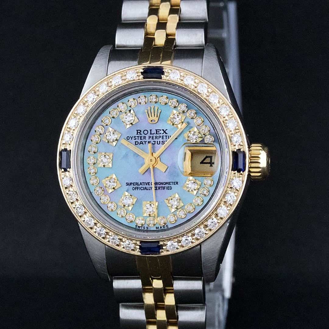 One Ladies Pre Owned Two Tone Rolex Datejust Polished, Serviced & Electronically Tested, Yellow Gold & Stainless Steel Case: 26mm, Yellow Gold Crown, Custom Bezel: New 18K New Yellow Gold Beadset + Sapphire Diamond Bezel, Stone Count: 28 Diamonds + 4 Sapp