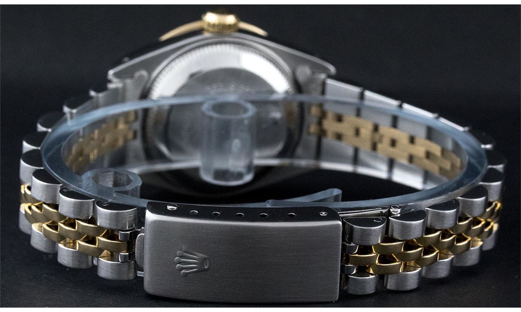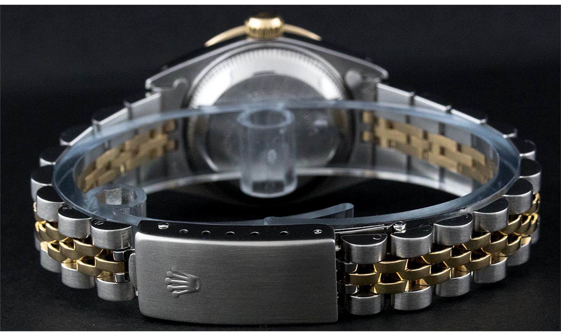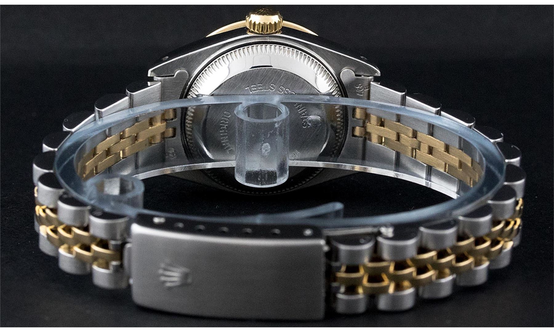 One Ladies Pre Owned Two Tone Rolex Datejust Polished, Serviced & Electronically Tested, Yellow Gold & Stainless Steel Case: 26mm, Yellow Gold Crown, Custom Bezel: New 18K New Yellow Gold Beadset + Sapphire Diamond Bezel, Stone Count: 28 Diamonds + 4 Sapp