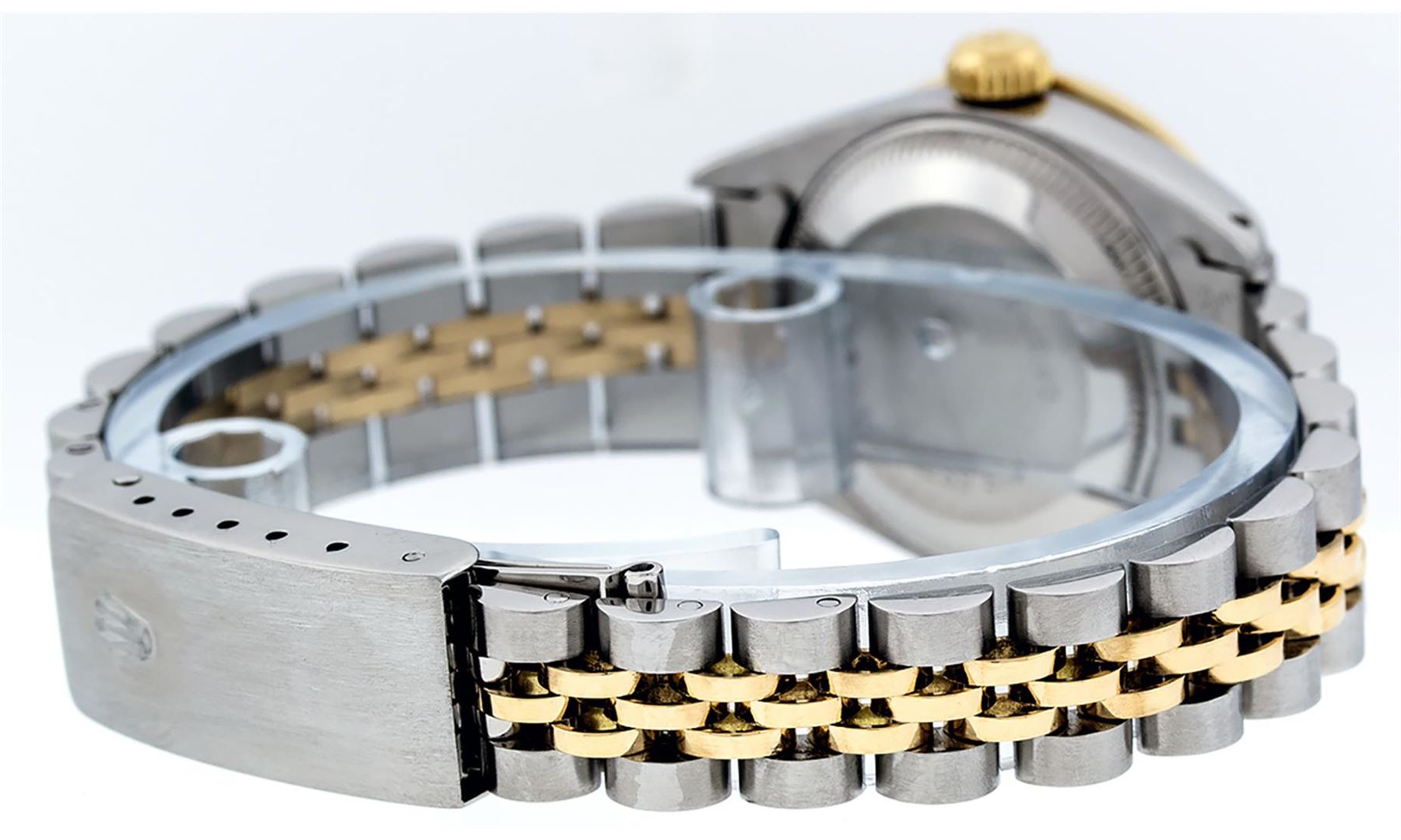 One Ladies Pre Owned Two Tone Rolex Datejust Polished, Serviced & Electronically Tested, Yellow Gold & Stainless Steel Case: 26mm, Yellow Gold Crown, Custom Bezel: New 18K Yellow Gold Sapphire Beadset Diamond Bezel, Diamond Count: 28 Diamonds + 4 Sapphires. Clarity: SI-VS, Color: G to H. Custom Crystal: New Sapphire With Date Window. Custom Hands: New Luminescent Hands. Rolex Movement: Automatic Winding Movement. Custom Dial: Blue Mother Of Pearl With Custom Added String Diamond Hour Markers. Diamond Count: 43 Diamonds In Dial, Clarity: SI-VS, Color: G to H. Date Window: 3 O'Clock Position Date Display, Non Quickset, Model: Datejust. Condition: G-6 Extra Fine. Rolex Bracelet: Two Tone Yellow Gold & Stainless Steel Jubilee Band. Bright Polish. 6.0 Inch Length, Adjustable. Standard Clasp, With Rolex Logo.