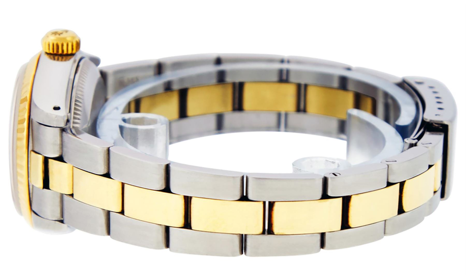 One Ladies Two Tone Rolex Datejust Polished, Serviced & Electronically Tested, Yellow Gold & Stainless Steel Case: 26mm, Yellow Gold Crown, Bezel: Yellow Gold Fluted Bezel. Custom Crystal: New Acrylic Cyclops Lens. Custom Hands: New Luminescent Hands. Movement: Automatic Winding Movement. Custom Dial: Blue Vignette With Diamond Hour Markers, Diamond Count: 10 Single Cut Diamonds, Color: G to H, Clarity: VS. Date Window: 3 O'Clock Position Date Display, Model: Datejust. Condition: G-6 Extra Fine. Bracelet: Two Tone Yellow Gold & Stainless Steel Jubilee. Bright Polish. 6.0 Inch Length, Adjustable. Standard Clasp, With Rolex Logo. This Watch Has Been Serviced Time Tested And Is In Excellent Condition It Is Free Of All Scratches And Dents.