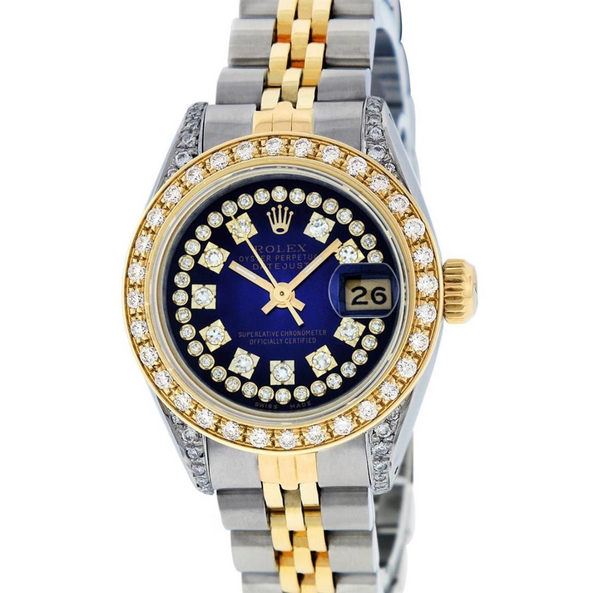 One Ladies Two Tone Rolex Datejust Polished, Serviced & Electronically Tested, Yellow Gold & Stainless Steel Case: 26mm, Yellow Gold Crown, Diamond Lugs: 24 Diamonds On Lugs, Clarity: SI-VS, Color: G to H. Custom Bezel: New 18K Yellow Gold Beadset Diamond Bezel, Diamond Count: 32 Diamonds On Bezel, Total Weight .70 Carat, Clarity: SI-VS, Color: G to H. Custom Crystal: New Synthetic Scratch Resistant Sapphire Cyclops Lens. Custom Hands: New Luminescent Hands. Movement: Automatic Winding Movement. Custom Dial: Blue Vignette With String Single Cut Diamond Hour Markers, Diamond Count: 43 Diamonds On Dial, Clarity: SI-VS, Color: G to H. Date Window: 3 O'Clock Position Date Display, Model: Datejust. Condition: G-6 Extra Fine. Bracelet: Two Tone Yellow Gold & Stainless Steel Jubilee Band. Bright Polish. 6.0 Inch Length, Adjustable. Standard Clasp, With Rolex Logo. This Watch Has Been Serviced Time Tested And Is In Excellent Condition It Is Free Of All Scratches And Dents.