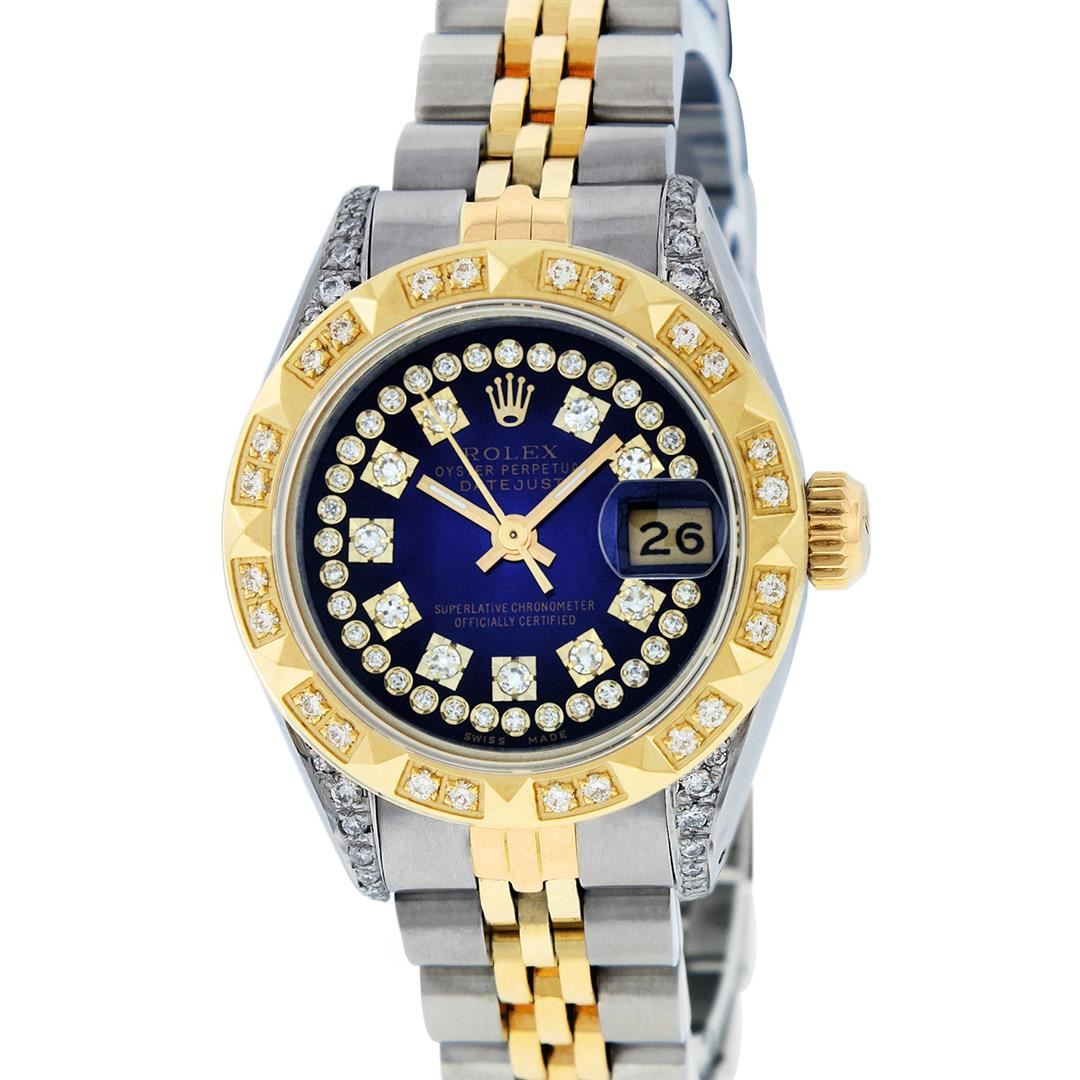 One Ladies Two Tone Rolex Datejust Polished, Serviced & Electronically Tested, Yellow Gold & Stainless Steel Case: 26mm, Yellow Gold Crown, Diamond Lugs: 24 Diamonds On Lugs, Clarity: SI-VS, Color: G to H. Custom Bezel: New 18K Yellow Gold Pyramid Diamond Bezel, Diamond Count: 24 Diamonds On Bezel, Total Weight .50 Carat, Clarity: SI-VS, Color: G to H. Custom Crystal: New Synthetic Scratch Resistant Sapphire Cyclops Lens. Custom Hands: New Luminescent Hands. Movement: Automatic Winding Movement. Custom Dial: Blue Vignette With String Single Cut Diamond Hour Markers, Diamond Count: 43 Diamonds On Dial, Clarity: SI-VS, Color: G to H. Date Window: 3 O'Clock Position Date Display, Model: Datejust. Condition: G-6 Extra Fine. Bracelet: Two Tone Yellow Gold & Stainless Steel Jubilee Band. Bright Polish. 6.0 Inch Length, Adjustable. Standard Clasp, With Rolex Logo. This Watch Has Been Serviced Time Tested And Is In Excellent Condition It Is Free Of All Scratches And Dents.