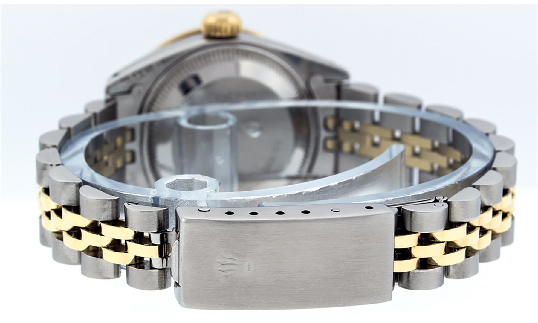 One Ladies Two Tone Rolex Datejust Polished, Serviced & Electronically Tested, Yellow Gold & Stainless Steel Case: 26mm, Yellow Gold Crown, Diamond Lugs: 24 Diamonds On Lugs, Clarity: SI-VS, Color: G to H. Custom Bezel: New 18K Yellow Gold Pyramid Diamond Bezel, Diamond Count: 24 Diamonds On Bezel, Total Weight .50 Carat, Clarity: SI-VS, Color: G to H. Custom Crystal: New Synthetic Scratch Resistant Sapphire Cyclops Lens. Custom Hands: New Luminescent Hands. Movement: Automatic Winding Movement. Custom Dial: Blue Vignette With String Single Cut Diamond Hour Markers, Diamond Count: 43 Diamonds On Dial, Clarity: SI-VS, Color: G to H. Date Window: 3 O'Clock Position Date Display, Model: Datejust. Condition: G-6 Extra Fine. Bracelet: Two Tone Yellow Gold & Stainless Steel Jubilee Band. Bright Polish. 6.0 Inch Length, Adjustable. Standard Clasp, With Rolex Logo. This Watch Has Been Serviced Time Tested And Is In Excellent Condition It Is Free Of All Scratches And Dents.