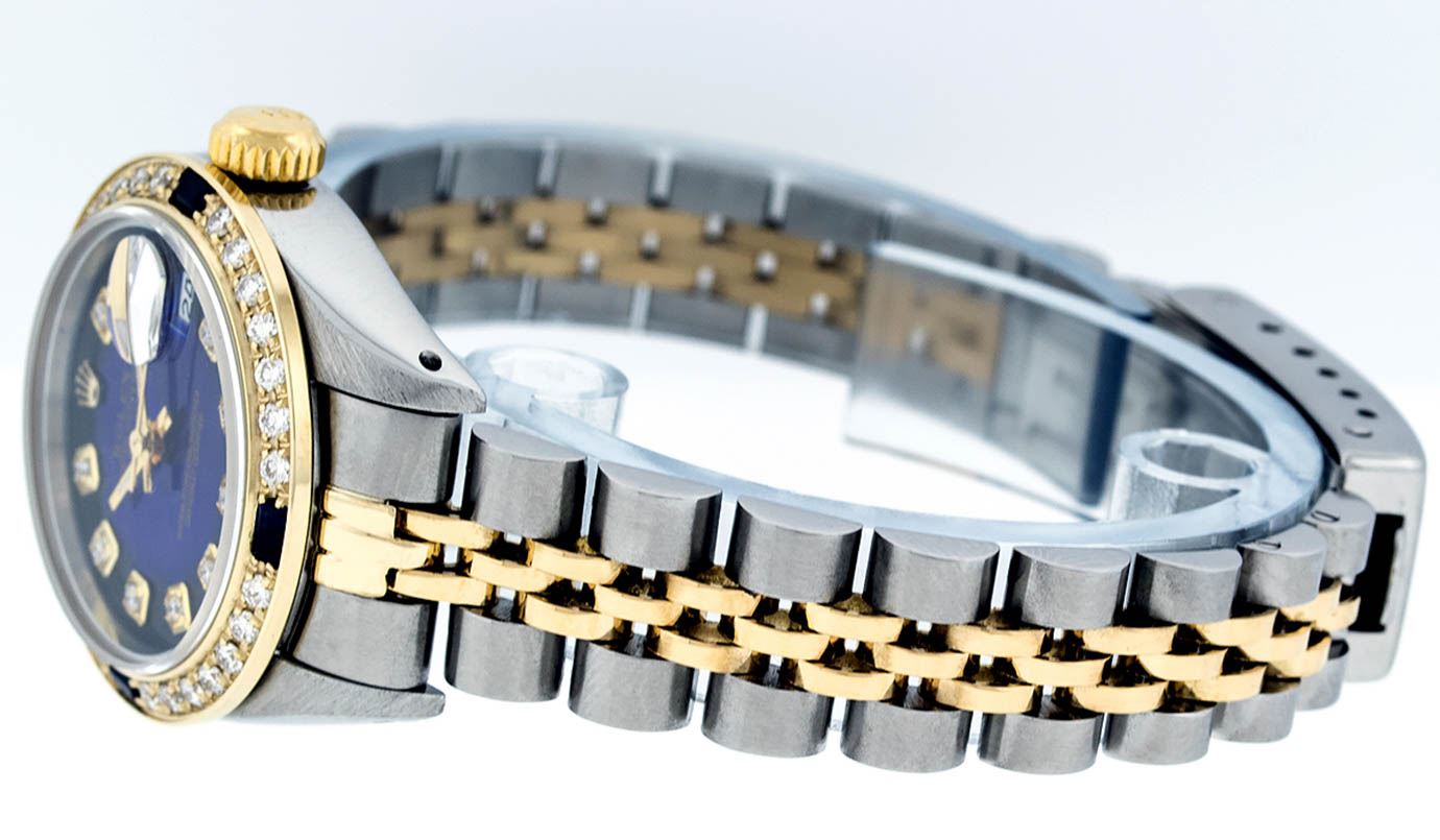 One Ladies 14K Two Tone Rolex Datejust Polished, Serviced & Electronically Tested, 14K Yellow Gold & Stainless Steel Case: 26mm, 14K Yellow Gold Crown, Custom Bezel: New 18K Yellow Gold Sapphire Beadset Diamond Bezel, Diamond + Gem Count: 28 Diamonds + 4 Sapphires Total Weight .70 Carat, Clarity: Si-VS, Color: G to H. Custom Crystal: New Synthetic Sapphire Cyclops Lens. Custom Hands: New Luminescent Hands. Movement: Automatic Winding Movement Caliber 2030. Custom Dial: Blue Vignette Dial Set With Diamond Hour Markers, Diamond Count: 10 Diamond in Dial, G To H In Color, SI-VS Clarity. Date Window: 3 O'Clock Position Date Display, Model: Datejust, Condition: G-6 Extra Fine. Bracelet: Two Tone 14K Yellow Gold & Stainless Steel Jubilee. Bright Polish. 6.0 Inch Length, Adjustable. Standard Clasp, With Rolex Logo. This Watch Has Been Serviced Time Tested And Is In Excellent Condition It Is Free Of All Scratches And Dents.