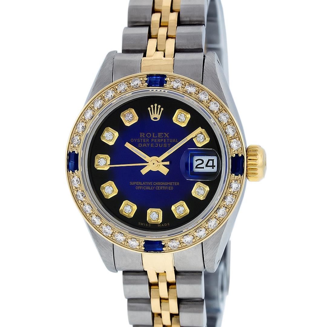 One Ladies Pre Owned Two Tone Rolex Datejust Polished, Serviced & Electronically Tested, Rolex Yellow Gold & Stainless Steel Case: 26mm, Rolex Yellow Gold Crown, Custom Bezel: New 18K Yellow Gold Sapphire Beadset Diamond Bezel, Diamond + Gem Count: 28 Diamonds + 4 Sapphires, Clarity: Si-VS, Color: G to H. Custom Crystal: New Sapphire Magnified Date. Custom Hands: New Luminescent Hands. Rolex Movement: Automatic Winding Movement. Custom Dial: Refinished Blue Vignette Dial Set With Custom Diamond Hour Markers, Diamond Count: 10 Diamond in Dial, G To H In Color, SI-VS Clarity. Date Window: 3 O'Clock Position Date Display, Model: Datejust, Condition: G-6 Extra Fine. Rolex Bracelet: Two Tone Yellow Gold & Stainless Steel Jubilee. Bright Polish. 6.0 Inch Length, Adjustable. Standard Clasp, With Rolex Logo. This Watch Has Been Serviced Time Tested And Is In Excellent Condition It Is Free Of All Scratches And Dents.
