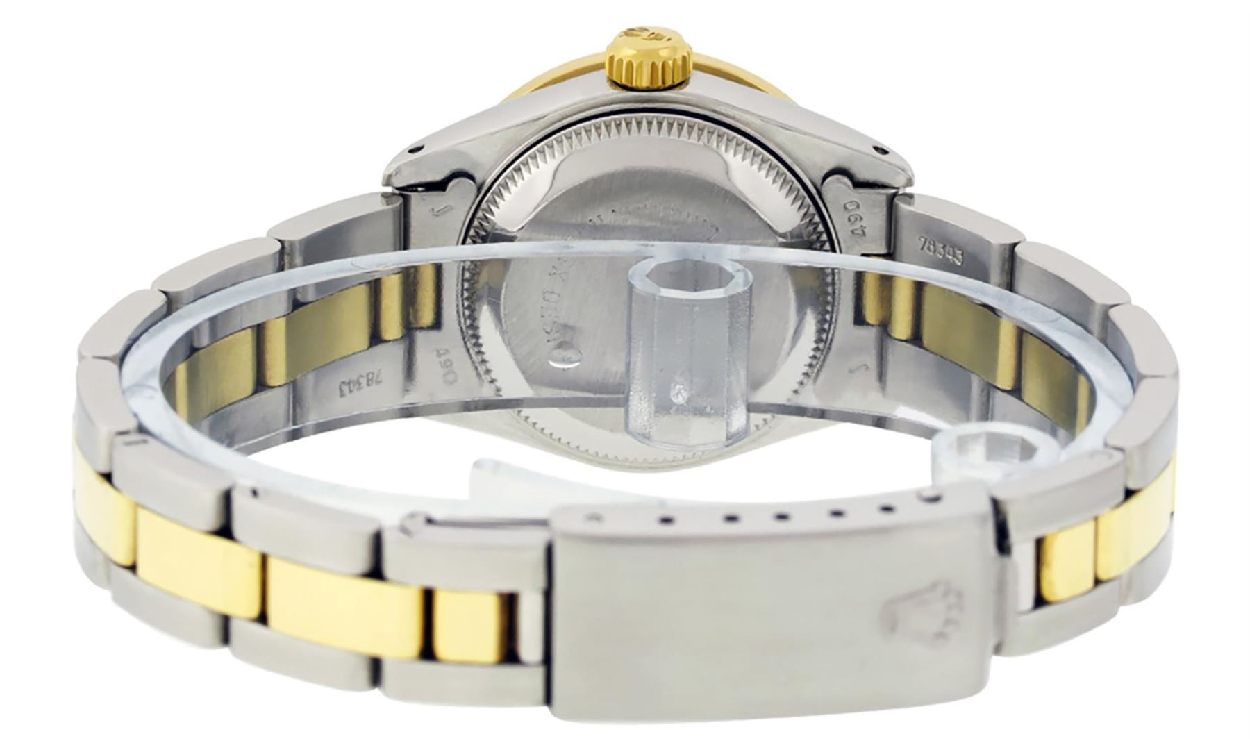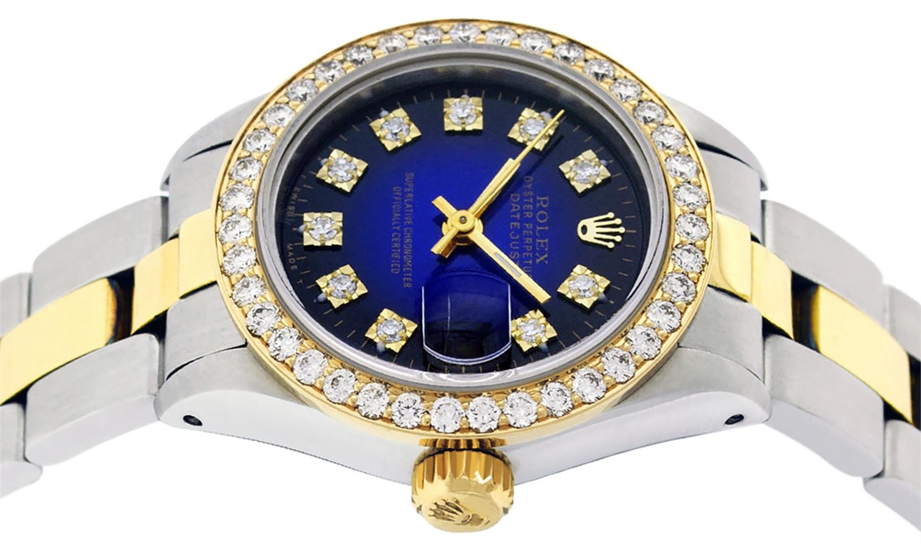 One Ladies Two Tone Rolex Datejust Polished, Serviced & Electronically Tested, Yellow Gold & Stainless Steel Case: 26mm, Yellow Gold Crown, Custom Bezel: New 18K 1ctw Yellow Gold Beadset Diamond Bezel, Diamond Count: 42 Diamonds In Dial, Total Weight 1.00 Carat, Clarity: SI-VS, Color: G to H. Custom Crystal: New Synthetic Sapphire Cyclops Lens. Custom Hands: New Luminescent Hands. Movement: Automatic Winding Movement. Custom Dial: Blue Vignette VS Diamond Dial With Dash Track & Lumi Dots, Diamond Count: 10 Single Cut Diamonds in Dial, G To H In Color, VS Clarity. Date Window: 3 O'Clock Position Date Display, Model: Datejust, Condition: G-6 Extra Fine. Bracelet: Two Tone Yellow Gold & Stainless Steel Oyster Band. Bright Polish. 6.0 Inch Length, Adjustable. Standard Clasp, With Rolex Logo. This Watch Has Been Serviced Time Tested And Is In Excellent Condition It Is Free Of All Scratches And Dents.
