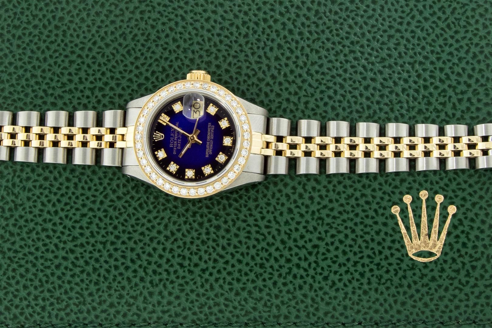 One Ladies Two Tone Rolex Datejust Polished, Serviced & Electronically Tested, Yellow Gold & Stainless Steel Case: 26mm, Yellow Gold Crown, Custom Bezel: New 18K 1ctw Yellow Gold Beadset Diamond Bezel, Diamond Count: 42 Diamonds, Total Weight 1.00 Carat, Clarity: SI-VS, Color: G to H. Custom Crystal: New Synthetic Sapphire Cyclops Lens. Custom Hands: New Luminescent Hands. Movement: Automatic Winding Movement. Custom Dial: Blue Vignette VS Diamond Dial, Diamond Count: 10 Single Cut Diamonds in Dial, G To H In Color, VS Clarity. Date Window: 3 O'Clock Position Date Display, Model: Datejust, Condition: G-6 Extra Fine. Bracelet: Two Tone Yellow Gold & Stainless Steel Jubilee. Bright Polish. 6.0 Inch Length, Adjustable. Standard Clasp, With Rolex Logo. This Watch Has Been Serviced Time Tested And Is In Excellent Condition It Is Free Of All Scratches And Dents.