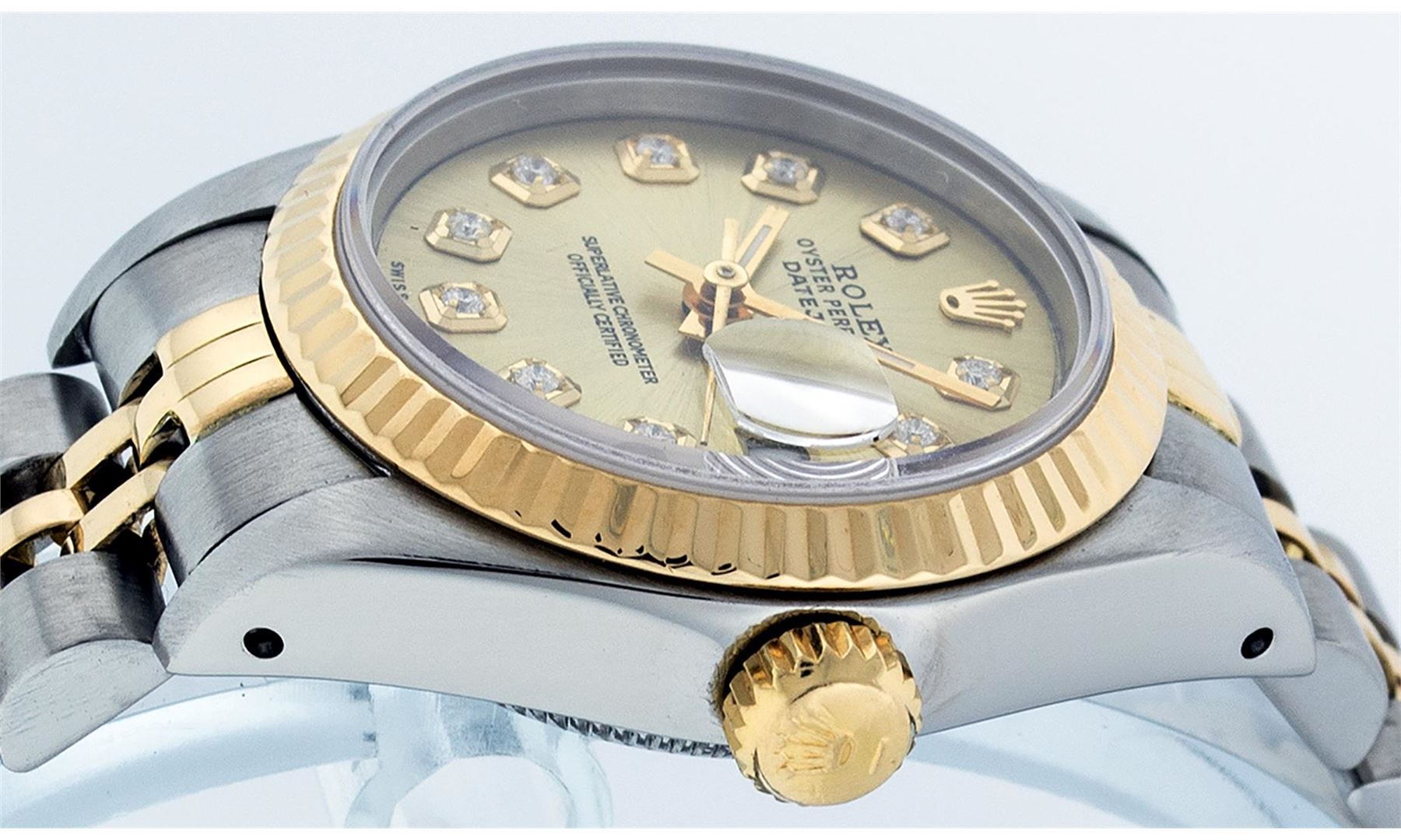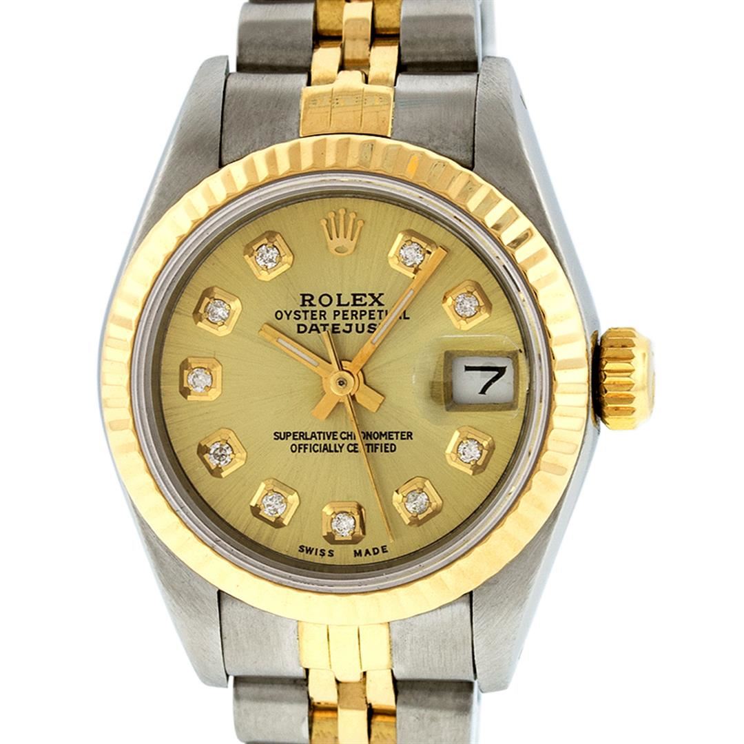 One Ladies Pre Owned Two Tone Rolex Datejust Polished, Serviced & Electronically Tested, Rolex Yellow Gold & Stainless Steel Case: 26mm, Rolex Yellow Gold Crown, Rolex Bezel: Rolex Yellow Gold Fluted Bezel. Custom Crystal: New Acrylic With Magnified Date Window. Custom Hands: New Luminescent Hands. Rolex Movement: Automatic Winding Movement. Custom Dial: Refinished To Champagne With Custom Added Diamond Hour Markers, Diamond Count: 10 Diamonds In Dial, Color: G to H, Clarity: VS2-SI1. Date Window: 3 O'Clock Position Date Display, Model: Datejust. Condition: G-6 Extra Fine. Rolex Bracelet: Two Tone Yellow Gold & Stainless Steel Jubilee Band. Bright Polish. 6.0 Inch Length, Adjustable. Standard Clasp, With Rolex Logo. This Watch Has Been Serviced Time Tested And Is In Excellent Condition It Is Free Of All Scratches And Dents.