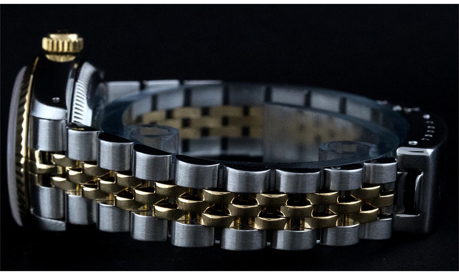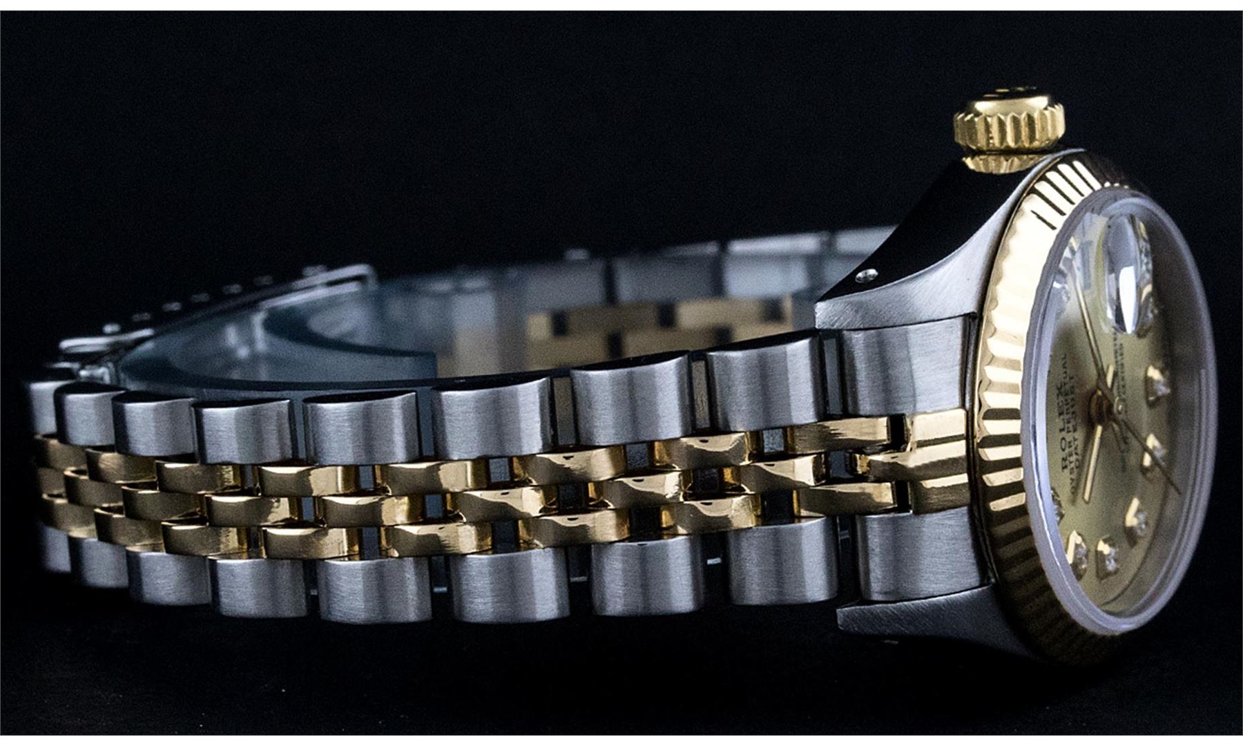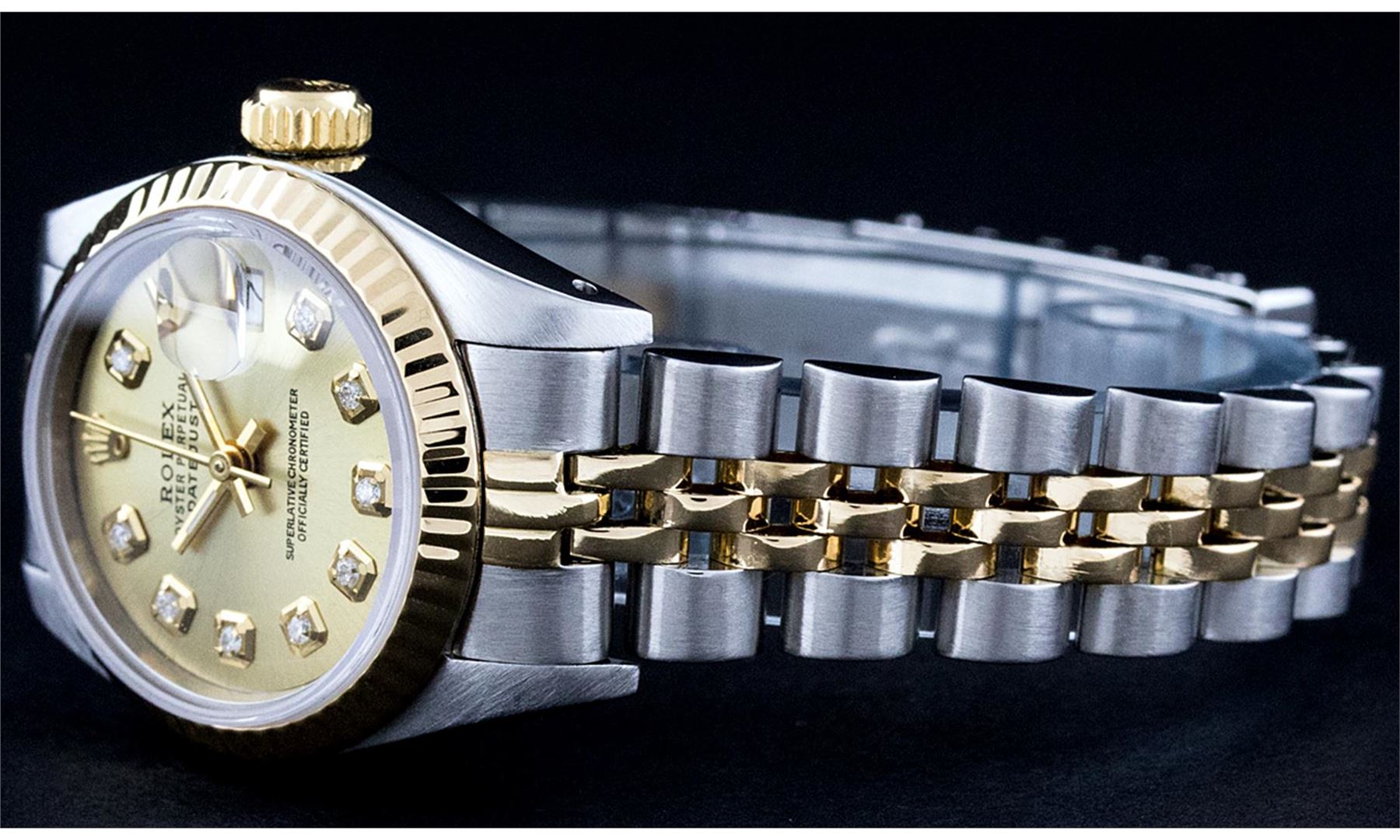 One Ladies Two Tone Rolex Datejust Polished, Serviced & Electronically Tested, Yellow Gold & Stainless Steel Case: 26mm, Yellow Gold Crown, Bezel: Yellow Gold Fluted Bezel. Custom Crystal: New Acrylic Cyclops Lens. Custom Hands: New Luminescent Hands. Movement: Automatic Winding Movement. Custom Dial: Champagne With Diamond Hour Markers, Diamond Count: 10 Diamonds In Dial, Color: G to H, Clarity: VS2-SI1. Date Window: 3 O'Clock Position Date Display, Model: Datejust. Condition: G-6 Extra Fine. Bracelet: Two Tone Yellow Gold & Stainless Steel Jubilee. Bright Polish. 6.0 Inch Length, Adjustable. Standard Clasp, With Rolex Logo. This Watch Has Been Serviced Time Tested And Is In Excellent Condition It Is Free Of All Scratches And Dents.