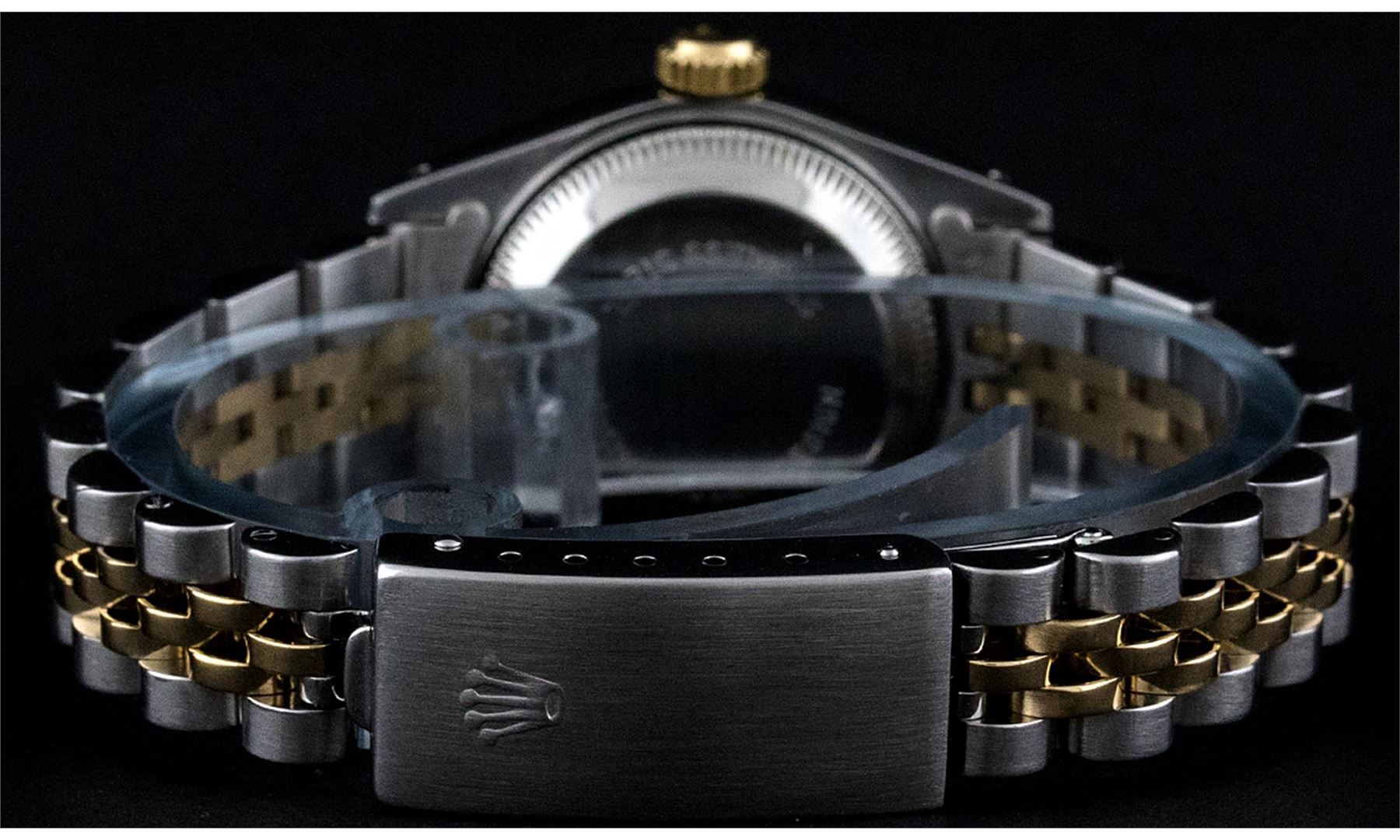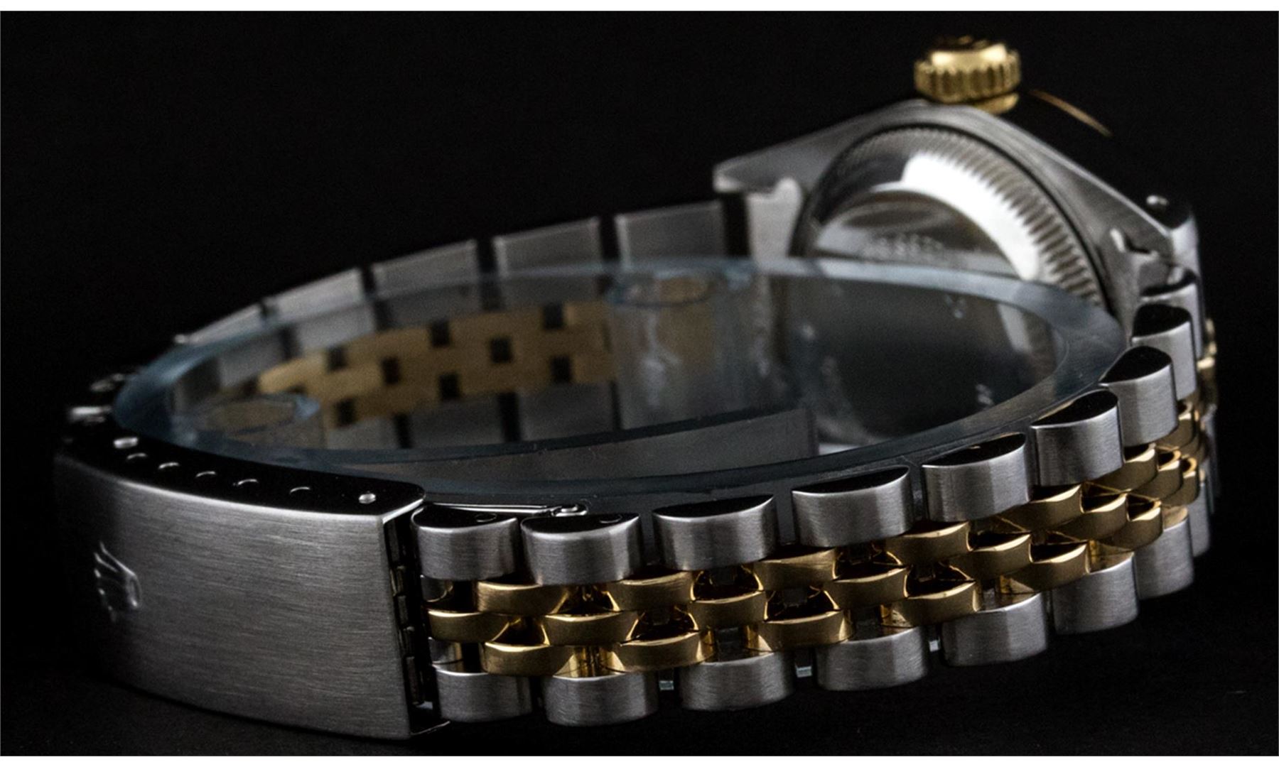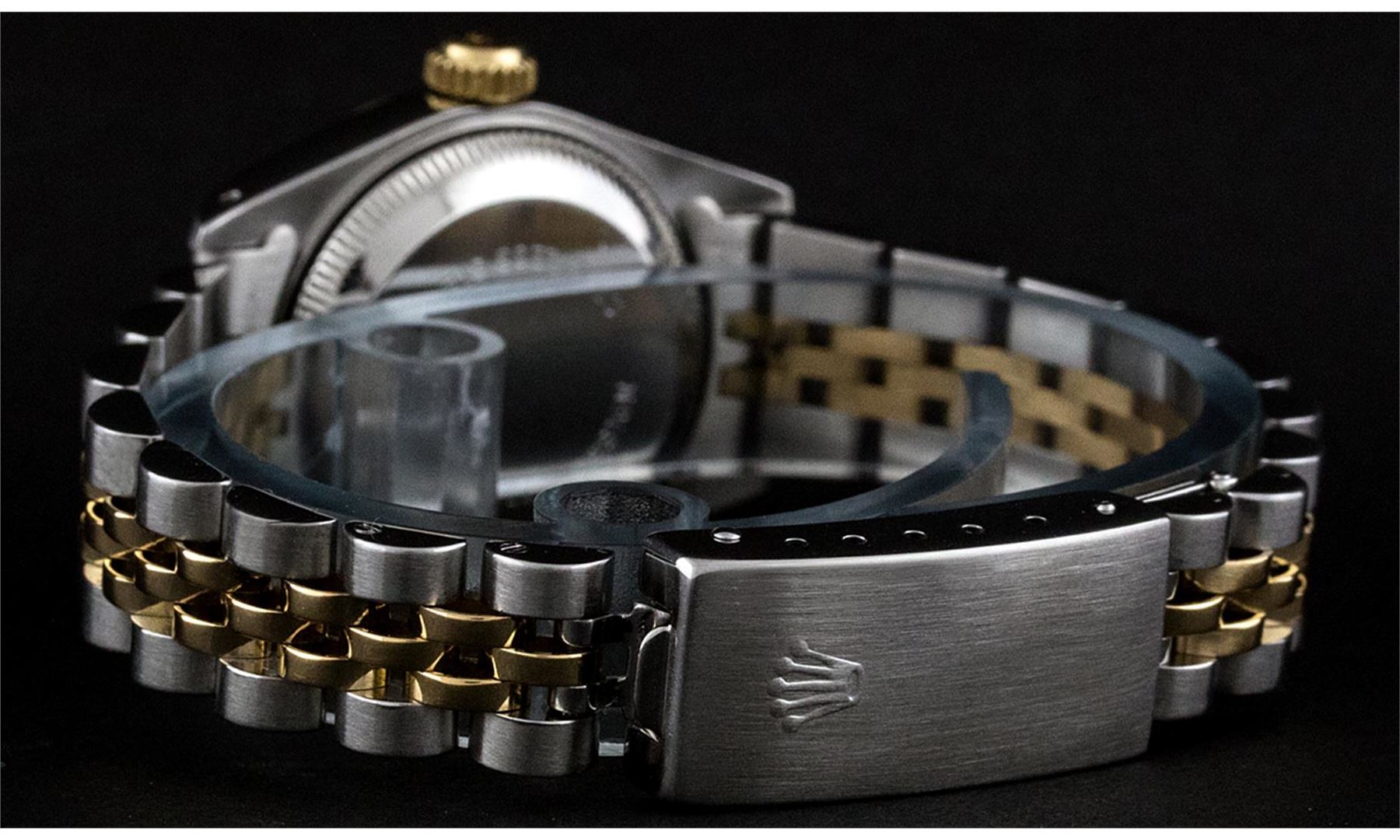 One Ladies Two Tone Rolex Datejust Polished, Serviced & Electronically Tested, Yellow Gold & Stainless Steel Case: 26mm, Yellow Gold Crown, Bezel: Yellow Gold Fluted Bezel. Custom Crystal: New Acrylic Cyclops Lens. Custom Hands: New Luminescent Hands. Movement: Automatic Winding Movement. Custom Dial: Champagne With Diamond Hour Markers, Diamond Count: 10 Diamonds In Dial, Color: G to H, Clarity: VS2-SI1. Date Window: 3 O'Clock Position Date Display, Model: Datejust. Condition: G-6 Extra Fine. Bracelet: Two Tone Yellow Gold & Stainless Steel Jubilee. Bright Polish. 6.0 Inch Length, Adjustable. Standard Clasp, With Rolex Logo. This Watch Has Been Serviced Time Tested And Is In Excellent Condition It Is Free Of All Scratches And Dents.