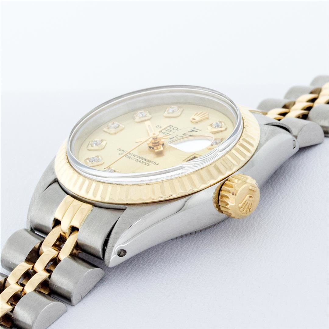 One Ladies Two Tone Rolex Datejust Polished, Serviced & Electronically Tested, Yellow Gold & Stainless Steel Case: 26mm, Yellow Gold Crown, Bezel: Yellow Gold Fluted Bezel. Custom Crystal: New Acrylic Cyclops Lens. Custom Hands: New Luminescent Hands. Movement: Automatic Winding Movement. Custom Dial: Champagne With Diamond Hour Markers, Diamond Count: 10 Diamonds In Dial, Color: G to H, Clarity: VS2-SI1. Date Window: 3 O'Clock Position Date Display, Model: Datejust. Condition: G-6 Extra Fine. Bracelet: Two Tone Yellow Gold & Stainless Steel Jubilee. Bright Polish. 6.0 Inch Length, Adjustable. Standard Clasp, With Rolex Logo. This Watch Has Been Serviced Time Tested And Is In Excellent Condition It Is Free Of All Scratches And Dents.
