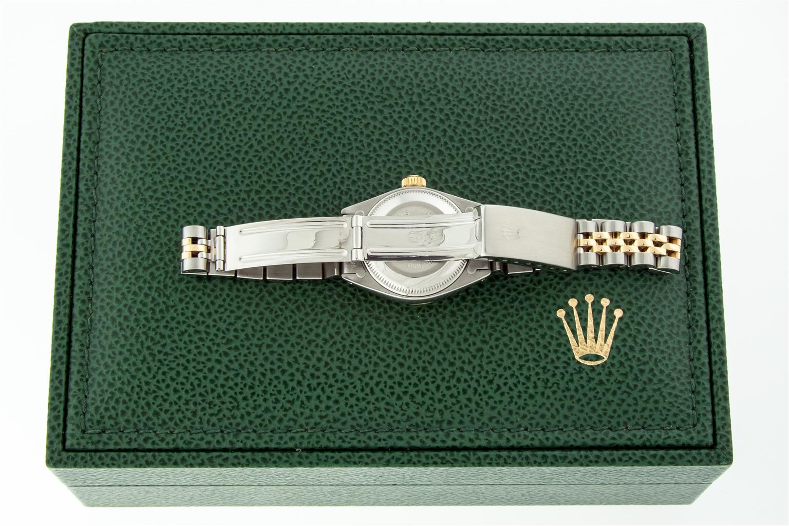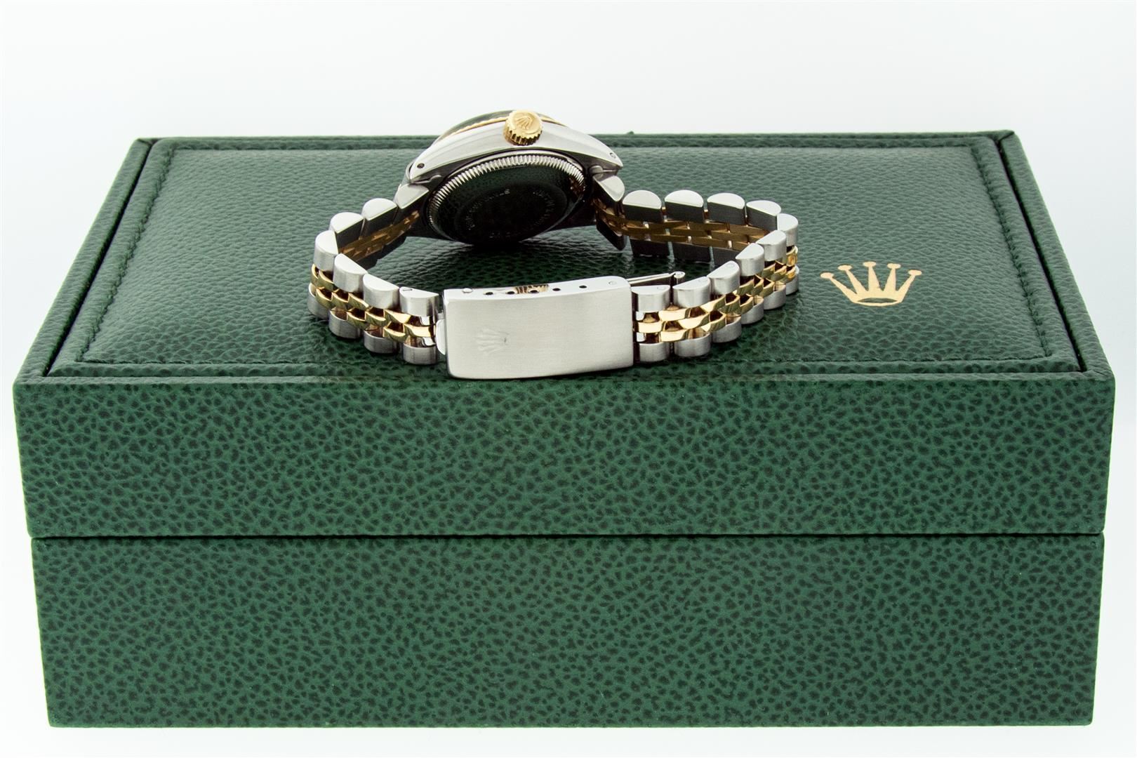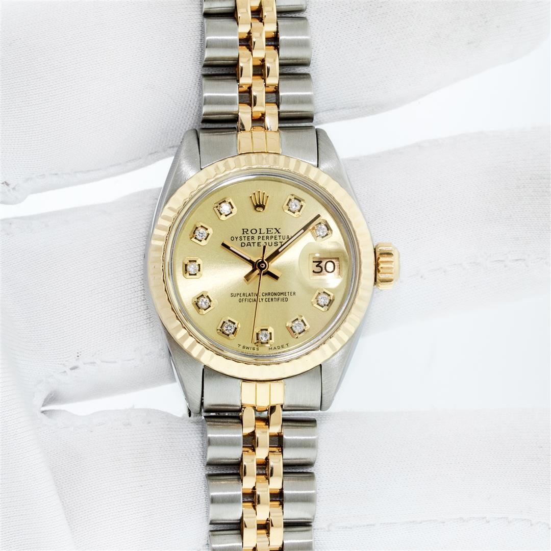 One Ladies Pre Owned Two Tone Rolex Datejust Polished, Serviced & Electronically Tested, Yellow Gold & Stainless Steel Case: 26mm, Yellow Gold Crown, Rolex Bezel: Rolex Yellow Gold Fluted Bezel. Custom Crystal: New Acrylic Cyclops Lens. Custom Hands: New Luminescent Hands. Rolex Movement: Automatic Winding Movement. Custom Dial: Refinished To Champagne With Diamond Hour Markers, Diamond Count: 10 Diamonds In Dial, Color: G to H, Clarity: VS2-SI1. Date Window: 3 O'Clock Position Date Display, Model: Datejust. Condition: G-6 Extra Fine. Rolex Bracelet: Two Tone Yellow Gold & Stainless Steel Jubilee Band. Bright Polish. 6.0 Inch Length, Adjustable. Standard Clasp, With Rolex Logo. This Watch Has Been Serviced Time Tested And Is In Excellent Condition It Is Free Of All Scratches And Dents. This Watch Comes With A Rolex Box.