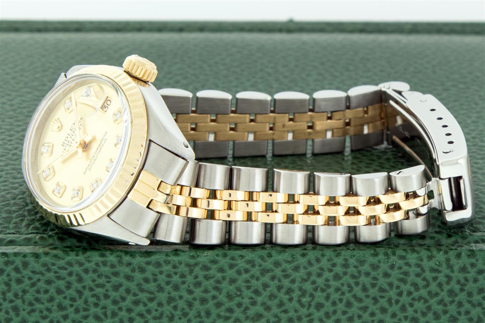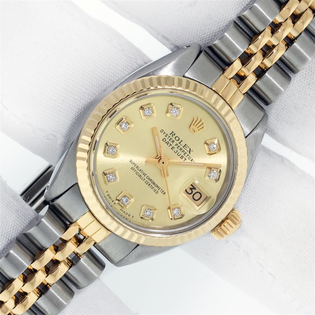 One Ladies Pre Owned Two Tone Rolex Datejust Polished, Serviced & Electronically Tested, Yellow Gold & Stainless Steel Case: 26mm, Yellow Gold Crown, Rolex Bezel: Rolex Yellow Gold Fluted Bezel. Custom Crystal: New Acrylic Cyclops Lens. Custom Hands: New Luminescent Hands. Rolex Movement: Automatic Winding Movement. Custom Dial: Refinished To Champagne With Diamond Hour Markers, Diamond Count: 10 Diamonds In Dial, Color: G to H, Clarity: VS2-SI1. Date Window: 3 O'Clock Position Date Display, Model: Datejust. Condition: G-6 Extra Fine. Rolex Bracelet: Two Tone Yellow Gold & Stainless Steel Jubilee Band. Bright Polish. 6.0 Inch Length, Adjustable. Standard Clasp, With Rolex Logo. This Watch Has Been Serviced Time Tested And Is In Excellent Condition It Is Free Of All Scratches And Dents. This Watch Comes With A Rolex Box.