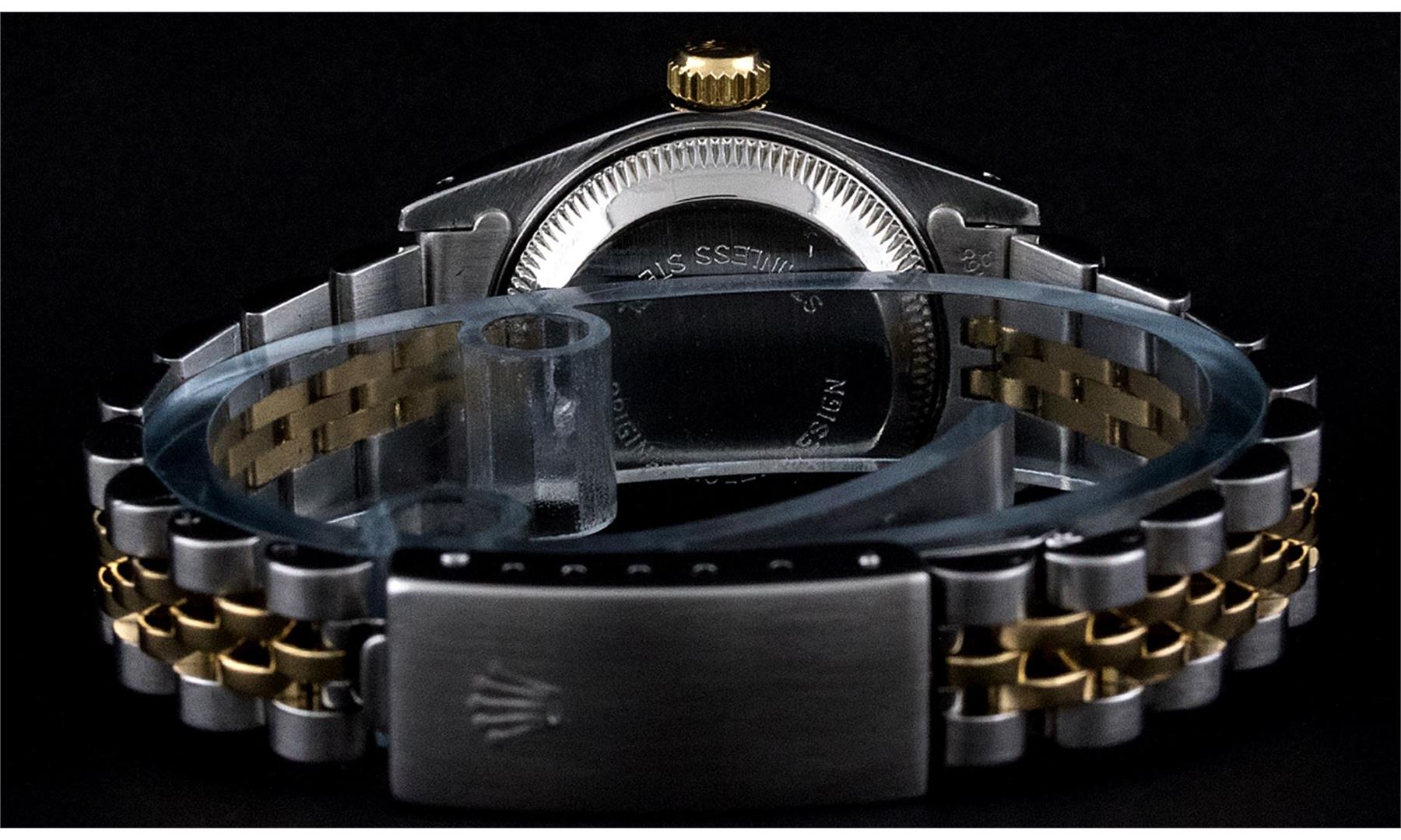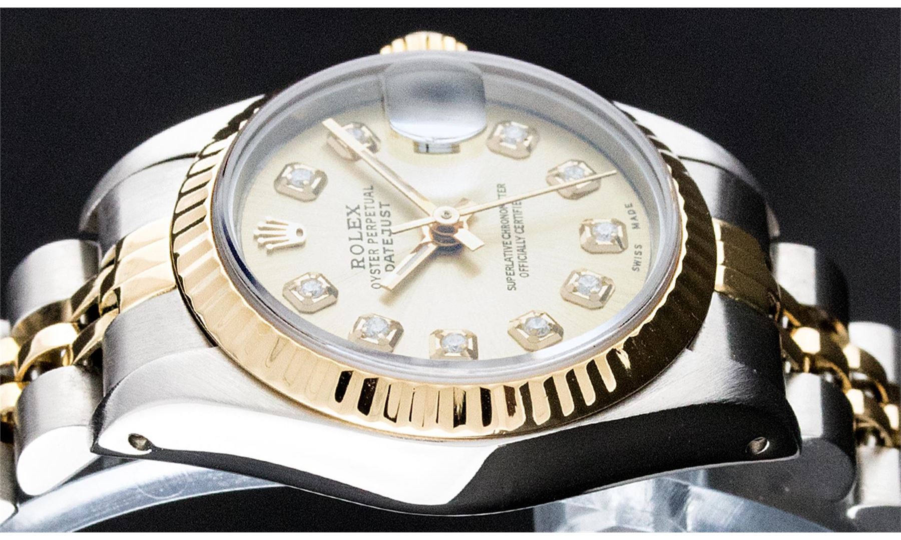 One Ladies Two Tone Rolex Datejust Polished, Serviced & Electronically Tested, Yellow Gold & Stainless Steel Case: 26mm, Yellow Gold Crown, Bezel: Yellow Gold Fluted Bezel. Custom Crystal: New Acrylic Cyclops Lens. Custom Hands: New Luminescent Hands. Movement: Automatic Winding Movement. Custom Dial: Champagne With Diamond Hour Markers, Diamond Count: 10 Diamonds In Dial, Color: G to H, Clarity: VS2-SI1. Date Window: 3 O'Clock Position Date Display, Model: Datejust. Condition: G-6 Extra Fine. Bracelet: Two Tone Yellow Gold & Stainless Steel Jubilee. Bright Polish. 6.0 Inch Length, Adjustable. Standard Clasp, With Rolex Logo. This Watch Has Been Serviced Time Tested And Is In Excellent Condition It Is Free Of All Scratches And Dents.
