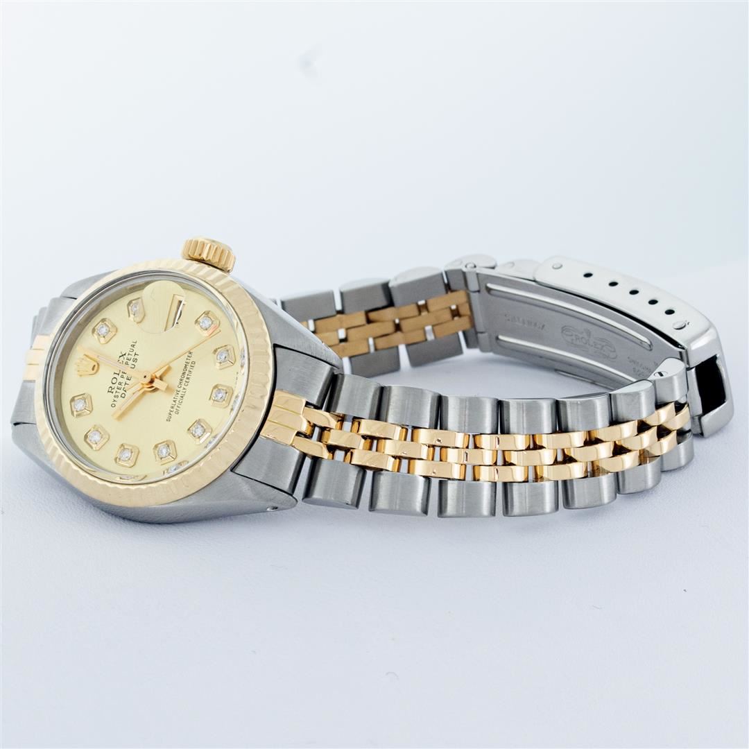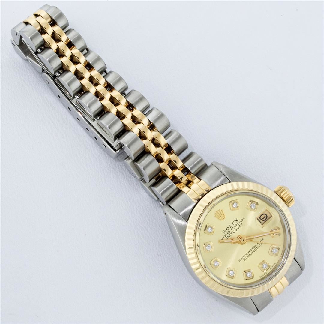 One Ladies Two Tone Rolex Datejust Polished, Serviced & Electronically Tested, Yellow Gold & Stainless Steel Case: 26mm, Yellow Gold Crown, Bezel: Yellow Gold Fluted Bezel. Custom Crystal: New Acrylic Cyclops Lens. Custom Hands: New Luminescent Hands. Movement: Automatic Winding Movement. Custom Dial: Champagne With Diamond Hour Markers, Diamond Count: 10 Diamonds In Dial, Color: G to H, Clarity: VS2-SI1. Date Window: 3 O'Clock Position Date Display, Model: Datejust. Condition: G-6 Extra Fine. Bracelet: Two Tone Yellow Gold & Stainless Steel Jubilee. Bright Polish. 6.0 Inch Length, Adjustable. Standard Clasp, With Rolex Logo. This Watch Has Been Serviced Time Tested And Is In Excellent Condition It Is Free Of All Scratches And Dents.