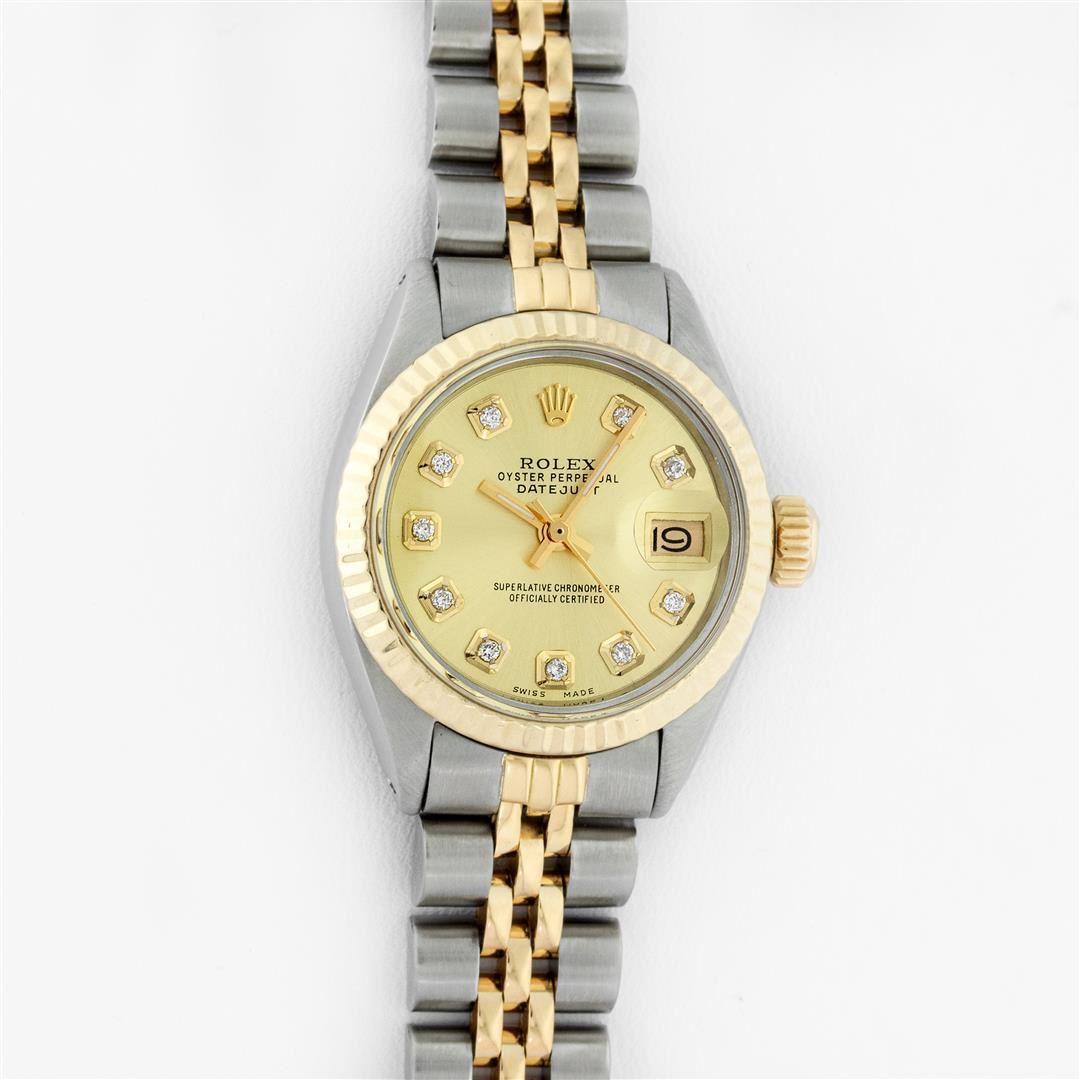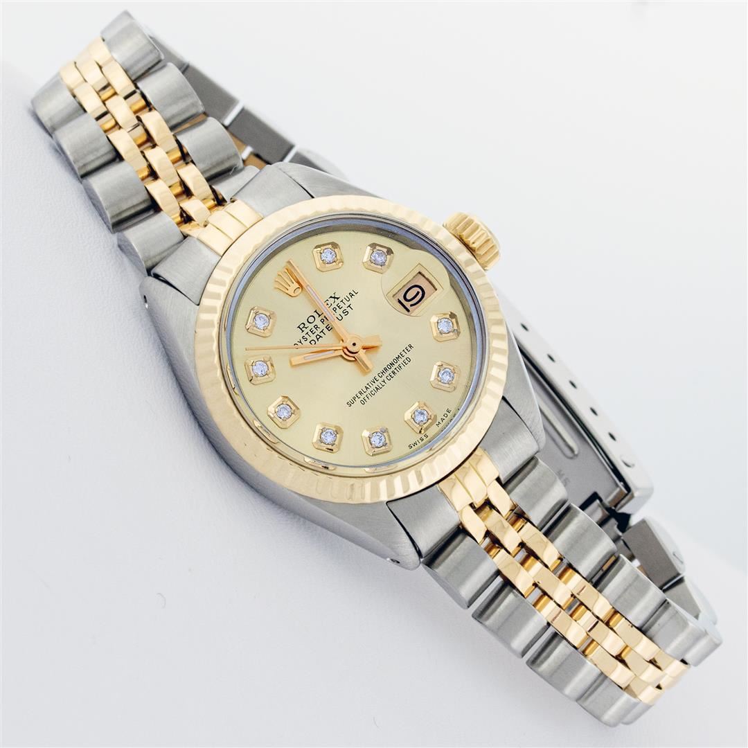 One Ladies Two Tone Rolex Datejust Polished, Serviced & Electronically Tested, Yellow Gold & Stainless Steel Case: 26mm, Yellow Gold Crown, Bezel: Yellow Gold Fluted Bezel. Custom Crystal: New Acrylic Cyclops Lens. Custom Hands: New Luminescent Hands. Movement: Automatic Winding Movement. Custom Dial: Champagne With Diamond Hour Markers, Diamond Count: 10 Diamonds In Dial, Color: G to H, Clarity: VS2-SI1. Date Window: 3 O'Clock Position Date Display, Model: Datejust. Condition: G-6 Extra Fine. Bracelet: Two Tone Yellow Gold & Stainless Steel Jubilee. Bright Polish. 6.0 Inch Length, Adjustable. Standard Clasp, With Rolex Logo. This Watch Has Been Serviced Time Tested And Is In Excellent Condition It Is Free Of All Scratches And Dents.