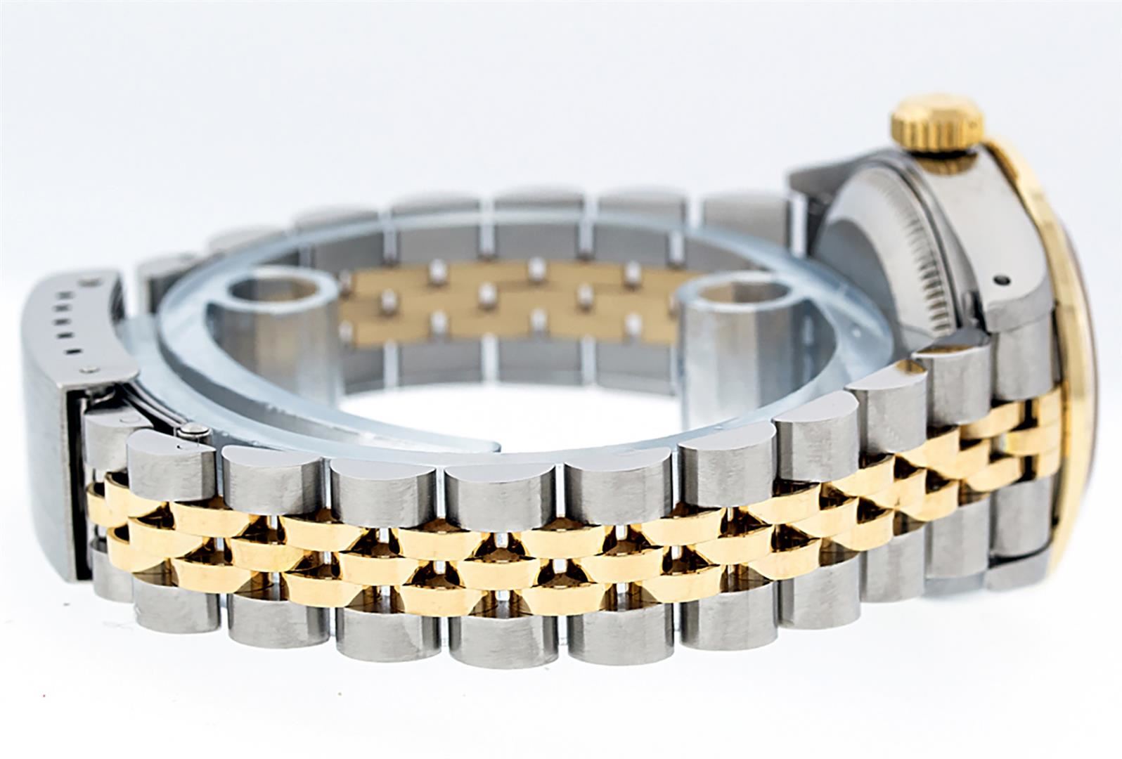 One Ladies Pre Owned Two Tone Rolex Datejust Polished, Serviced & Electronically Tested, Yellow Gold & Stainless Steel Case: 26mm, Yellow Gold Crown, Custom Bezel: New 18K New Yellow Gold Beadset Diamond Bezel, Diamond Count: 32 Diamonds On Bezel, Carat,