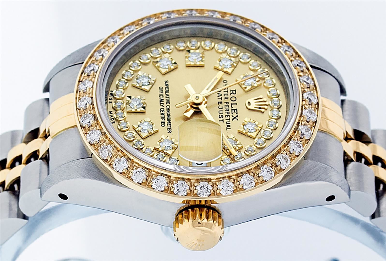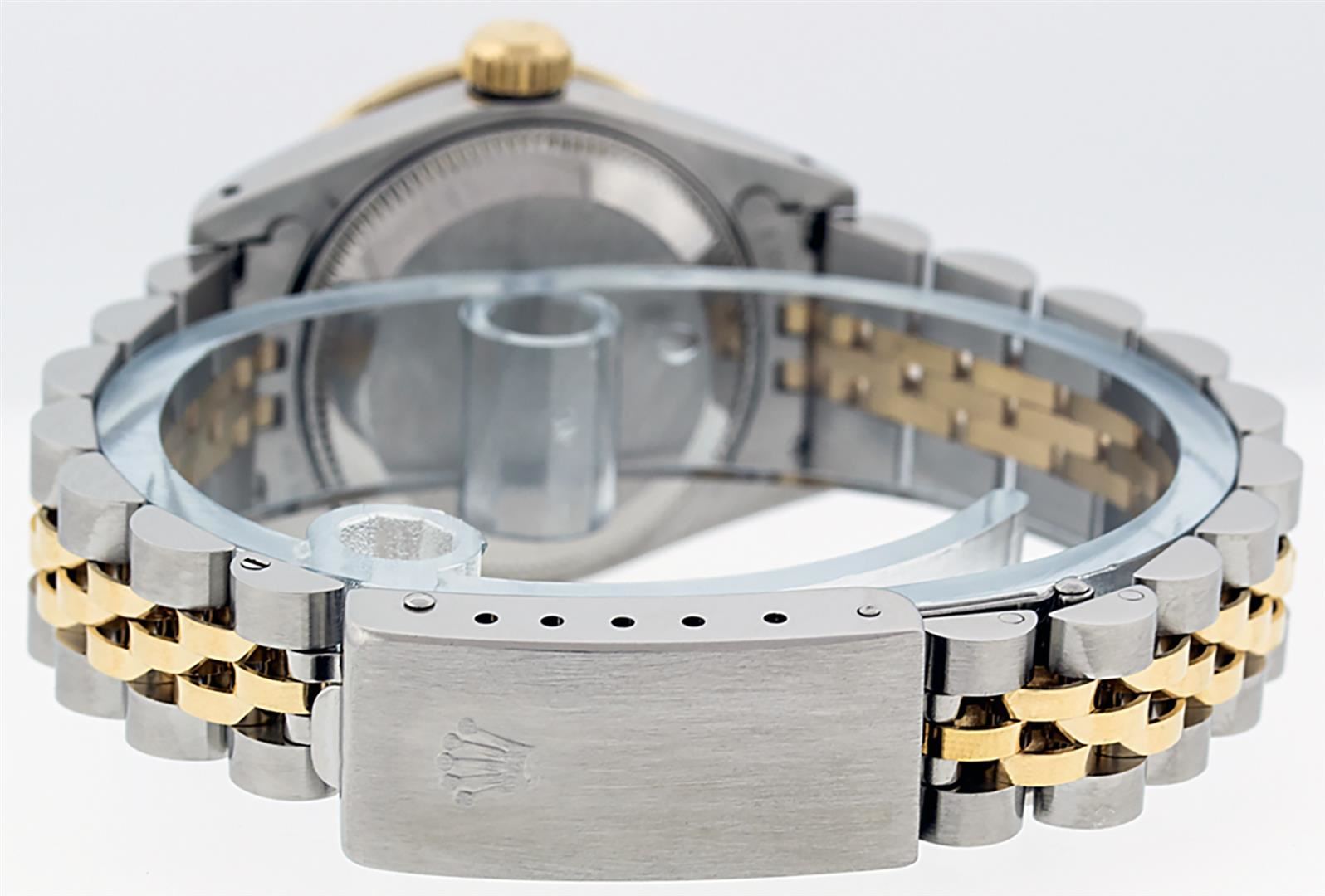 One Ladies Pre Owned Two Tone Rolex Datejust Polished, Serviced & Electronically Tested, Yellow Gold & Stainless Steel Case: 26mm, Yellow Gold Crown, Custom Bezel: New 18K New Yellow Gold Beadset Diamond Bezel, Diamond Count: 32 Diamonds On Bezel, Carat,