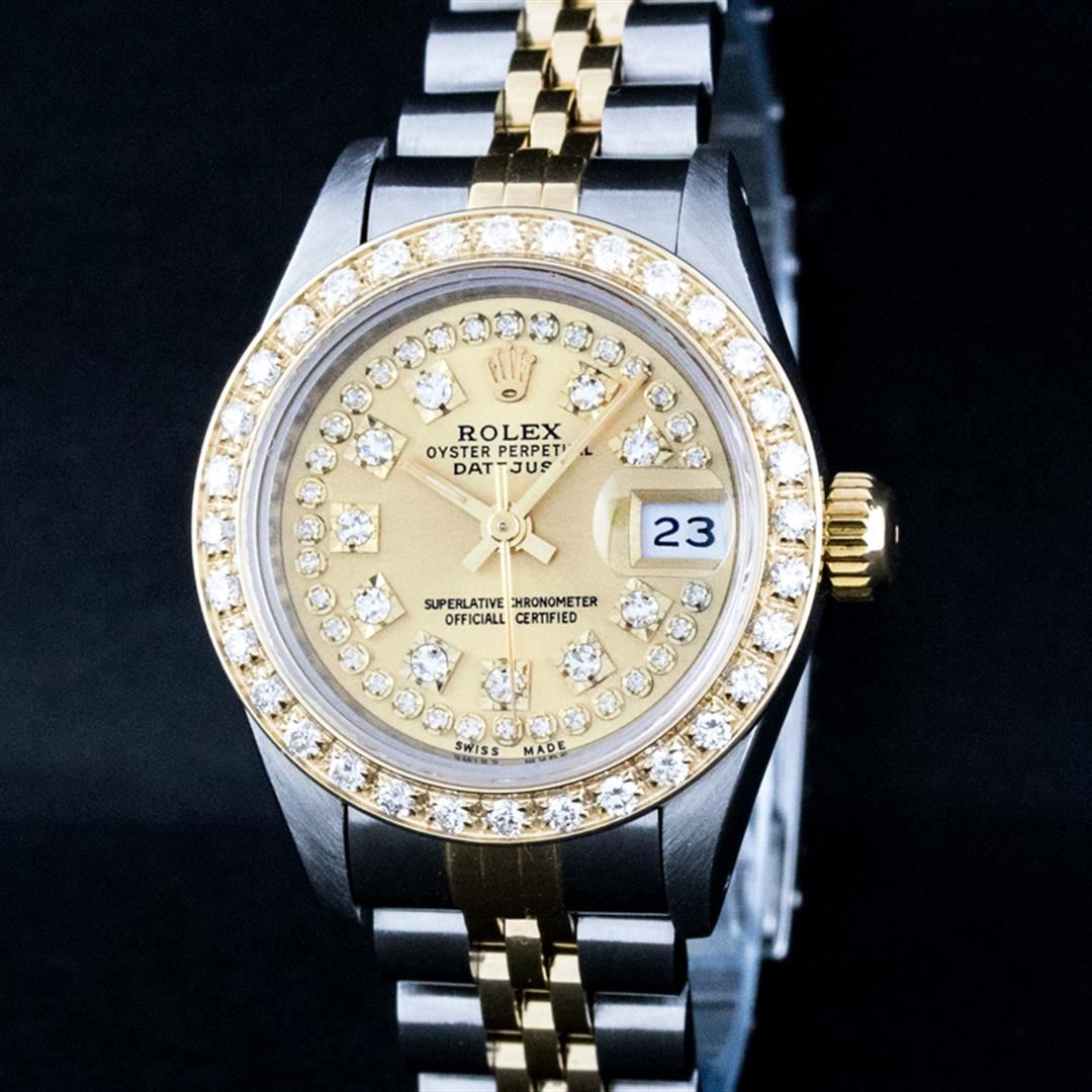 One Ladies Pre Owned Two Tone Rolex Datejust Polished, Serviced & Electronically Tested, Yellow Gold & Stainless Steel Case: 26mm, Yellow Gold Crown, Custom Bezel: New 18K New Yellow Gold Beadset Diamond Bezel, Diamond Count: 32 Diamonds On Bezel, Carat,