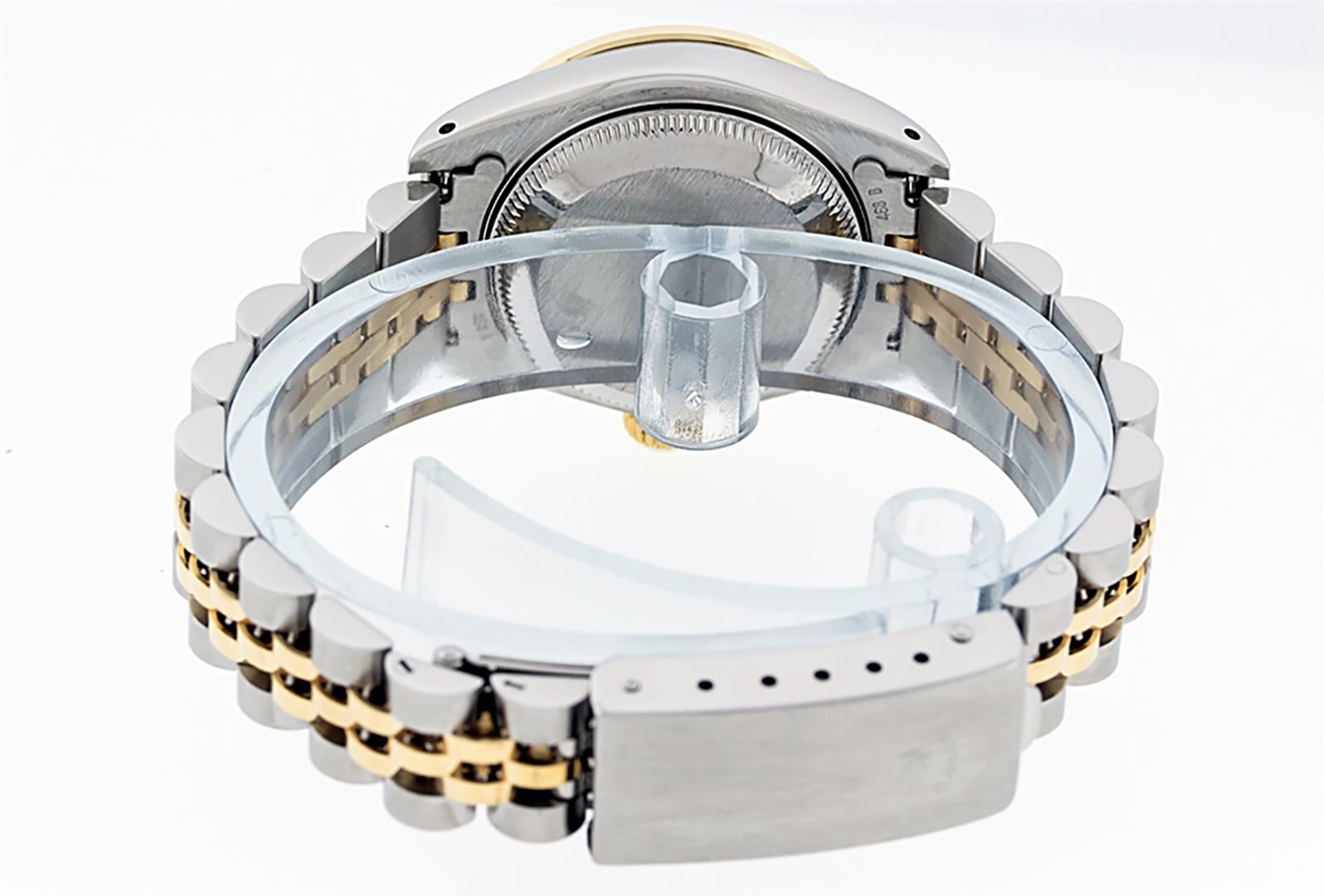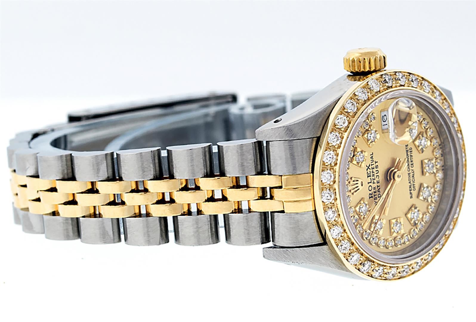 One Ladies Pre Owned Two Tone Rolex Datejust Polished, Serviced & Electronically Tested, Yellow Gold & Stainless Steel Case: 26mm, Yellow Gold Crown, Custom Bezel: New 18K New Yellow Gold Beadset Diamond Bezel, Diamond Count: 32 Diamonds On Bezel, Carat, Clarity: SI-VS, Color: G to H. Custom Crystal: New Sapphire With Date Window. Custom Hands: New Luminescent Hands. Rolex Movement: Automatic Winding Movement. Custom Dial: Refinished To Champagne With Custom Added Diamond Hour Markers, Diamond Count: 43 Diamonds In Dial, Clarity: SI-VS, Color: G to H. Date Window: 3 Oclock Position Date Display, Model: Datejust. Condition: G-6 Extra Fine. Rolex Bracelet: Two Tone Yellow Gold & Stainless Steel Jubilee Band. Bright Polish. 6.0 Inch Length, Adjustable. Standard Clasp, With Rolex Logo. This Watch Has Been Serviced Time Tested And Is In Excellent Condition It Is Free Of All Scratches And Dents.