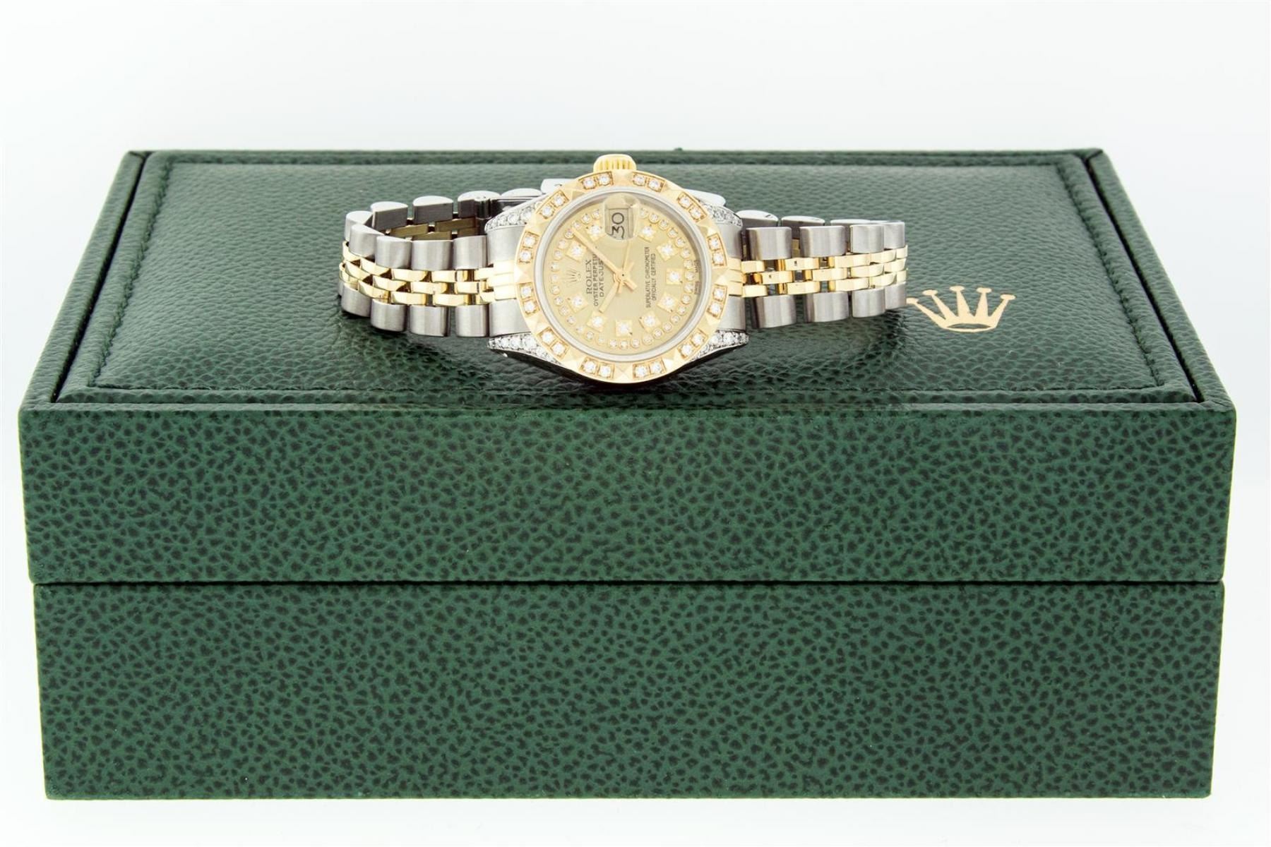 One Ladies Two Tone Rolex Datejust Polished, Serviced & Electronically Tested, Yellow Gold & Stainless Steel Case: 26mm, Yellow Gold Crown, Diamond Lugs: 24 Diamonds On Lugs, Clarity: SI-VS, Color: G to H, Clarity SI-VS. Custom Bezel: New 18K Yellow Gold Pyramid Diamond Bezel, Diamond Count: 24 Diamonds, Total Weight For Bezel .50 Carat, Clarity: SI-VS, Color: G to H. Custom Crystal: New Scratch Resistant Synthetic Sapphire Cyclops Lens. Custom Hands: New Luminescent Hands. Movement: Automatic Winding Movement. Custom Dial: Champagne With Single Cut Diamond Hour Markers, Diamond Count: 43 Diamonds In Dial, Clarity: SI-VS, Color: G to H. Date Window: 3 O'Clock Position Date Display, Model: Datejust. Condition: G-6 Extra Fine. Bracelet: Two Tone Yellow Gold & Stainless Steel Jubilee. Bright Polish. 6.0 Inch Length, Adjustable. Standard Clasp, With Rolex Logo. This Watch Has Been Serviced Time Tested And Is In Excellent Condition It Is Free Of All Scratches And Dents. This Watch Comes With A Rolex Box.
