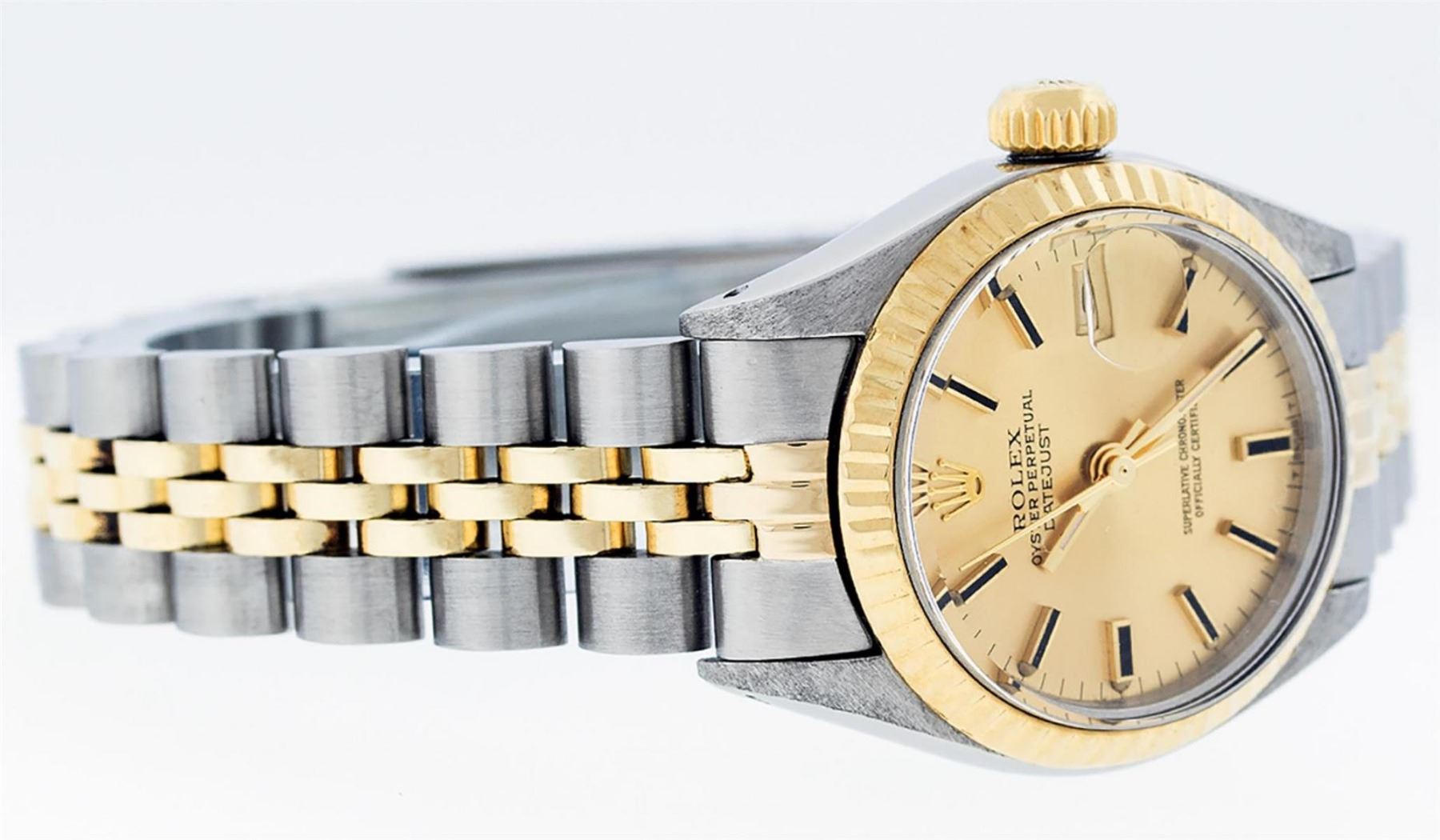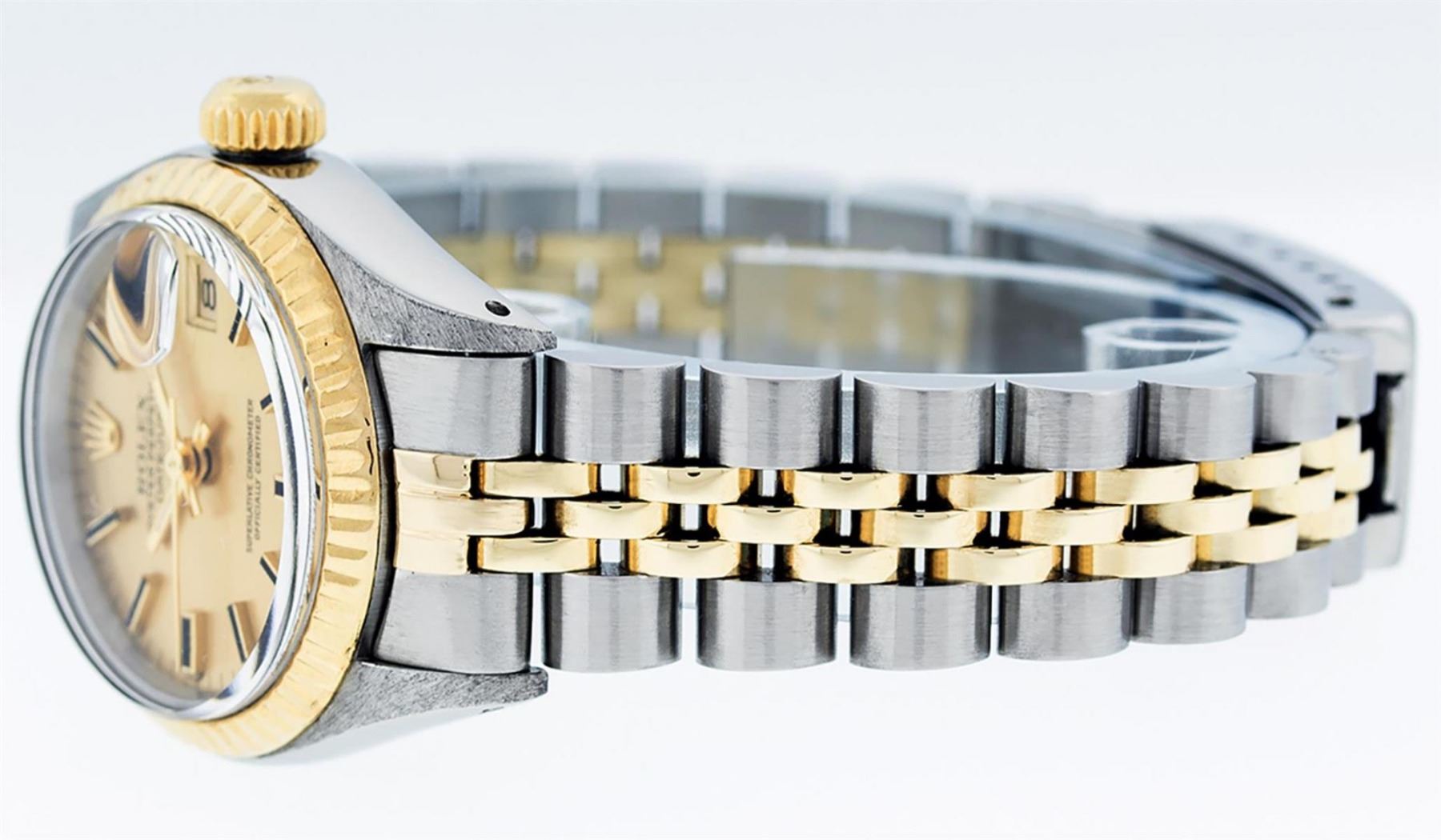 One Ladies Two Tone Rolex Datejust Polished, Serviced & Electronically Tested, Yellow Gold & Stainless Steel Case: 26mm, Yellow Gold Crown, Bezel: Yellow Gold Fluted Bezel. Custom Crystal: New Acrylic Cyclops Lens. Custom Hands: New Luminescent Hands. Movement: Automatic Winding Movement. Dial: Champagne Index With Dash Track & Lumi Dots. Date Window: 3 O'Clock Position Date Display, Model: Datejust. Condition: G-6 Extra Fine. Bracelet: Two Tone Yellow Gold & Stainless Steel Jubilee Band. Bright Polish. 6.0 Inch Length, Adjustable. Standard Clasp, With Rolex Logo. This Watch Has Been Serviced Time Tested And Is In Excellent Condition It Is Free Of All Scratches And Dents. This Watch Comes With A Rolex Box