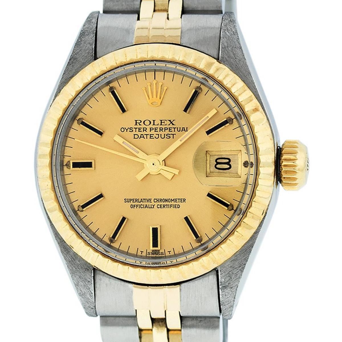 One Ladies Two Tone Rolex Datejust Polished, Serviced & Electronically Tested, Yellow Gold & Stainless Steel Case: 26mm, Yellow Gold Crown, Bezel: Yellow Gold Fluted Bezel. Custom Crystal: New Acrylic Cyclops Lens. Custom Hands: New Luminescent Hands. Movement: Automatic Winding Movement. Dial: Champagne Index With Dash Track & Lumi Dots. Date Window: 3 O'Clock Position Date Display, Model: Datejust. Condition: G-6 Extra Fine. Bracelet: Two Tone Yellow Gold & Stainless Steel Jubilee Band. Bright Polish. 6.0 Inch Length, Adjustable. Standard Clasp, With Rolex Logo. This Watch Has Been Serviced Time Tested And Is In Excellent Condition It Is Free Of All Scratches And Dents. This Watch Comes With A Rolex Box