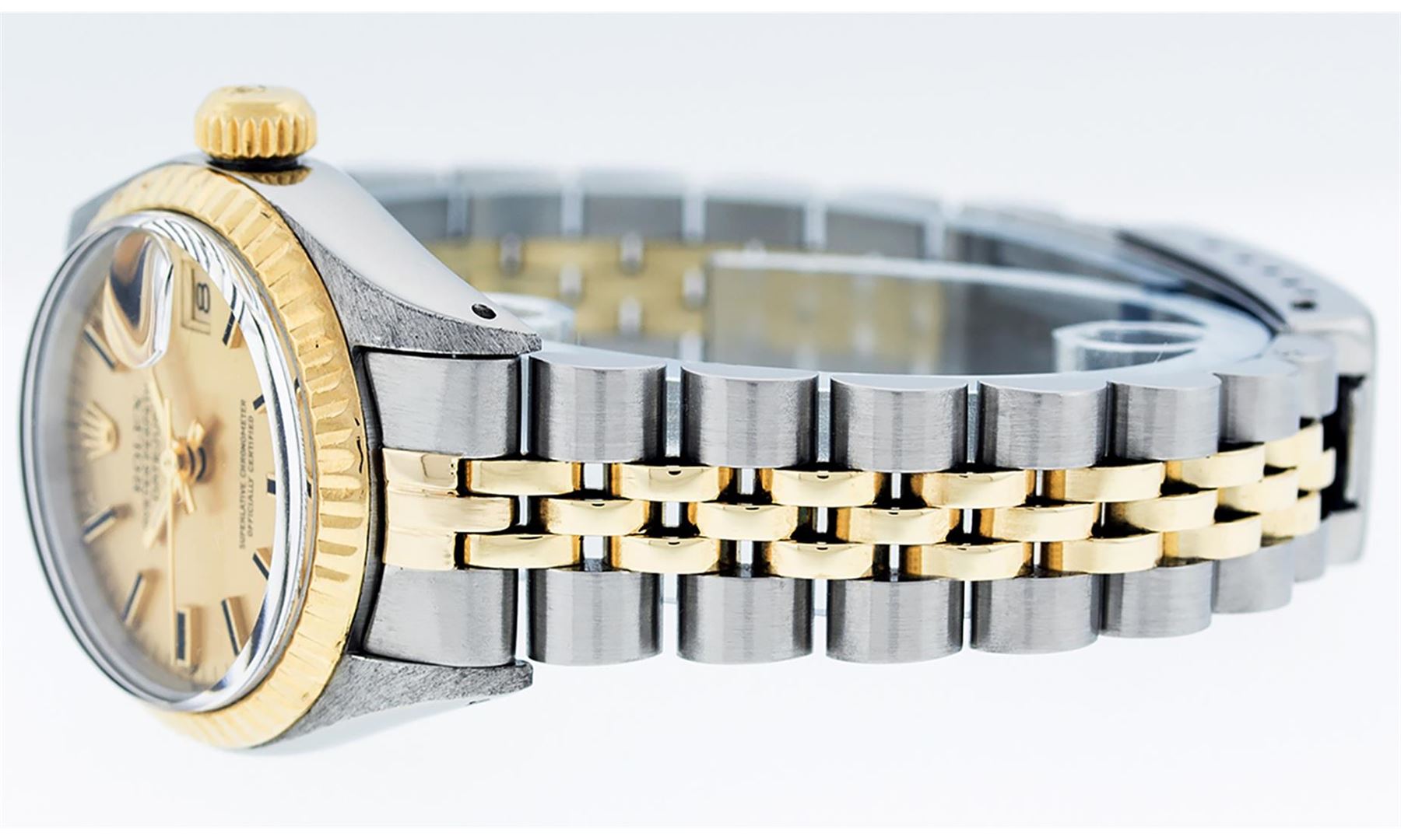 One Ladies Pre Owned Two Tone Rolex Datejust Polished, Serviced & Electronically Tested, Rolex Yellow Gold & Stainless Steel Case: 26mm, Rolex Yellow Gold Crown, Rolex Bezel: Yellow Gold Fluted Bezel. Custom Crystal: New Acrylic Cyclops Lens. Hands: New Luminescent Hands. Rolex Movement: Automatic Winding Movement. Rolex Dial: Champagne Index With Dash Track & Lumi Dots. Date Window: 3 O'Clock Position Date Display, Model: Datejust. Condition: G-6 Extra Fine. Rolex Bracelet: Two Tone Yellow Gold & Stainless Steel Jubilee Band. Bright Polish. 6.0 Inch Length, Adjustable. Standard Clasp, With Rolex Logo. This Watch Has Been Serviced Time Tested And Is In Excellent Condition It Is Free Of All Scratches And Dents.