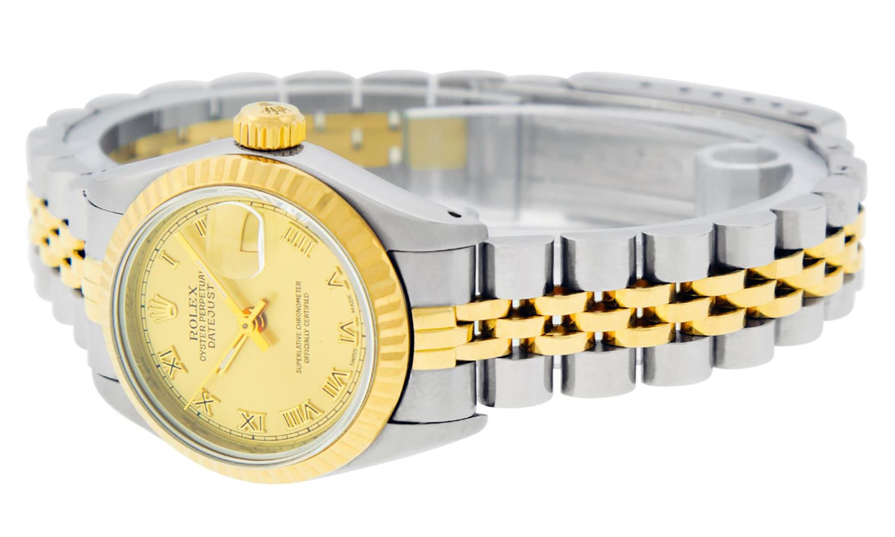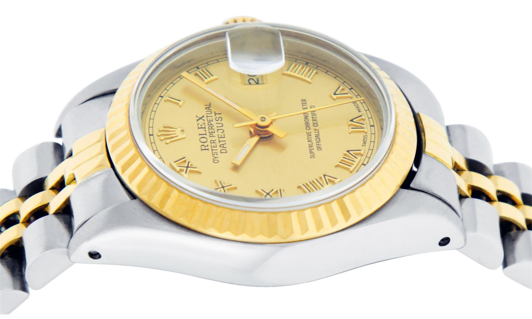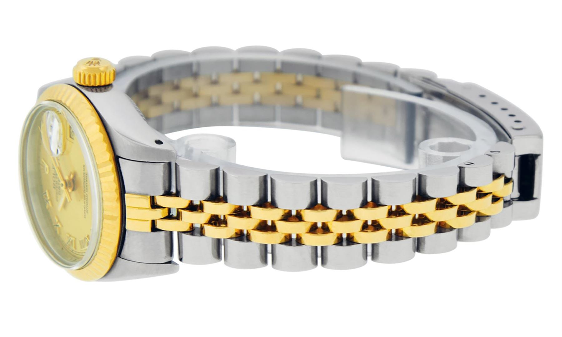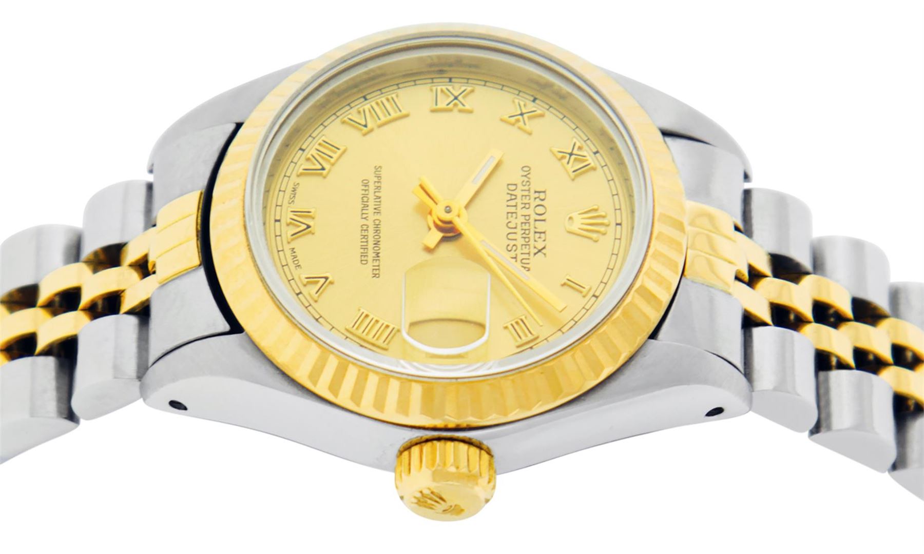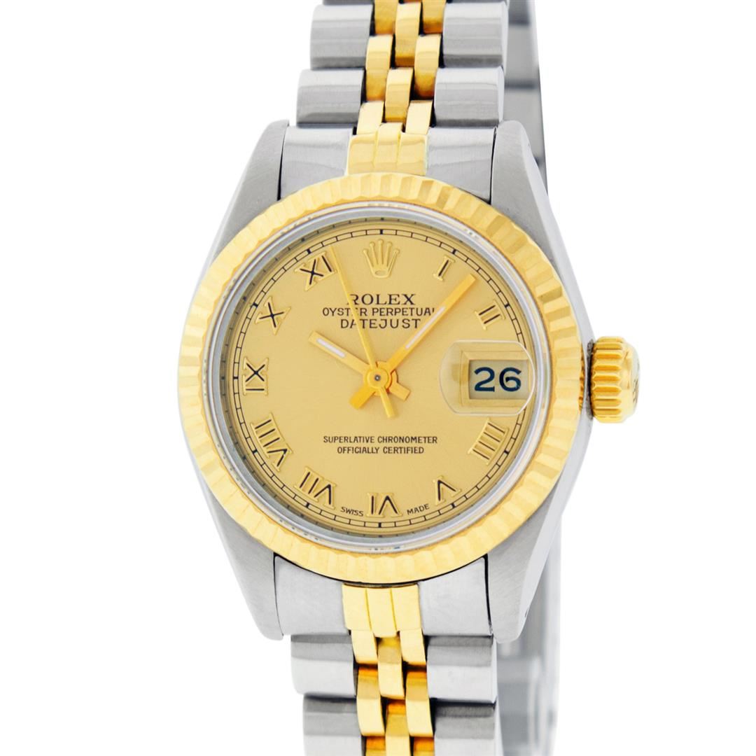 One Ladies Pre Owned Two Tone Rolex Datejust Polished, Serviced & Electronically Tested, Rolex Yellow Gold & Stainless Steel Case: 26mm, Rolex Yellow Gold Crown, Rolex Bezel: Yellow Gold Fluted Bezel. Custom Crystal: New Acrylic Cyclops Lens. Hands: Luminescent Hands. Rolex Movement: Automatic Winding Movement. Rolex Dial: Champagne Roman With Square Track. Date Window: 3 O'Clock Position Date Display, Model: Datejust. Condition: G-6 Extra Fine. Rolex Bracelet: Two Tone Yellow Gold & Stainless Steel Jubilee Band. Bright Polish. 6.0 Inch Length, Adjustable. Standard Clasp, With Rolex Logo. This Watch Has Been Serviced Time Tested And Is In Excellent Condition It Is Free Of All Scratches And Dents.