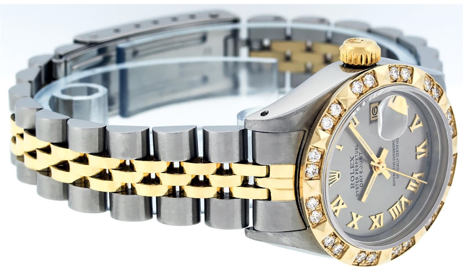 One Ladies Two Tone Rolex Datejust Polished, Serviced & Electronically Tested, Yellow Gold & Stainless Steel Case: 26mm, Yellow Gold Crown, Custom Bezel: New 18K Yellow Gold Pyramid Diamond Bezel, Diamond Count: 24 Diamonds In Bezel. Total Weight .50 Carat, Clarity: SI-VS, Color: G to H. Custom Crystal: New Scratch Resistant Synthetic Sapphire Cyclops Lens. Custom Hands: New Luminescent Hands. Movement: Automatic Winding Movement. Custom Dial: Slate Grey With Roman Hour Markers. Date Window: 3 O'Clock Position Date Display, Model: Datejust. Condition: G-6 Extra Fine The Watch Is In Very Good Condition Free Of All Scratches And Dents. Bracelet: Two Tone Yellow Gold & Stainless Steel Jubilee. Bright Polish. 6.0 Inch Length, Adjustable. Standard Clasp, With Rolex Logo. This Watch Has Been Serviced Time Tested And Is In Excellent Condition It Is Free Of All Scratches And Dents.